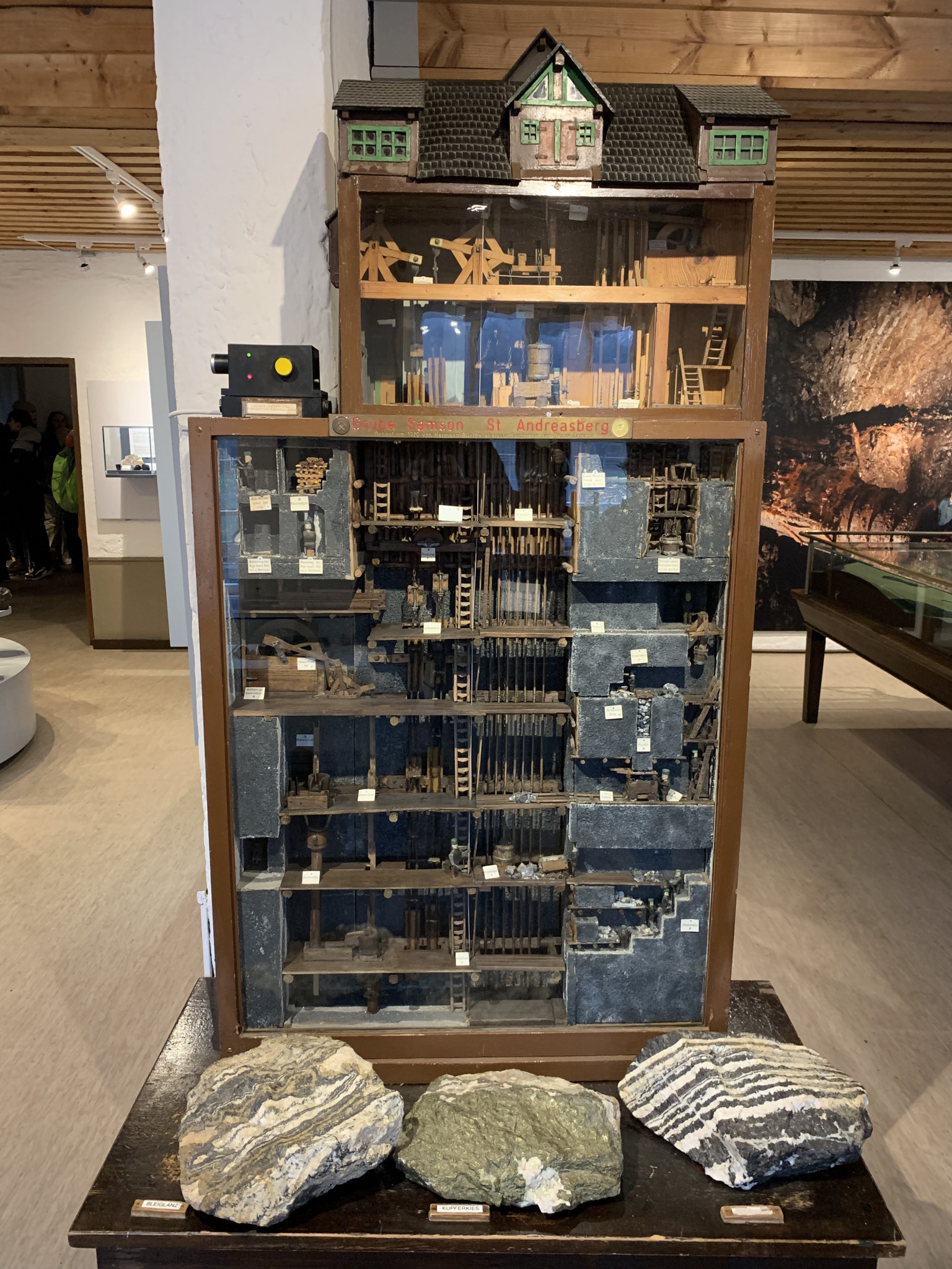 Am Dienstagmorgen sind alle Klassen gut gelaunt aufgewacht und es wurde sich für das Frühstück fertig gemacht. Um 08:00 Uhr begann das Frühstück, es gab jeden Morgen frische Brötchen und ein abwechslungsreiches Buffet. Leider musste jeder Schlange stehen, wie bei uns in der Mensa ;). Jede Klasse machte die gleichen Aktivitäten, nur immer an anderen Tagen. Also hat sich eine Klasse auf ein Geocaching-Abenteuer eingelassen, in dem man Rätsel mit Koordinaten bekam und ein Gerät, in dem man die Koordinaten eingeben konnte. Nach dem zweistündigen Abenteuer bekamen die Gruppen, die alle Rätsel lösen konnten, Gummibärchen als Belohnung. Dann wurde auch noch die Grube Samson besucht, das ist ein historisches Bergwerk, in dem sich die letzte funktionsfähige Fördermaschine der Welt befindet. Die 1837 in der Grube Samson errichtete Fahrkunst wurde früher durch Wasserkraft angetrieben. In dem Bergwerk wurde auch 1834 das Drahtseil erfunden.