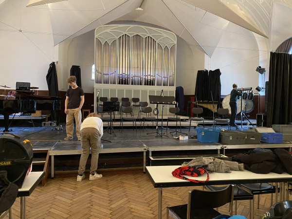 Wer werkelte denn da am Sonntagnachmittag in der Schule? Die Licht- und Tontechnik-AG war es, und sie hat in mehren Stunden die Aula für das Big-Band-Konzert morgen vorbereitet. Nun macht die Bühne schon richtig Vorfreude auf das bevorstehende Ereignis!