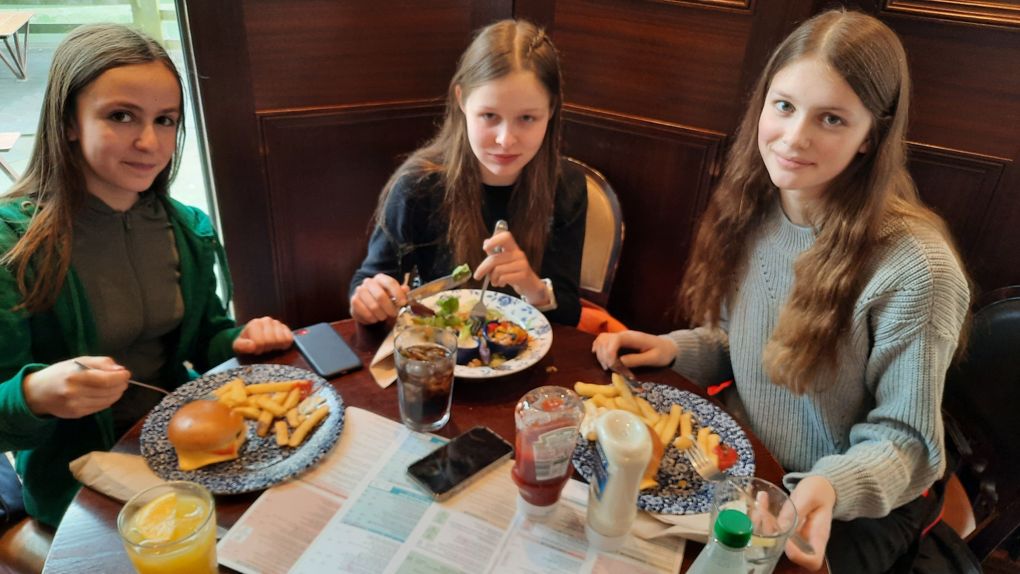 Als wir angekommen waren, mussten wir über ein paar sehr befahrene Kreuzungen laufen, bevor wir in einem Einkaufszentrum waren, wo sich auch das Kino befand. Dort haben wir dann auch alle anderen Mädchen getroffen und haben etwas gegessen.