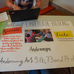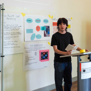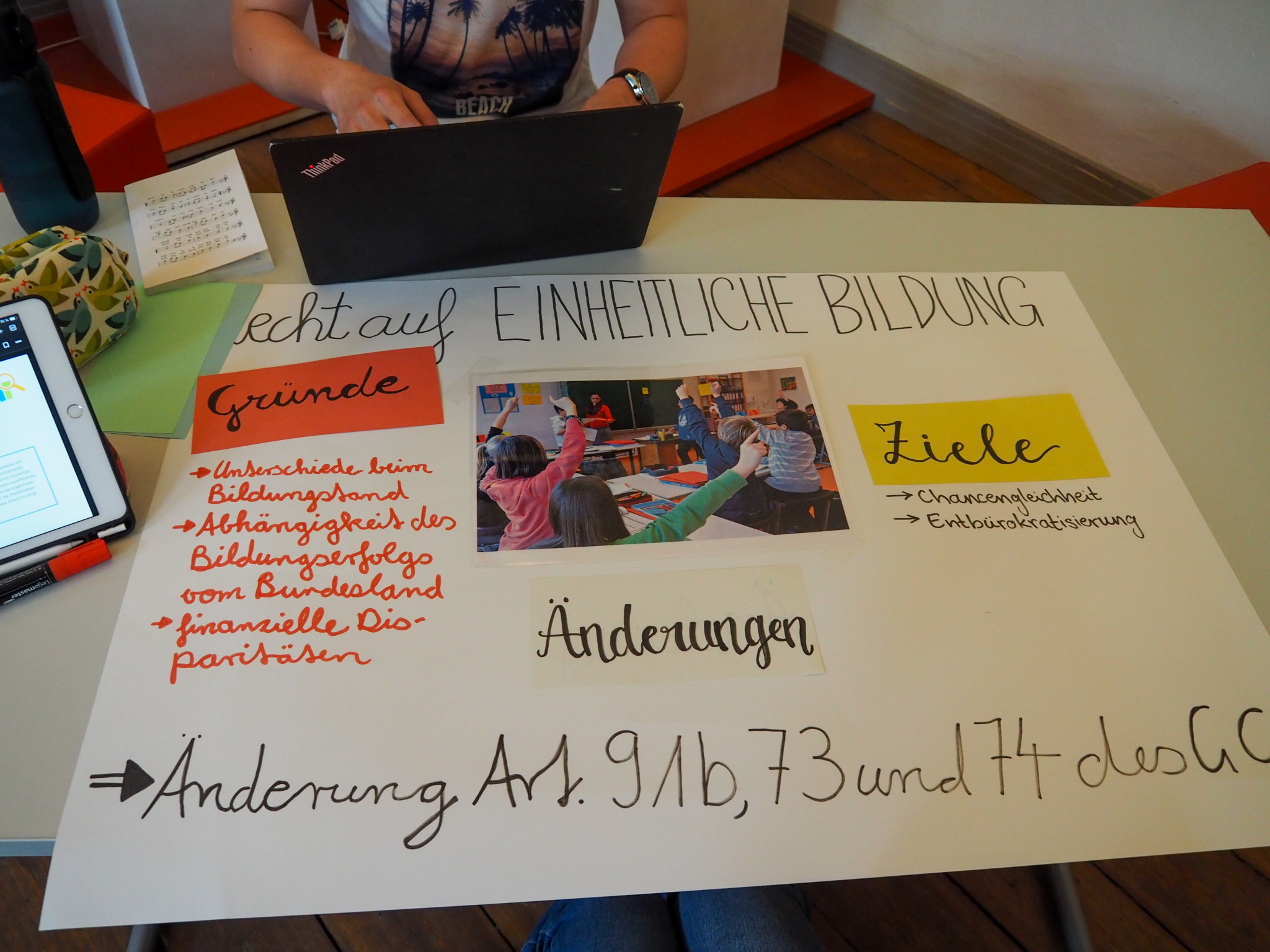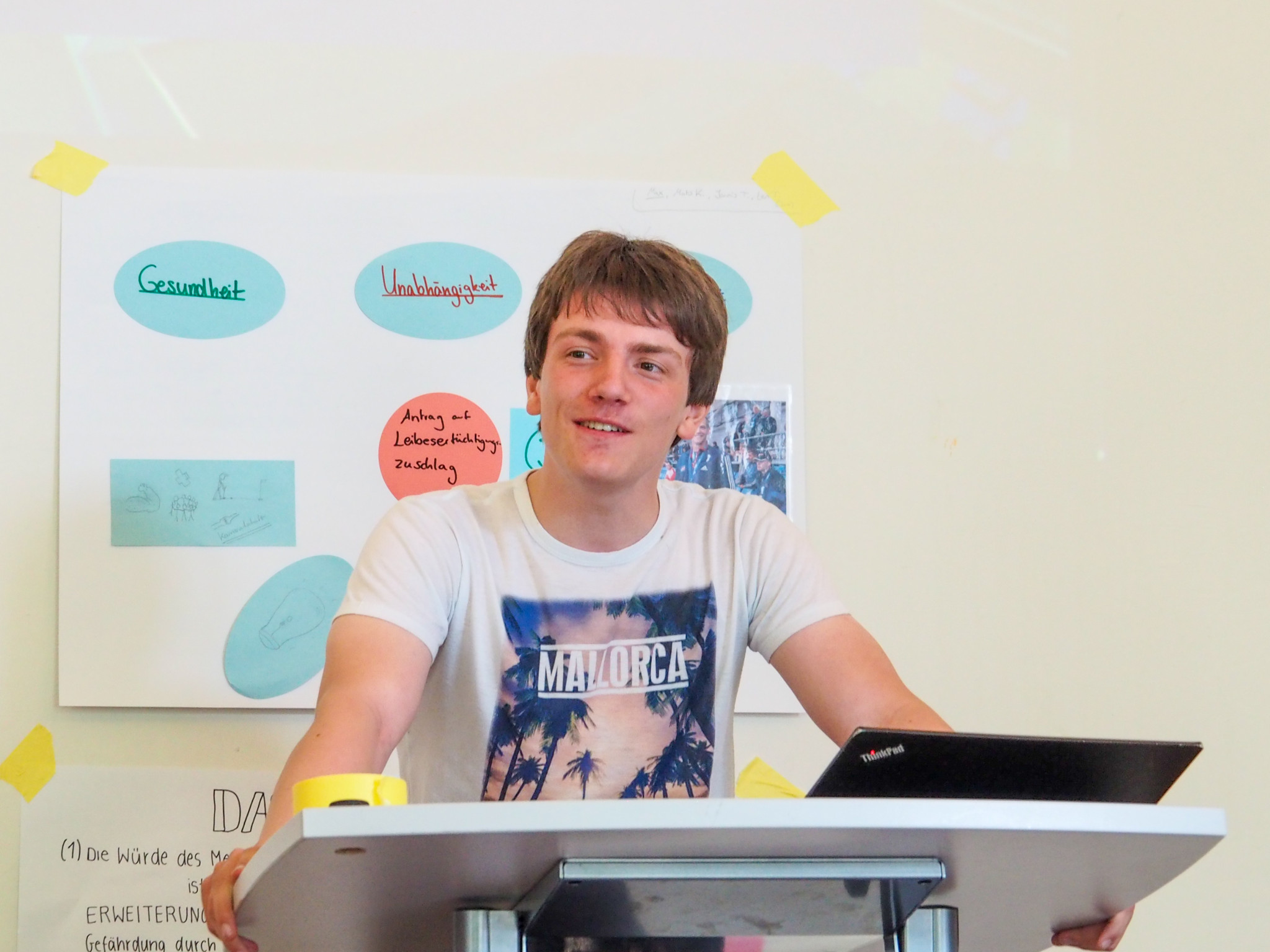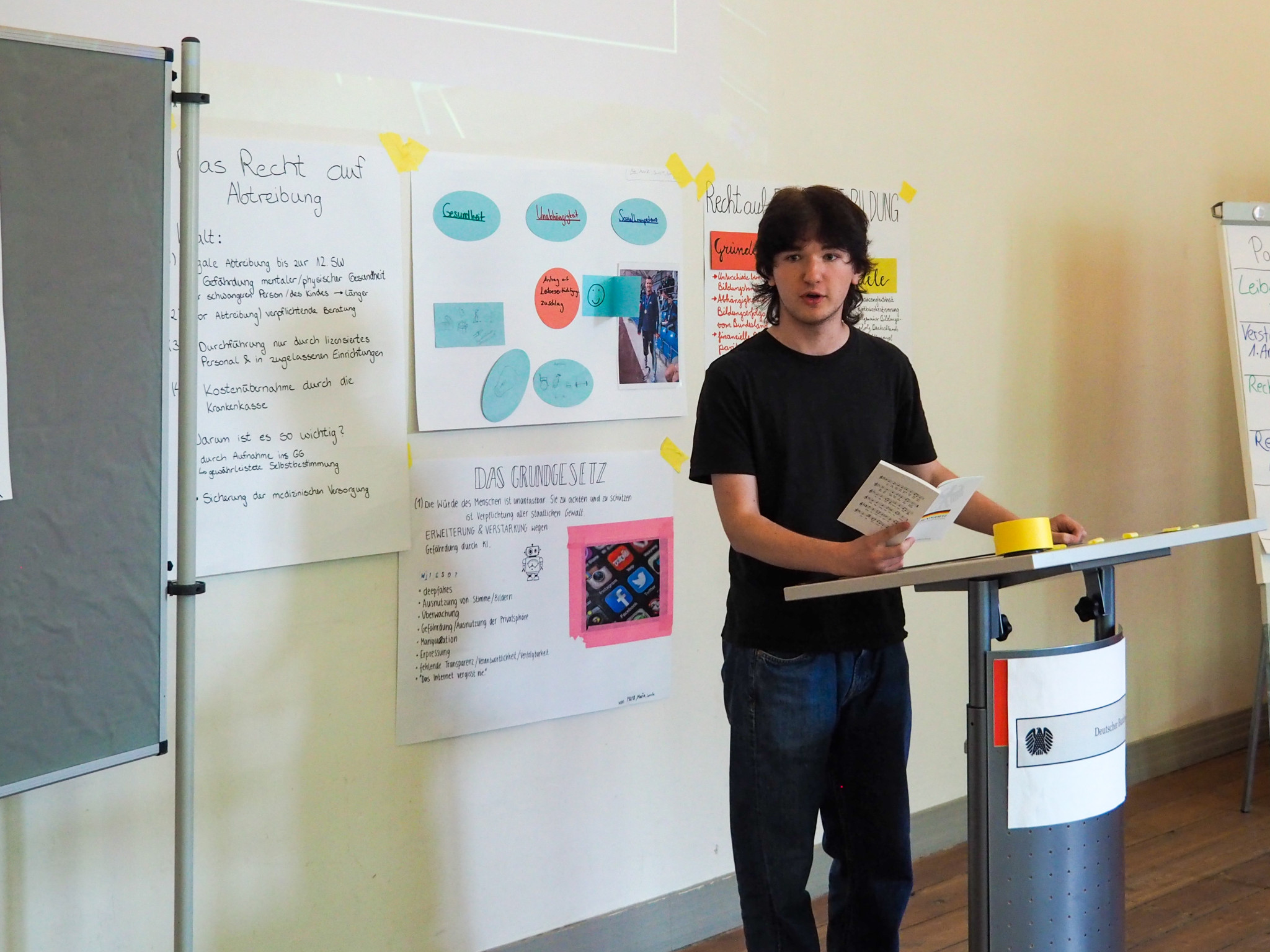 Im Anschluss ging es in in einen großen Raum und die Wände um uns herum wurden zum Bundestag und wir selber zu Bundestagabgeordneten. Denn so schön unser Grundgesetz auch ist, einige Themen und wichtige Inhalte sind noch nicht in dem weißen Büchlein mit dem grauen Adler vertreten, weshalb es unsere Aufgabe war, neue Gesetze zu entwerfen, die unserer Meinung nach definitiv im Grundgesetz vertreten sein sollten. In Gruppen brachten wir unser neues Gesetz zu Papier, welches wir nach einiger Zeit im Plenum vorstellten. Vor allem das Thema Umweltschutz sowie die Ressourcenschonung waren häufig vertreten, aber auch das Recht auf Sterbehilfe bot Stoff für Diskussionen.