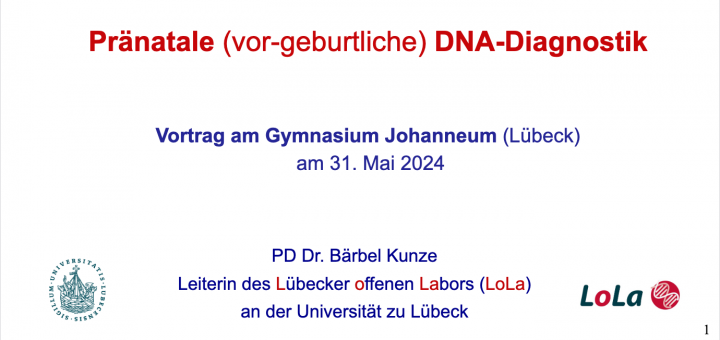 Das und noch vieles mehr haben wir von PD Dr. Bärbel Kunze erfahren, der Leiterin des LoLa (Lübecker offenes Labor). Wie auch in den letzten Jahren hat Frau Kunze für die Religionskurse aus dem Q1-Jahrgang einen Vortrag über Bioethik gehalten. Das Thema war pränatale, also vorgeburtliche DNA-Diagnostik.