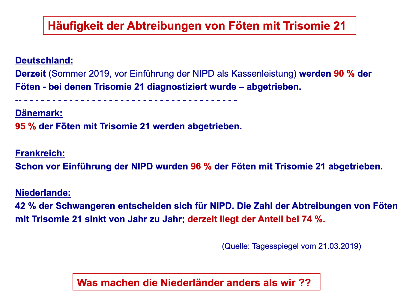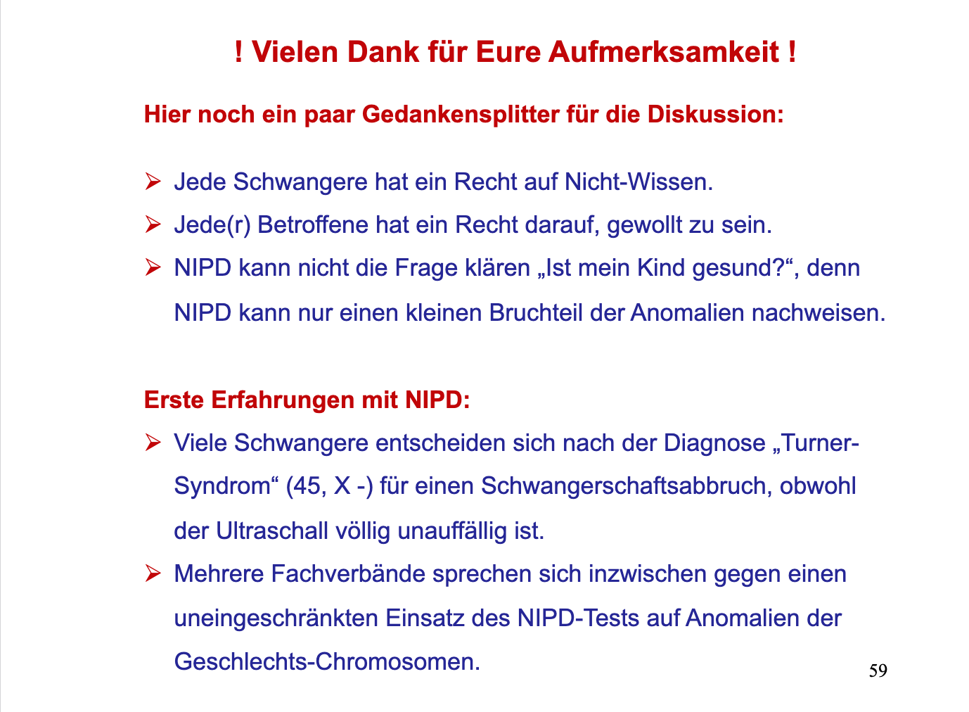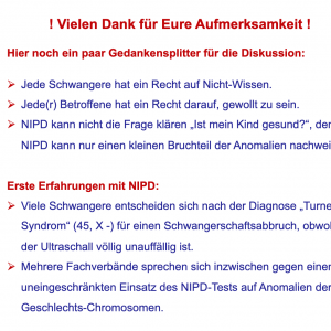 Vielen Dank an Frau Kunze für den sehr interessanten Vortrag! Es ist gut, dass wir uns mit solchen wichtigen Thema beschäftigen, damit hoffentlich auch in Deutschland die Wertschätzung für Menschen mit genetischen Besonderheiten steigt. Denn: „Down-Syndrom ist keine Krankheit“.