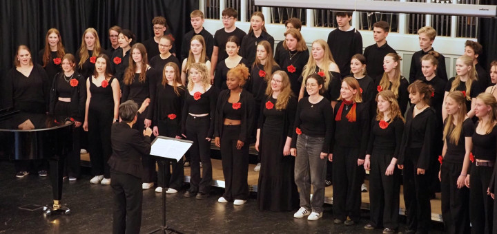 Den dritten Teil des Abends bestritt unser Oberstufenchor des Johanneums und fügte mit reinen a-cappella-Stücken wie „Verleih uns Frieden“ und „We shall walk through the valley in peace“ noch eine neue Klangfarbe hinzu. Das Lieblingsstück des Chores „We are the world“ mit Kathrin Maetzel am Flügel beendete diesen Teil, nachdem die Abiturient:innen bei diesem letzten Chorauftritt noch eine Rose zum Abschied bekamen.