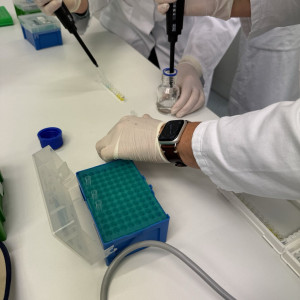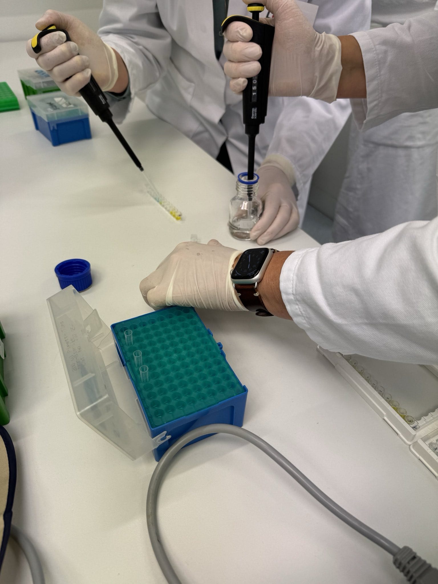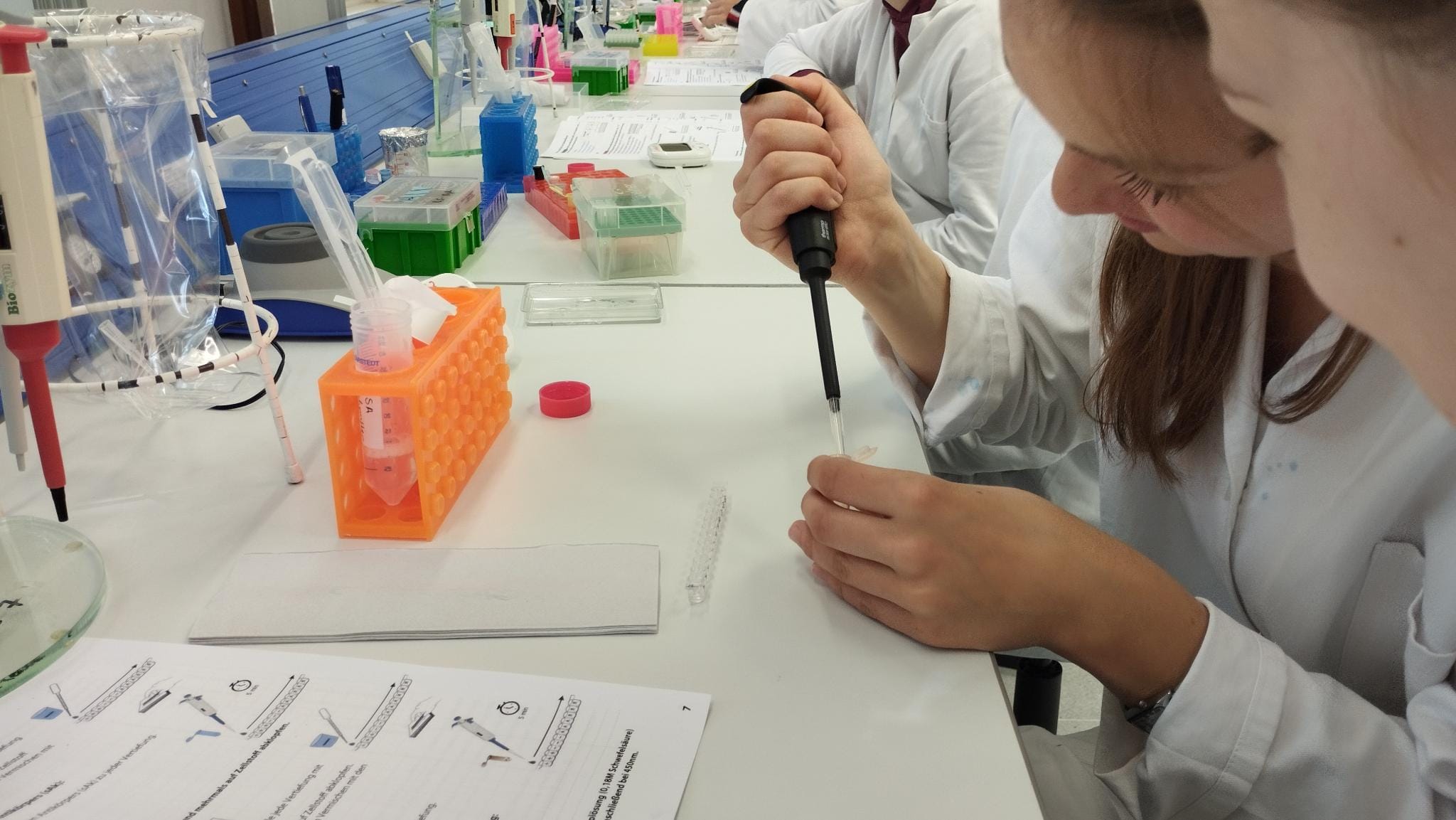Nachdem wir über das Vorwissen verfügten, hieß es endlich zur Sache kommen! Denn nun waren wir an der Reihe, einen ebensolchen Test durchzuführen mithilfe von eigens dafür angefertigten Antigenen. Mit einem konzentrierten Blick und den Pipetten in den Händen gezückt, arbeiteten wir wie echte Laborant:innen und vollführten unseren ersten eigenen ELIZA-Test.