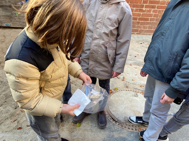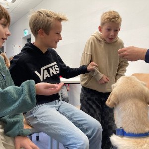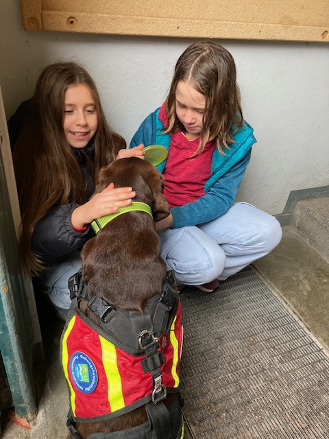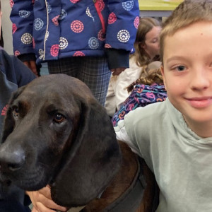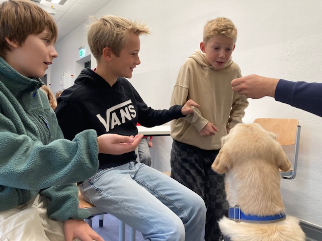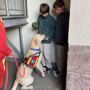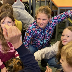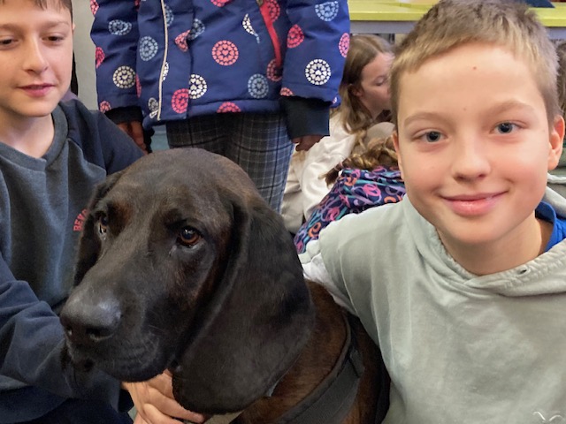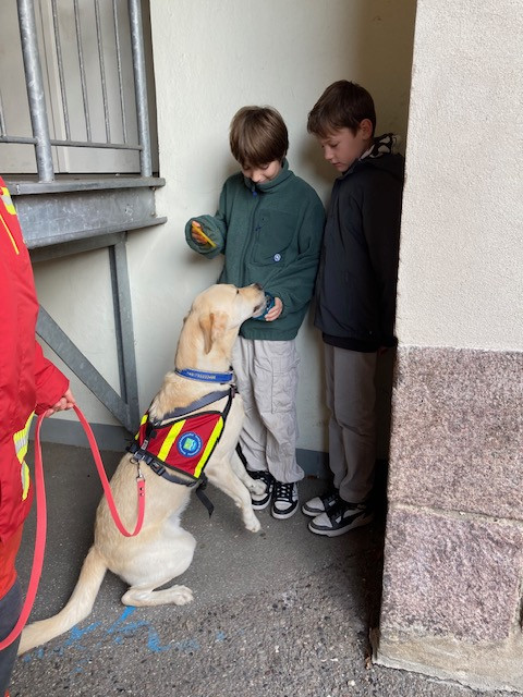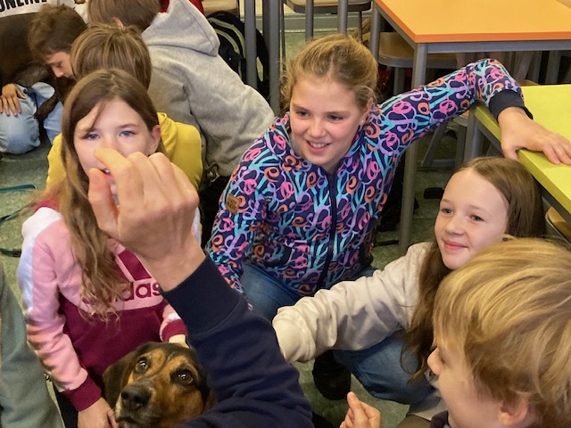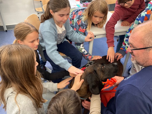 Anschließend sind die Man-Trailer mit ihren Hunden durch unsere Sitzreihen gegangen und wir durften eingeübte Tricks mit ihnen ausprobieren, Leckerlis verteilen, sehr viel streicheln und weitere Fragen stellen. Wir waren alle begeistert, dass wir so viel mit den Hunden spielen und sie so ausgiebig streicheln durften. Schließlich sind wir mit den aufgeregten Hunden und ihren sehr netten Besitzern nach draußen gegangen. Dort haben wir ein spannendes Versteckspiel mit den Hunden gespielt, bei dem sie versteckte Kinder finden mussten. Diese fanden sie, indem sie die Fährte von Gegenständen aufgenommen haben, die die Kinder vorher berührt hatten. Bei erfolgreicher Suche setzte sich der Hund vor das gesuchte Kind und bekam seine Belohnung. Das klappte sogar, als sich die ganze 5a in einer Reihe aufgestellt hat und Fiete vor dem richtigen Kind angehalten hat.