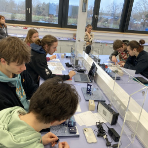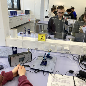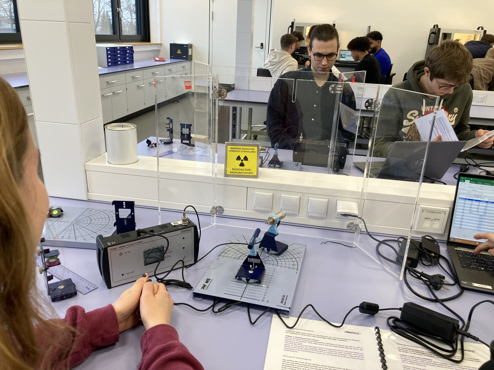 Neben einer großartigen Ausstellung, in der die komplexen Aufbauten der Anlage hervorragend anschaulich und mit jeder Menge Möglichkeiten zum Ausprobieren und Mitmachen dargestellt wurden, konnten die Schüler:innen im nagelneuen Schülerlabor Xcool Lab selbst experimentieren. Zahlreiche verschiedene Experimente zur Röntgenstrahlung, zur Beugung an Spalten, Gittern und anderen Strukturen und zur Wirkung von Magnetfeldern auf Betastrahlung wurden von den Schüler:innen den Tag über durchgeführt. Es wurde gemessen, ausgewertet und diskutiert „bis die Röntgenröhre glühte“. So konnte Neues entdeckt und nahezu sämtliche Inhalte der Oberstufe kurz vorm Zentralabitur praktisch wiederholt werden. Wir sind uns ziemlich sicher, dass es nicht der letzte Besuch hier war – ein tolles Erlebnis! Statt Business-Class gab’s diesmal Mittagspause im Beam-Stop.