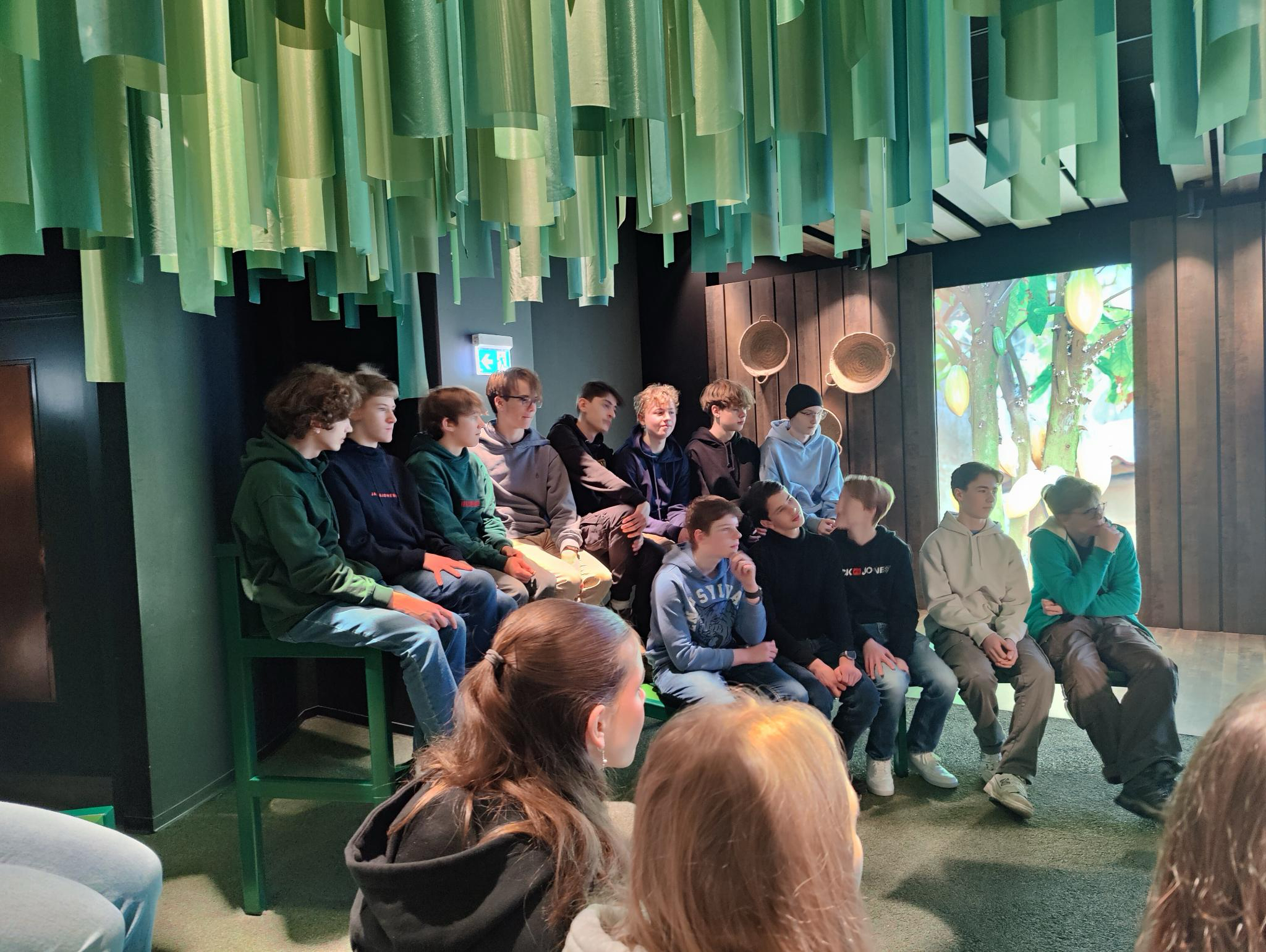 Als Zweites wurden wir in einen dschungelartigen Raum geführt. In diesem Raum haben wir mehr von der Kakaopflanze erfahren und wie diese aufgebaut ist. Außerdem haben wir erfahren, wie sie geernet wird und wie lange sie trocknen muss. Manche haben sich sogar getraut zu probieren, was ein großer Fehler war, da sie in diesem Zustand ungenießbar ist.