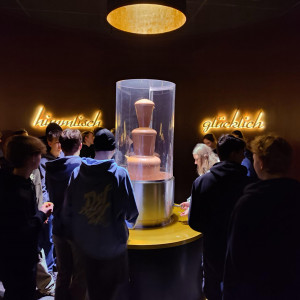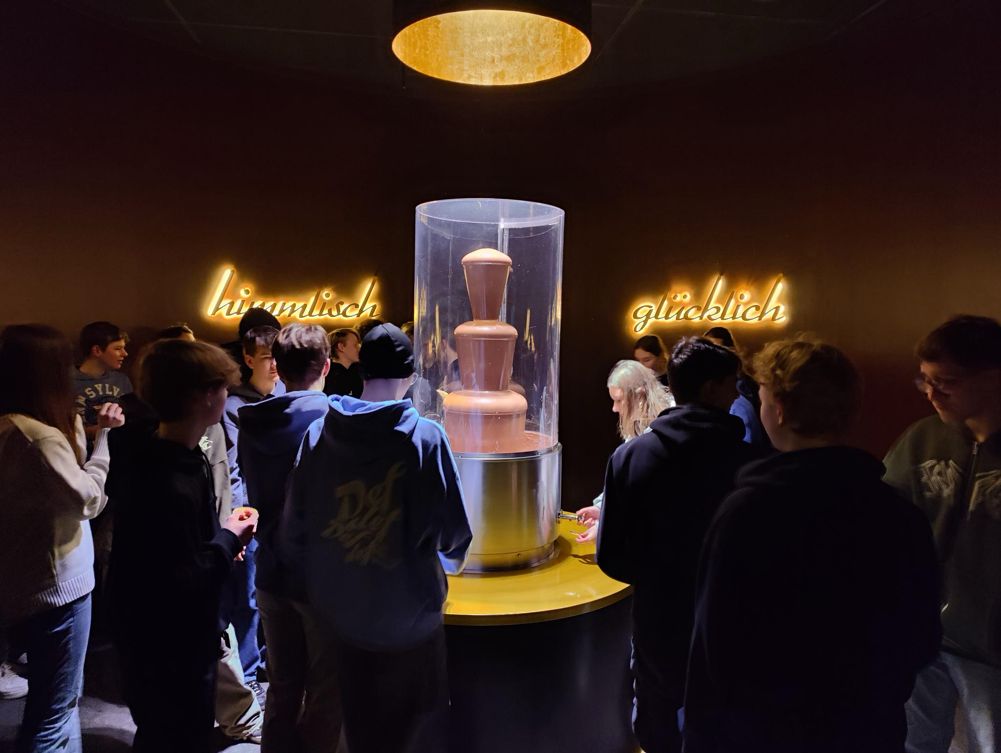 Nach ein paar Minuten ging es schon weiter und wir waren endlich am Chocoversum angekommen. Dort hatten wir noch ein bisschen Zeit, uns umzusehen. Wie bei einem Chocoversum zu erwarten, waren dort allerhand Schokoladensorten – von ganz normaler Vollmilchschokolade über Golfbälle bis hin zu Mehlwürmern in einer eher exotischen Schokolade. Einige Zeit später, nachdem sich jeder ein paar Souvenirs gekauft hatte, ging es auch schon los ins Museum. Zuerst kamen wir zu einem Raum mit einem Schokobrunnen, von dem wir alle ein bisschen kosten durften. Es war sehr lecker.