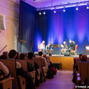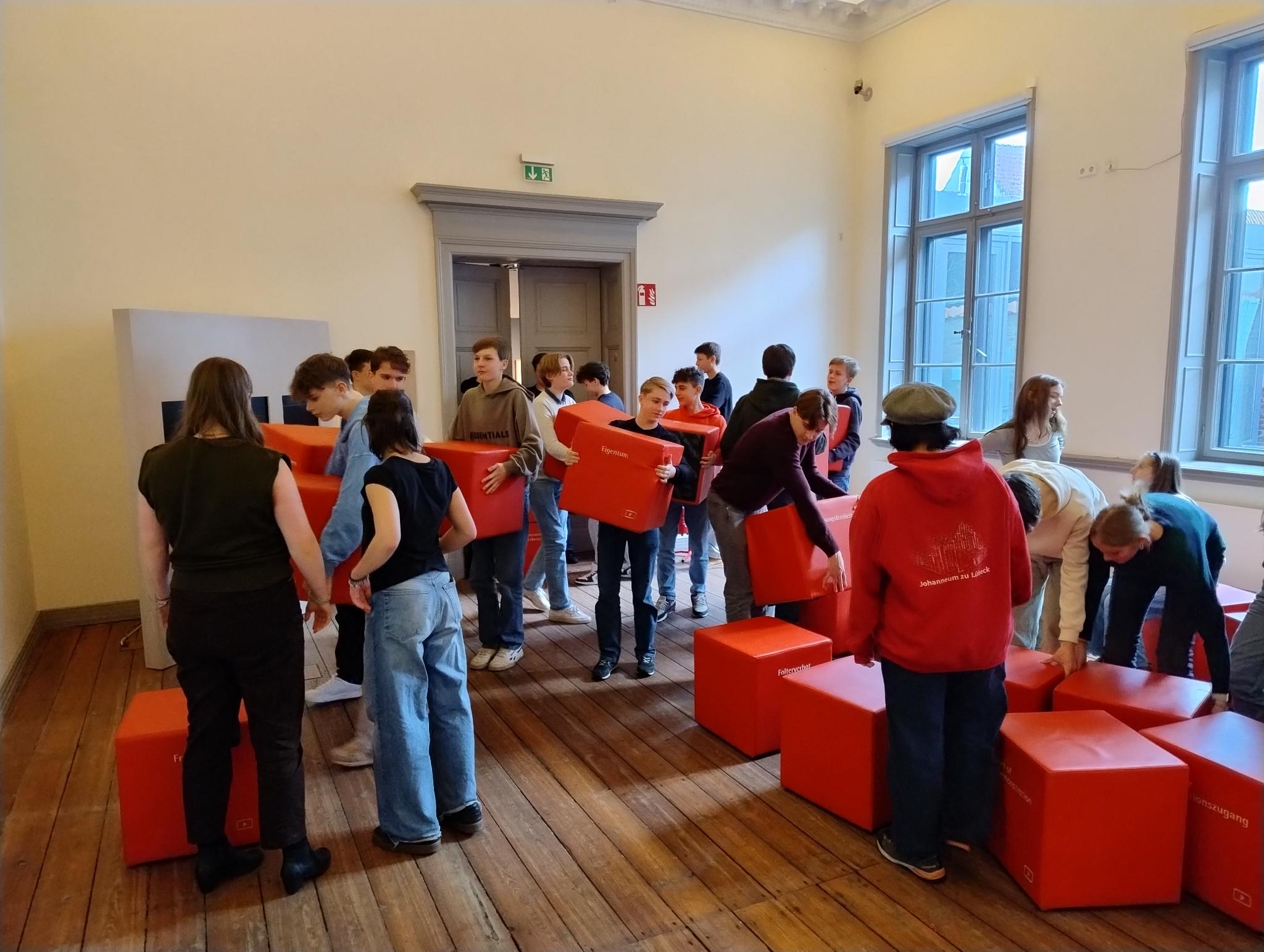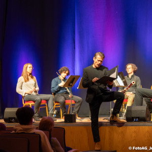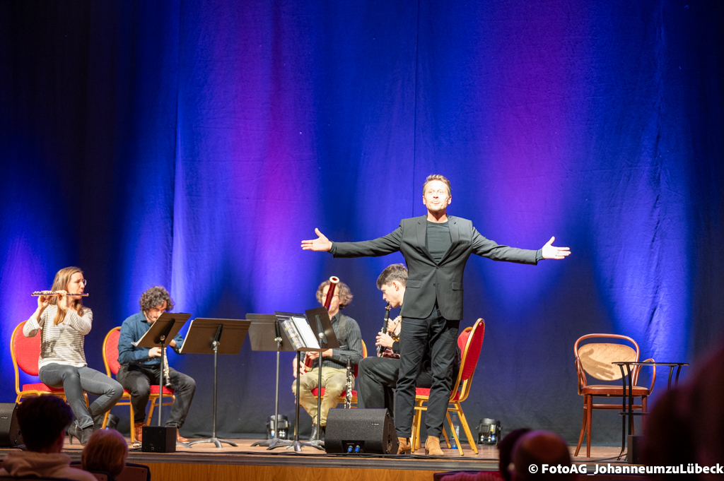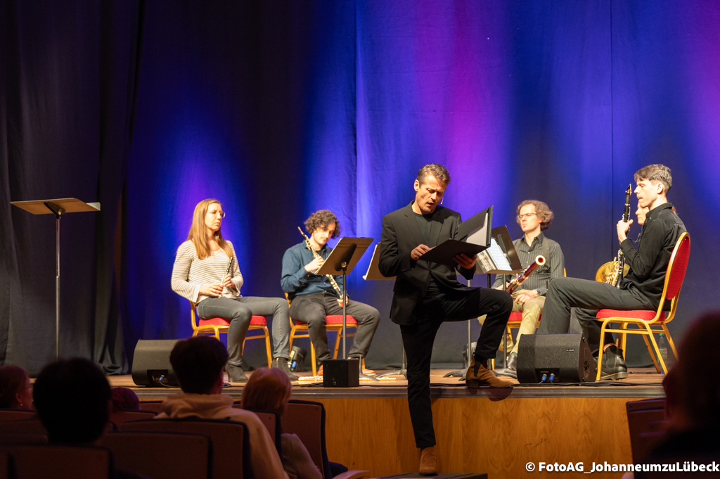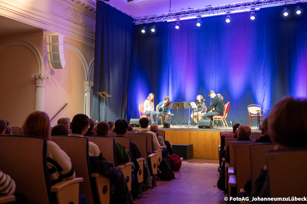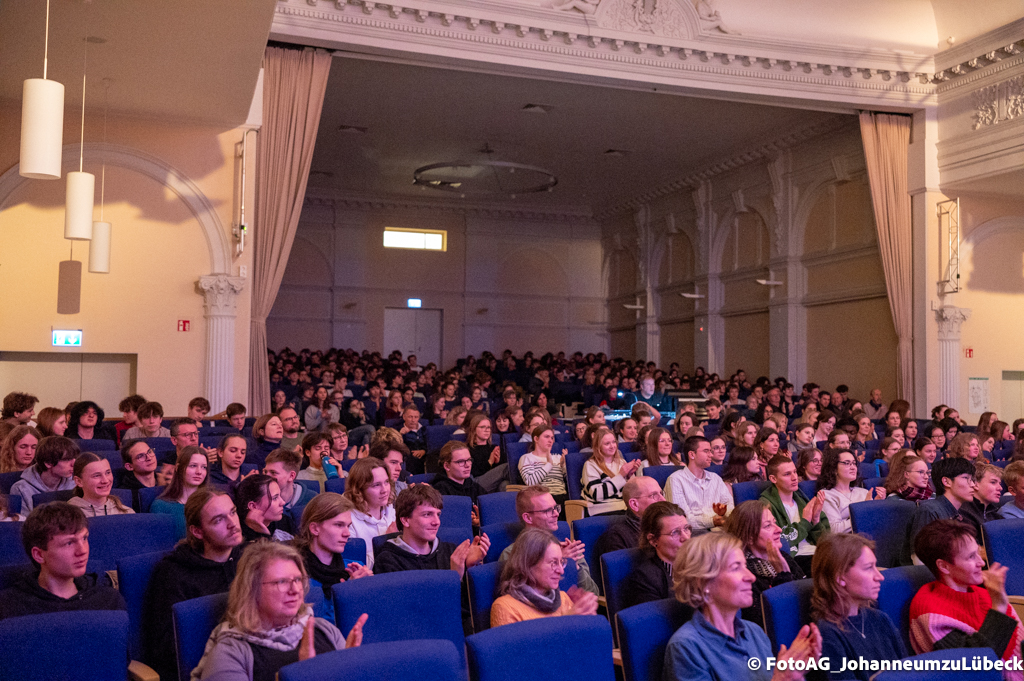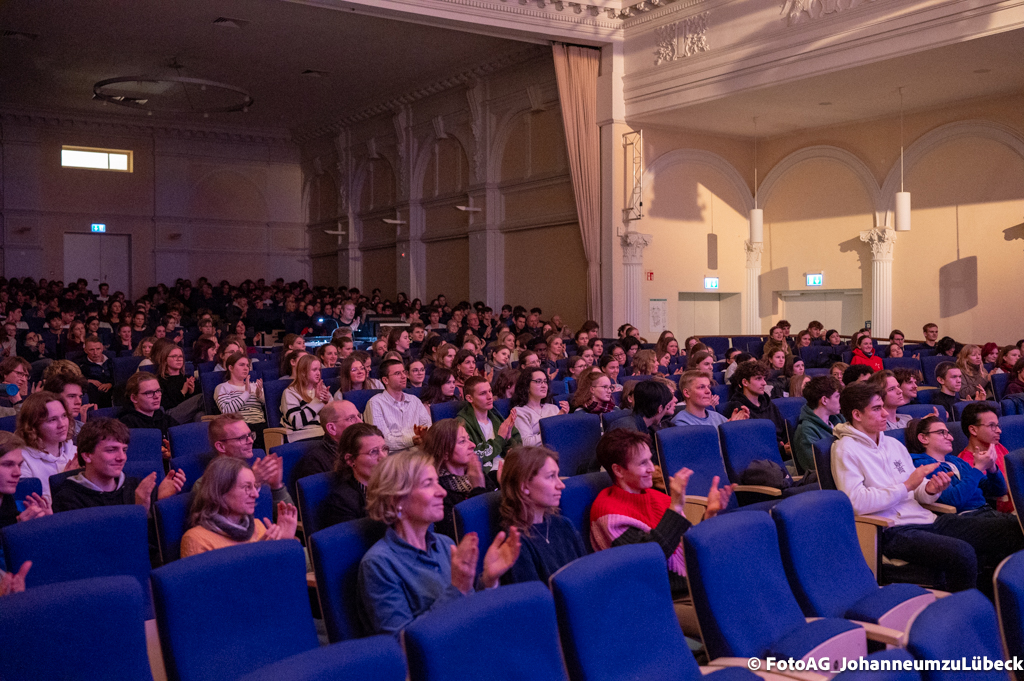 Den Holocaust-Gedenktag verbrachten wir im Kolosseum, denn wir durften der musikalischen Lesung „Ich wand’re durch Theresienstadt …“ vom Bläserquintett der Gruppe Opus 45 hören. Zunächst wussten wir nicht ganz, was uns erwarten würde, doch nach einer Begrüßung von einer Schülerin des Katharineums ging es direkt los. Von fünf Musiker:innen sowie dem Schauspieler Roman Knižka wurden reelle Texte von Kindern, die im Lager Theresienstadt leben mussten, vorgelesen und dazu passende Musik gespielt, die zum Teil dort im Lager entstanden ist. Wir konnten es kaum fassen, dass es trotz der Lebensbedingungen in Theresienstadt ein kulturelles Leben gab. So existierte beispielsweise eine Kindergruppe, die die Oper „Brundibar“ schrieb und zur Aufführung brachte. Nach einem tosenden Applaus verließen wir das Kolosseum mit anregenden Gedanken und eine nachdenkliche Stimmung lag in der Luft.