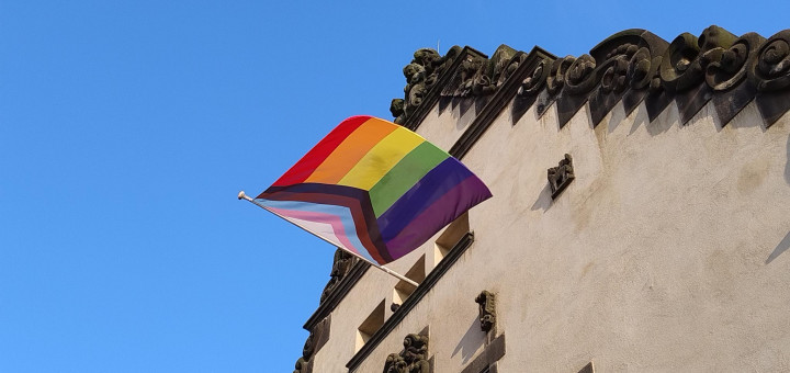 Wir hängen sie zu unterschiedlichen Anlässen auf: zum Infotag, im Pride Month und zum Christopher Street Day natürlich, aber manchmal lassen wir sie auch länger hängen. Wie jetzt gerade als Zeichen für Freiheit, Offenhet und Demokratie. Leider verwurschtelt der Wind sie ständig, sodass man eigentlich täglich hoch auf den Dachboden klettern müsste, um sie zu entwirren.