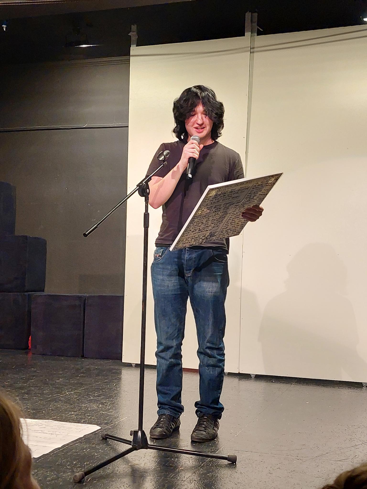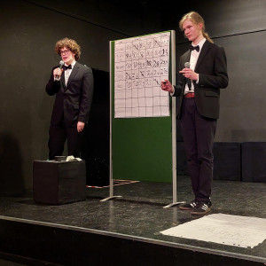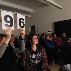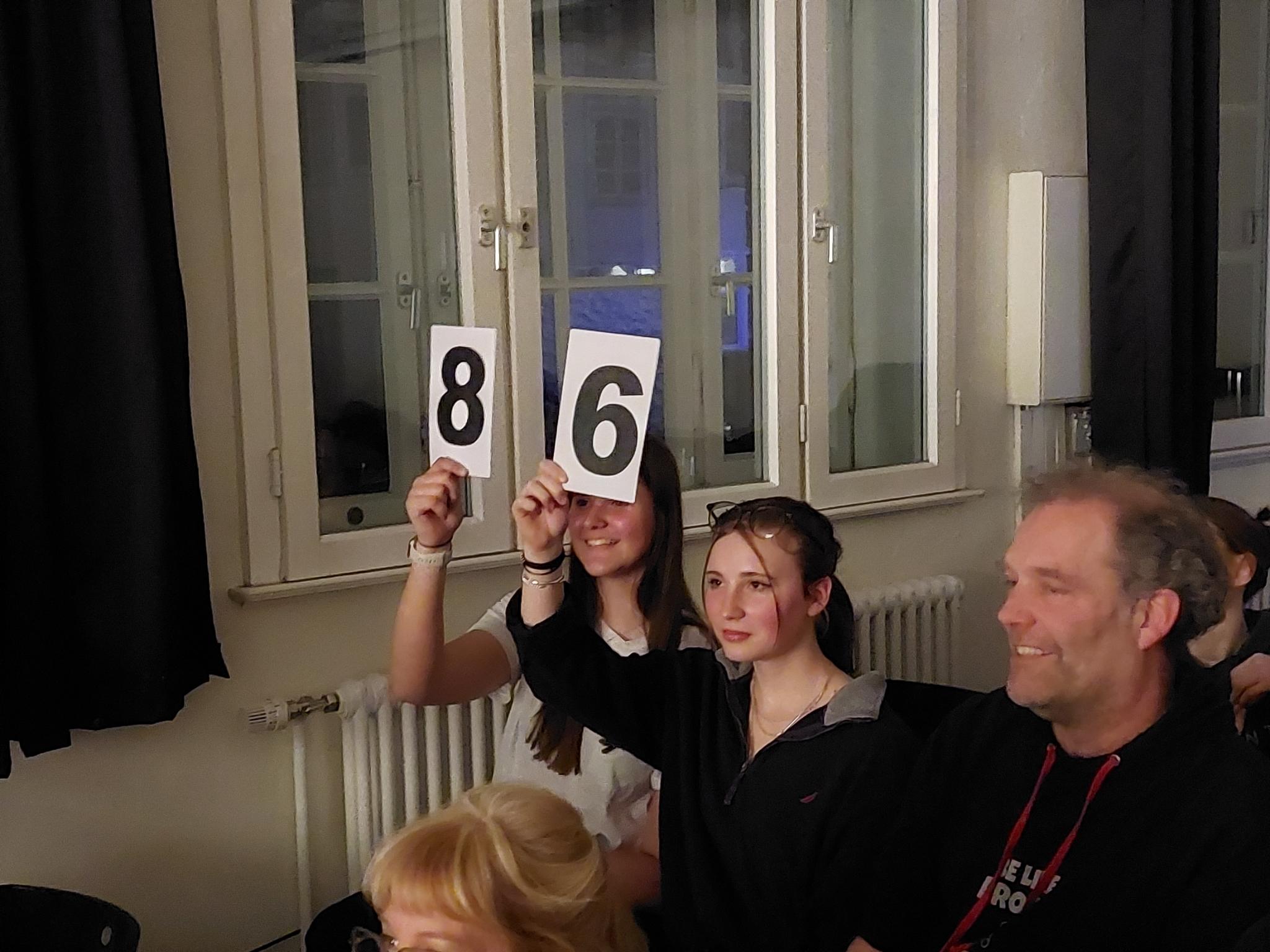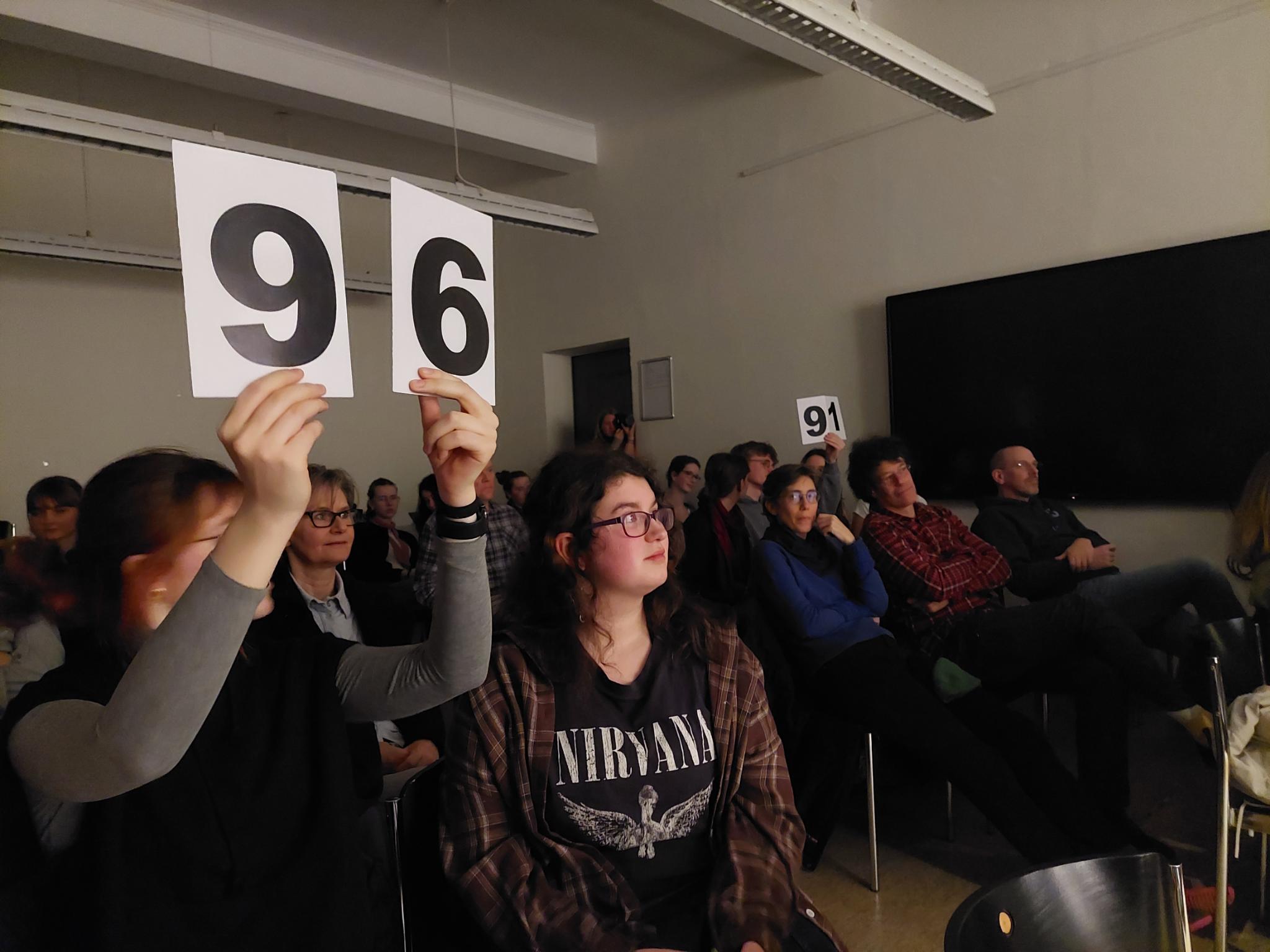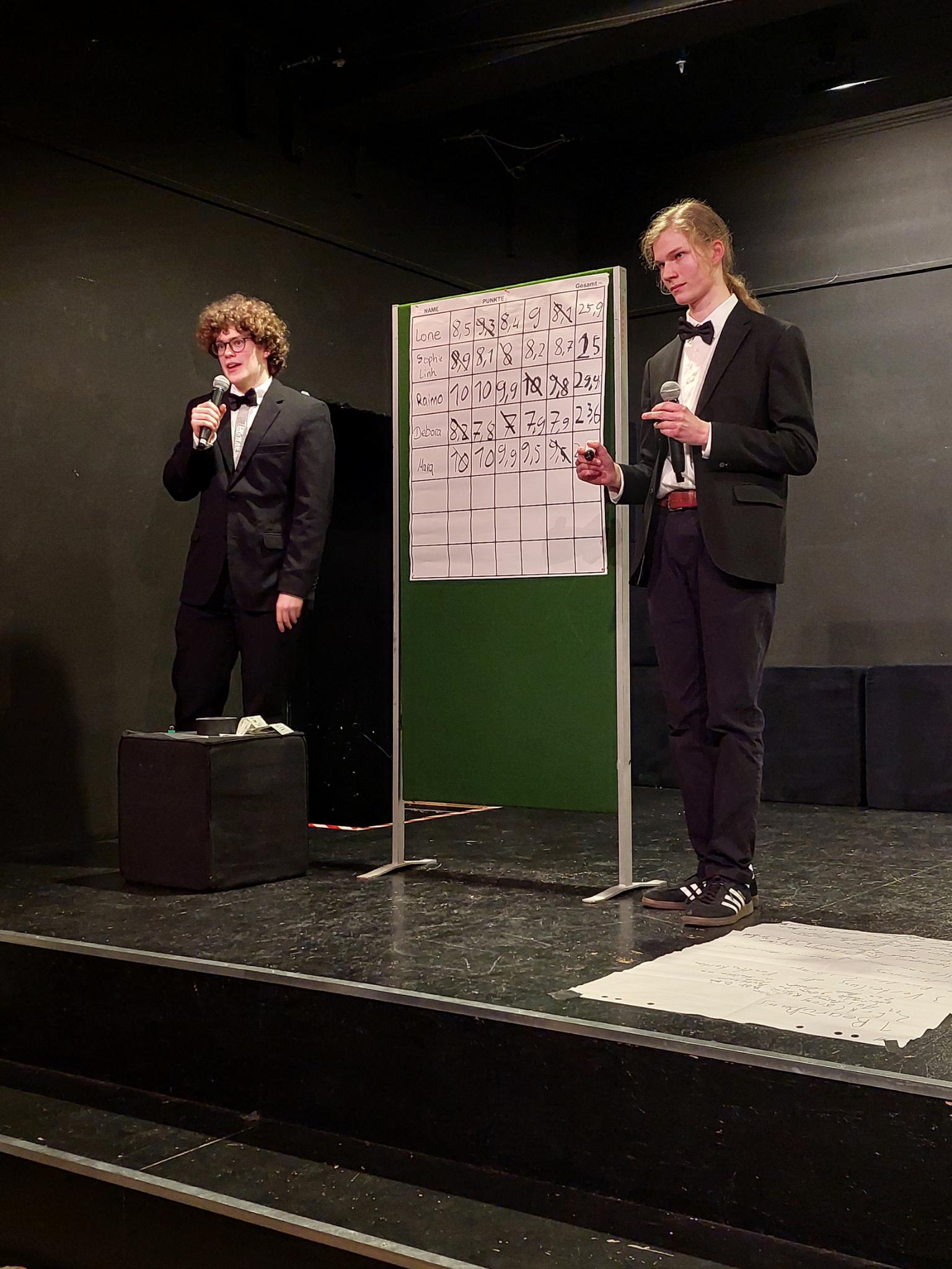 Kurz nach 18:30 Uhr ertönte auch schon spannungsgeladene Musik und die Moderatoren Ferdinand Thiele und Lloyd Bosselmann aus dem Q2-Jahrgang traten hinter der Bühne hervor. Mit Witz und Charme unterhielten sie das Publikum und erklärten die Regeln des Poetry-Slams. Denn das Besondere hierbei war, dass das Publikum selbst zur Jury wurde. Mit Punktekarten war es somit möglich, Werte von Null bis Zehn zu verteilen, die zuvor mit benachbarten Zuschauern diskutiert wurden.