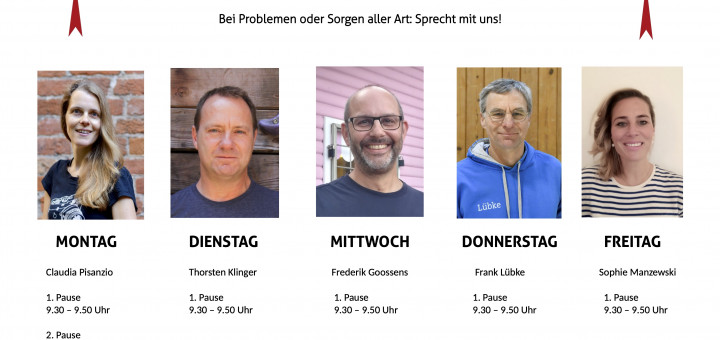 An jedem Tag der Woche sind wir für euch da: In jeder 1. großen Pause könnt ihr in den Beratungsraum in der Feuerwache kommen, am Montag auch in der 2. großen Pause. Wir sind ganz oben, in Raum F330, an der Tür hängt ein Poster des Beratungsteams. Ihr könnt euch aussuchen, mit wem ihr sprechen wollt, wir haben uns die Pausen aufgeteilt. Die Poster mit den betreffenden Personen findet ihr im Glaskasten am Torbogen, im Vertretungskasten im Haupteingang und an der Tür des Beratungsraums. Auch auf der Website sind unsere Zeiten, Fotos und unsere E-Mailadressen zu finden: https://www.johanneum-luebeck.de/2021/03/14/das-beratungsteam-ist-fuer-euch-da/