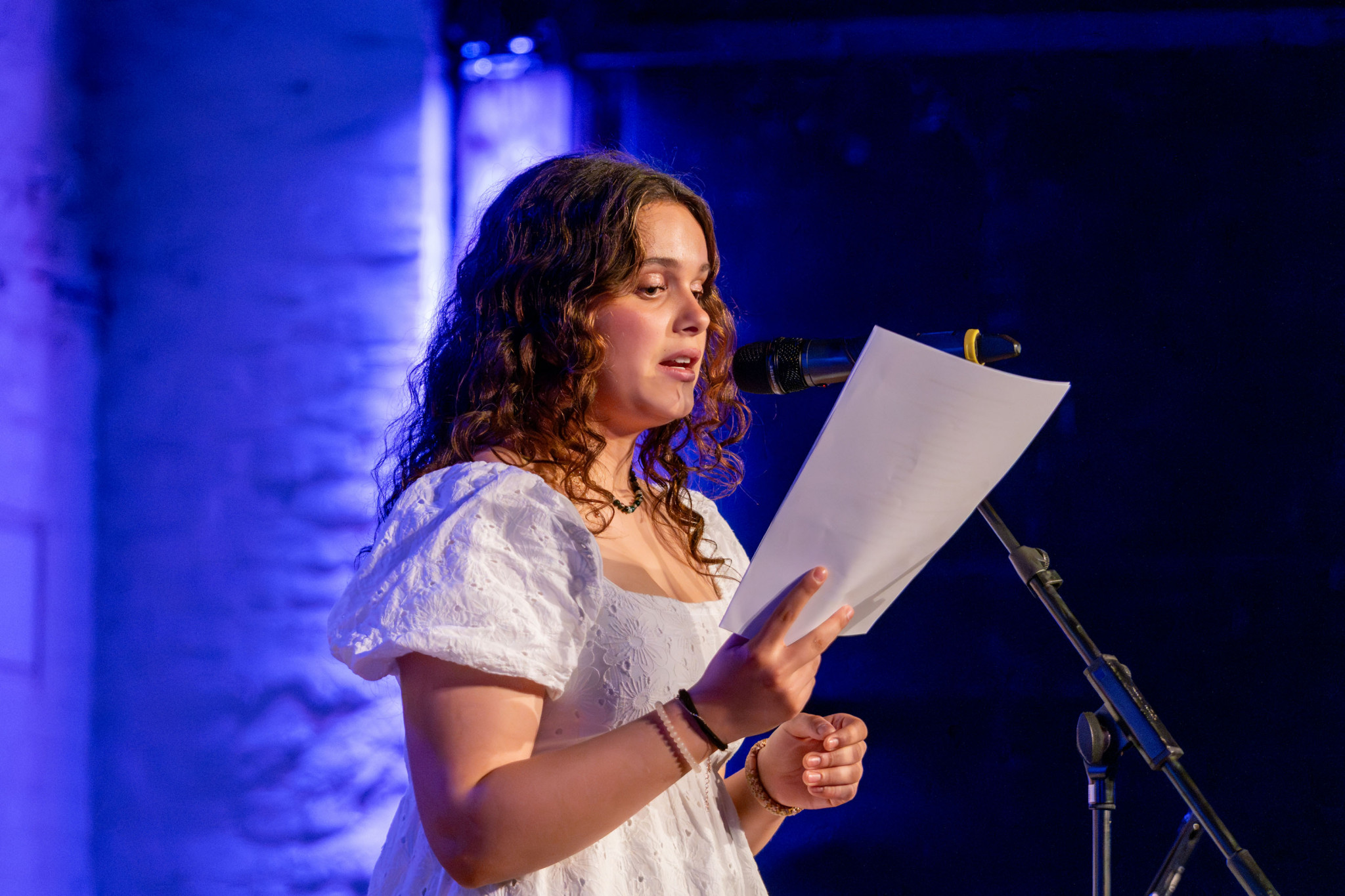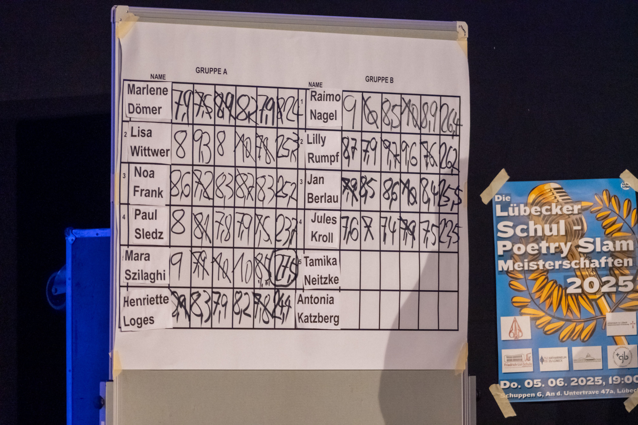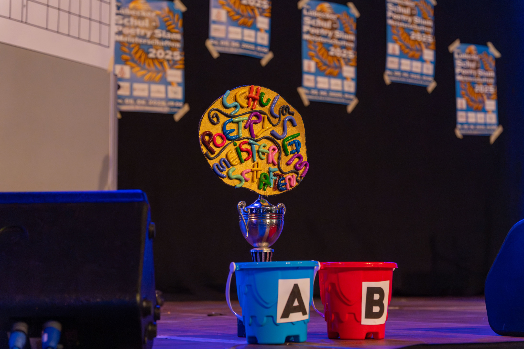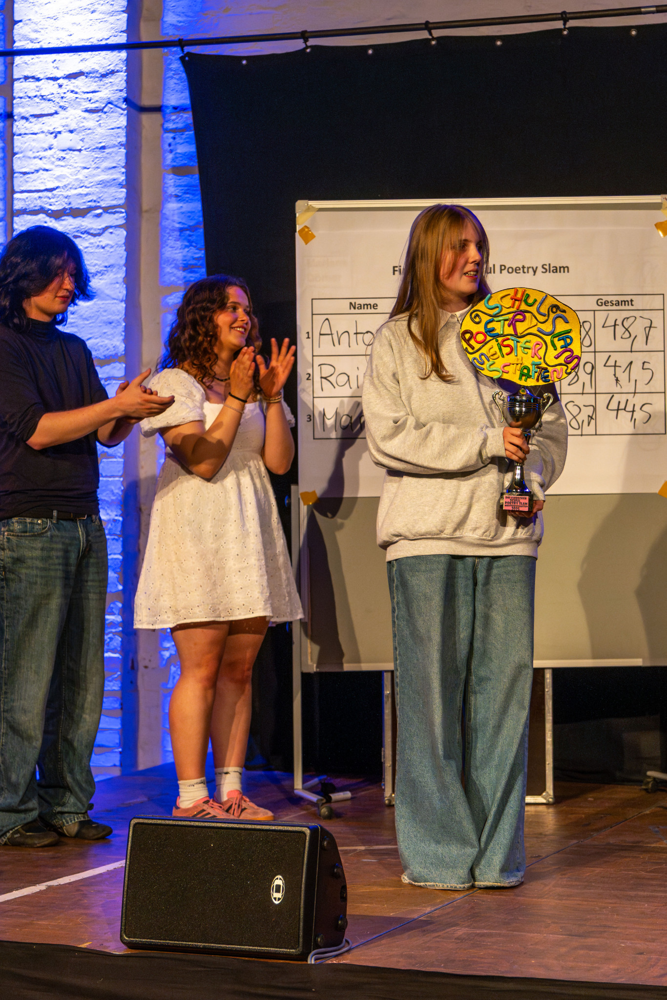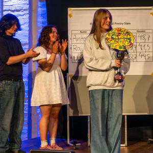 Die jungen Poet:innen traten mit selbstverfassten Texten in einem spielerischen Wortwettstreit gegeneinander an. Am Ende des Abends entschied die Jury, wessen Text die höchste Punktzahl erhielt – und damit den Meistertitel sowie die Trophäe. Diese Ehre ging an Antonia Katzberg vom Carl-Jacob-Burckhardt-Gymnasium, die mit zwei humorvollen und mitreißenden Texten überzeugte – herzlichen Glückwunsch!