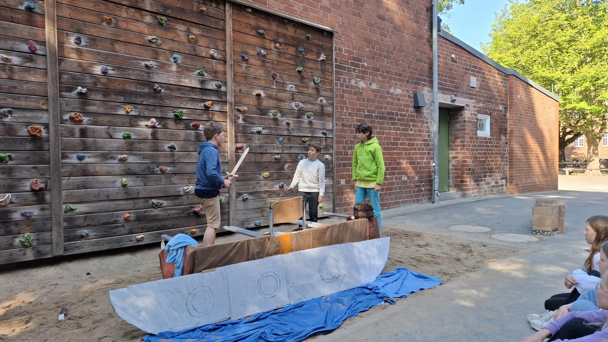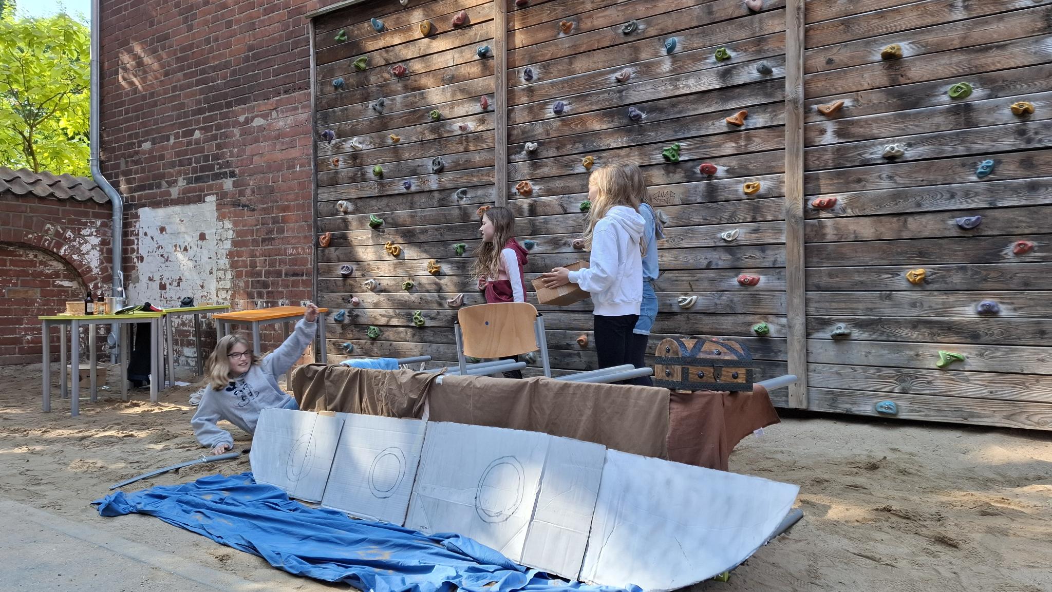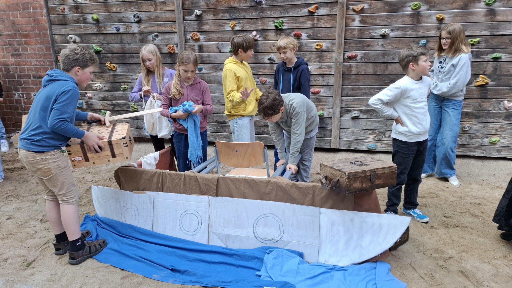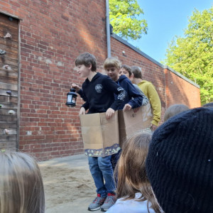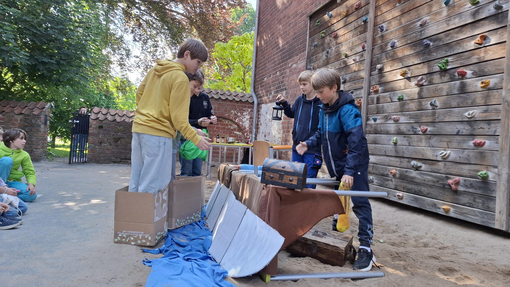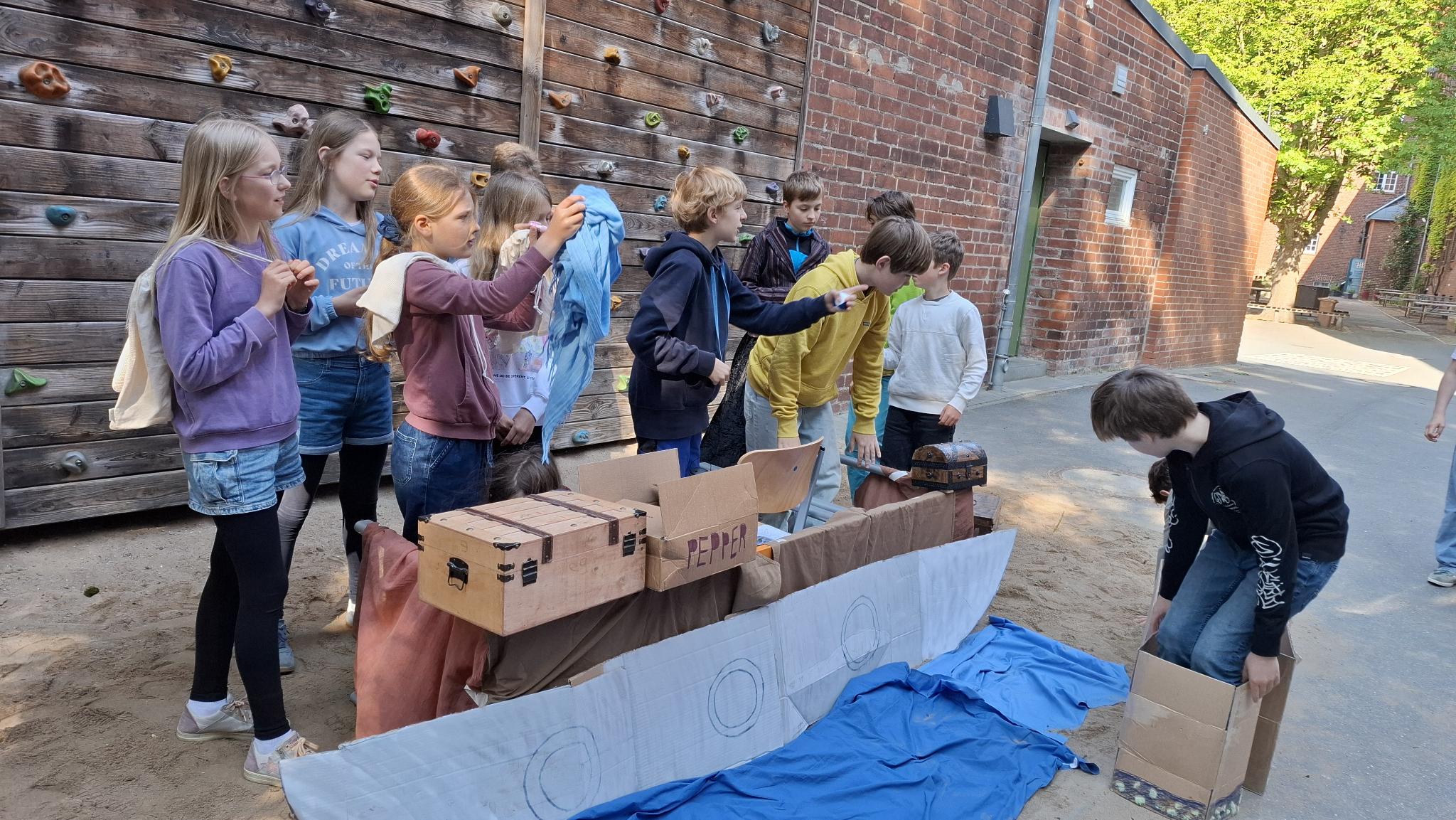 Theaterspielen macht Spaß, insbesondere dann, wenn auch Bühnenbild und Requisiten stimmen. Und so konnten wir uns richtig in das Stück einfinden und die Rollen gut verkörpern. Auch über die Anordnung der einzelnen Bühnenbauteile und die Requisiten waren sich alle schnell einig. Es war ein großer Spaß und, wer weiß, was noch alles an Leckereien geschmuggelt werden kann, nur um daraus ein spannendes kleines Theaterstück zu kreieren.