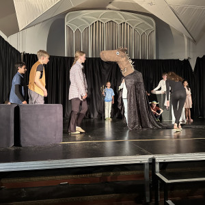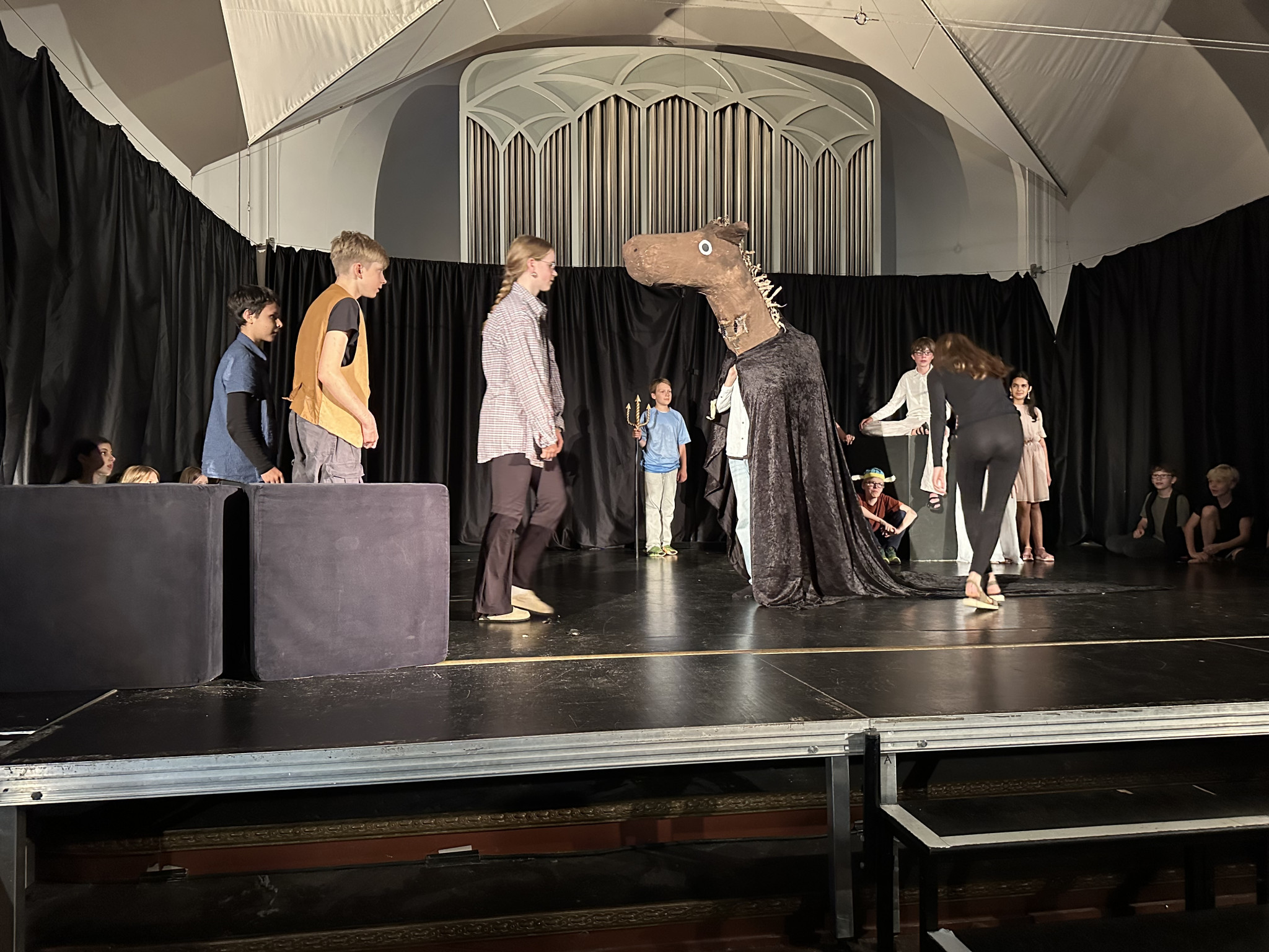 Auch das Stück der 6b hat uns sehr beindruckt. Es erzählte die, ebenfalls berühmte, Geschichte von Odyseus, einem griechischen Helden, der seine Heimat Ithaka verlässt und in den Krieg zieht. Nach dem Krieg braucht er 20 Jahre, um nach Hause zurückzukehren. Diese spannende Sage hat die 6b toll präsentiert und gekürzt. Durch kreative Kostüme konnte man sich gut in die Szenen hineinversetzen und sogar ein Pferde- und ein Zyklopenkopf waren dabei. Diese wurden aus Pappmache selbst hergestellt. Obwohl viele Rollen aufgrund von Krankheitsfällen kurzfristig umbesetzt werden mussten, wurde das Stück souverän präsentiert.