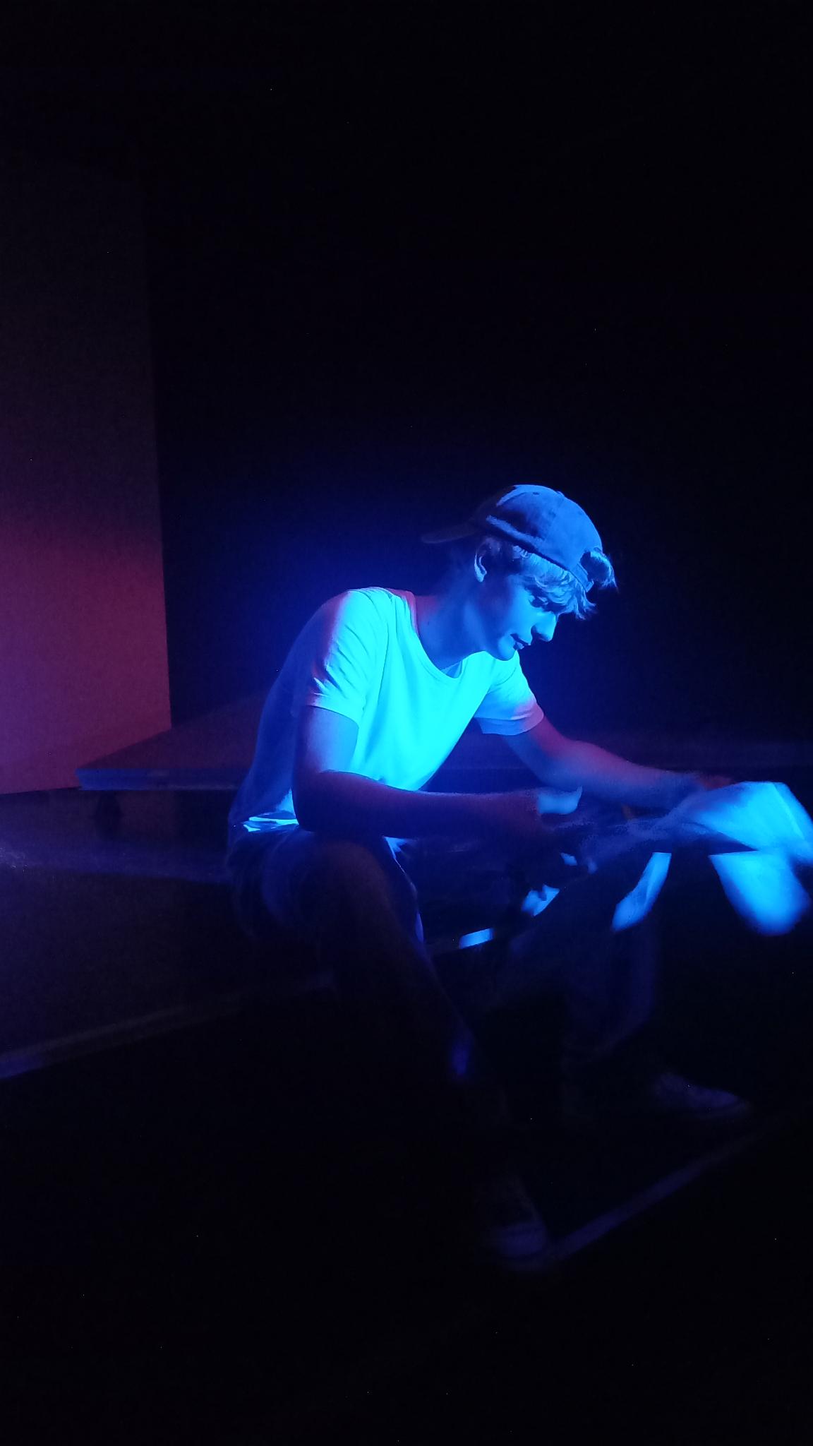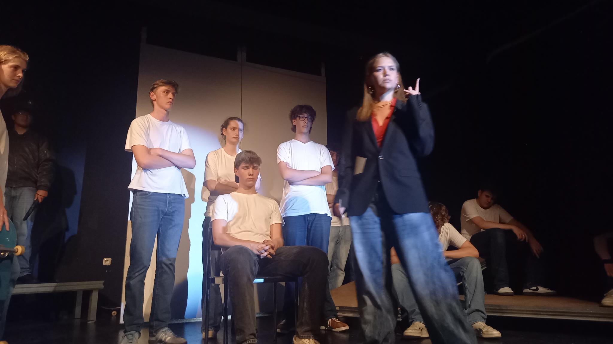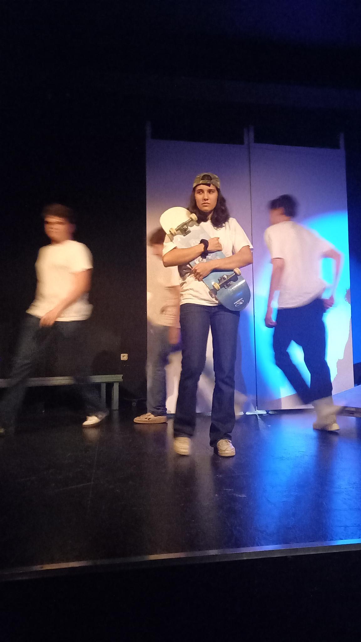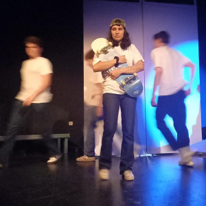 Mit lauter Musik, dunklen Lichtern, Skateboards, Rampen, Kaugummi-Zigaretten und Bierflaschen half nach dem Unterricht der gesamte WPU-Kurs der 10. Klassen von Frau Jensen dabei, unser vertrautes Studio in einen düsteren Skatepark umzuwandeln. Wir selbst bereiteten uns in der Generalprobe darauf vor, die Zuschauer:innen nach Portland, eine Stadt in den USA, zu führen. Als Vorlage für unsere Aufführung haben wir uns einen Roman genommen und von dieser Basis aus neu geschriebene Szenen aus dem Drehbuch Stück für Stück auf die Bühne gebracht.
