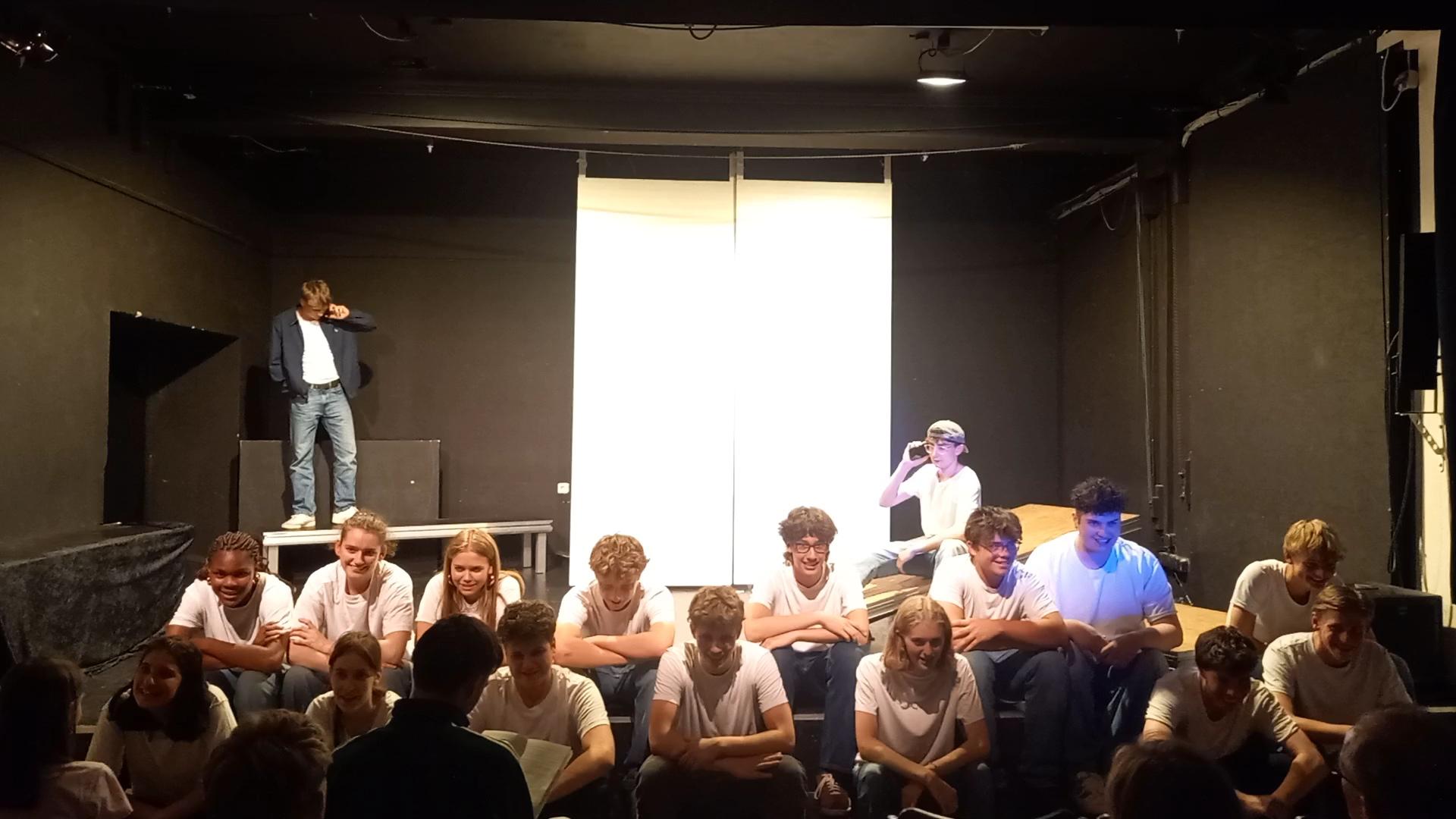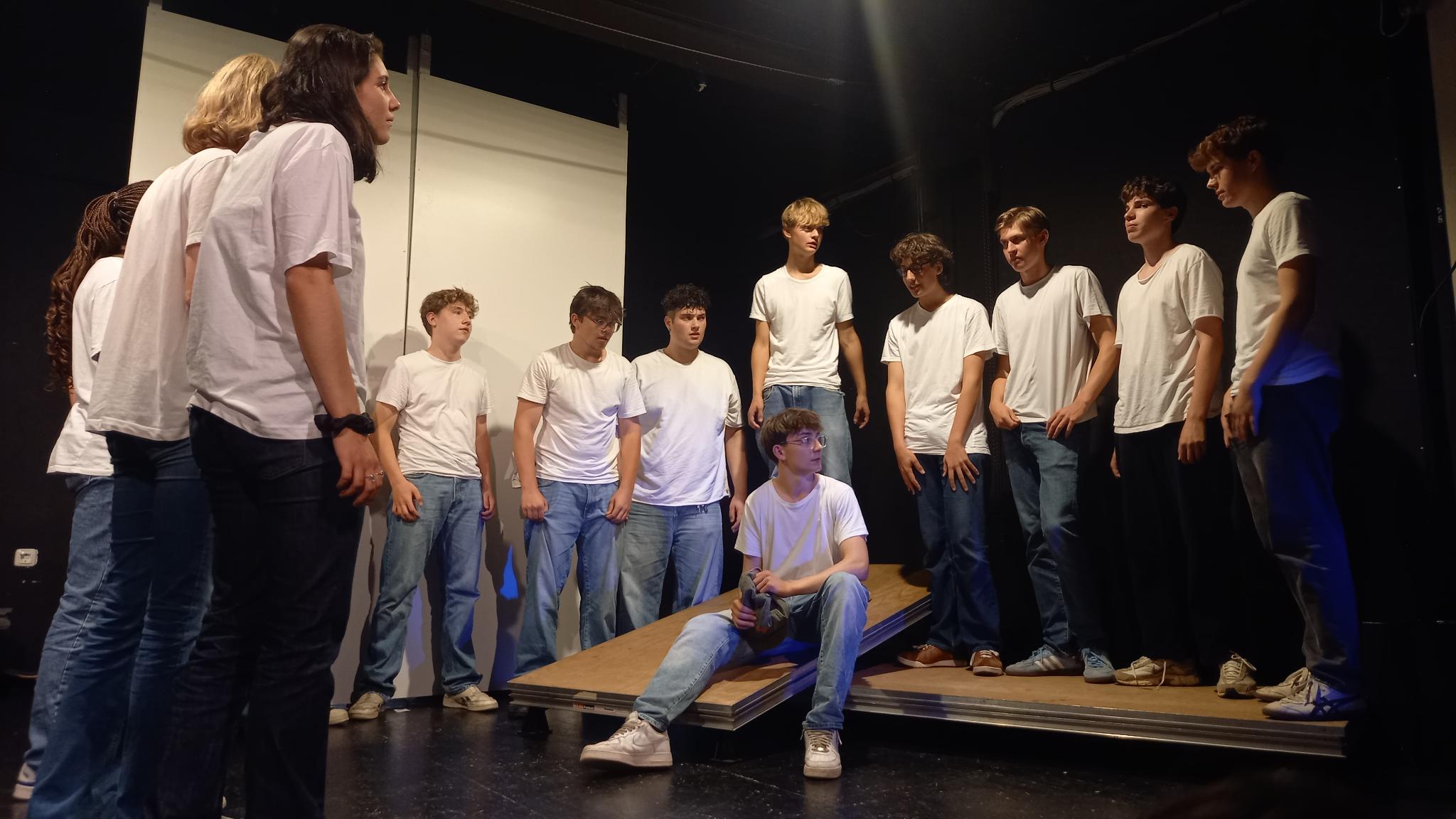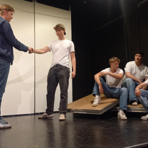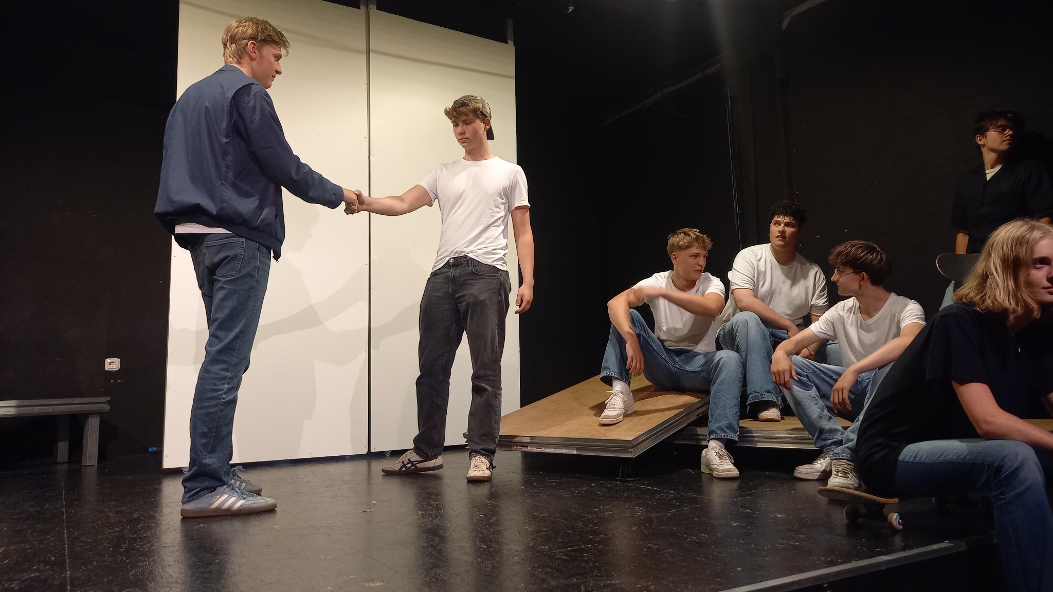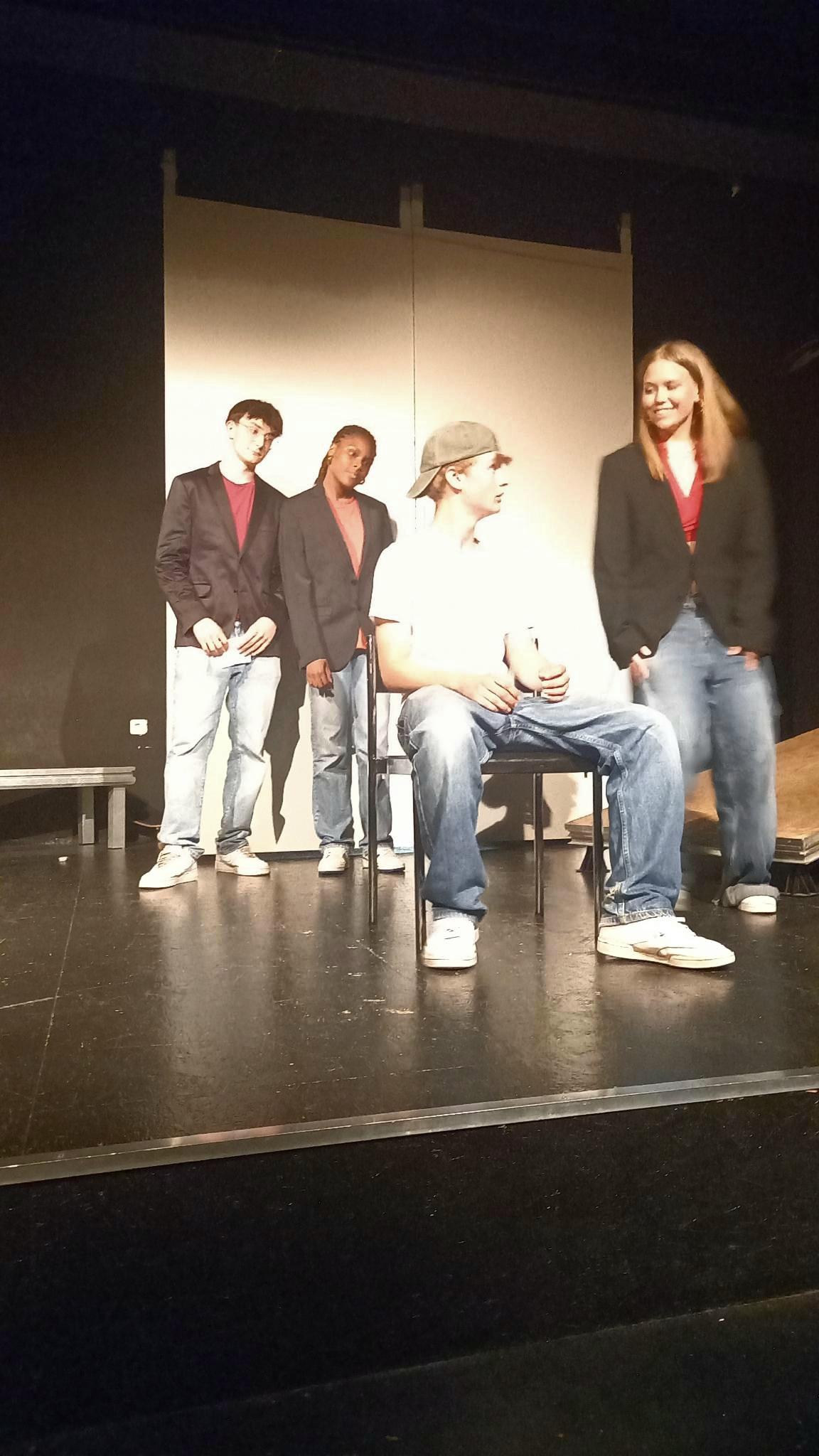 Mit lauter Musik, dunklen Lichtern, Skateboards, Rampen, Kaugummi-Zigaretten und Bierflaschen half nach dem Unterricht der gesamte WPU-Kurs der 10. Klassen von Frau Jensen dabei, unser vertrautes Studio in einen düsteren Skatepark umzuwandeln. Wir selbst bereiteten uns in der Generalprobe darauf vor, die Zuschauer:innen nach Portland, eine Stadt in den USA, zu führen. Als Vorlage für unsere Aufführung haben wir uns einen Roman genommen und von dieser Basis aus neu geschriebene Szenen aus dem Drehbuch Stück für Stück auf die Bühne gebracht.
