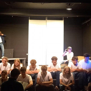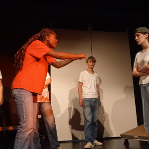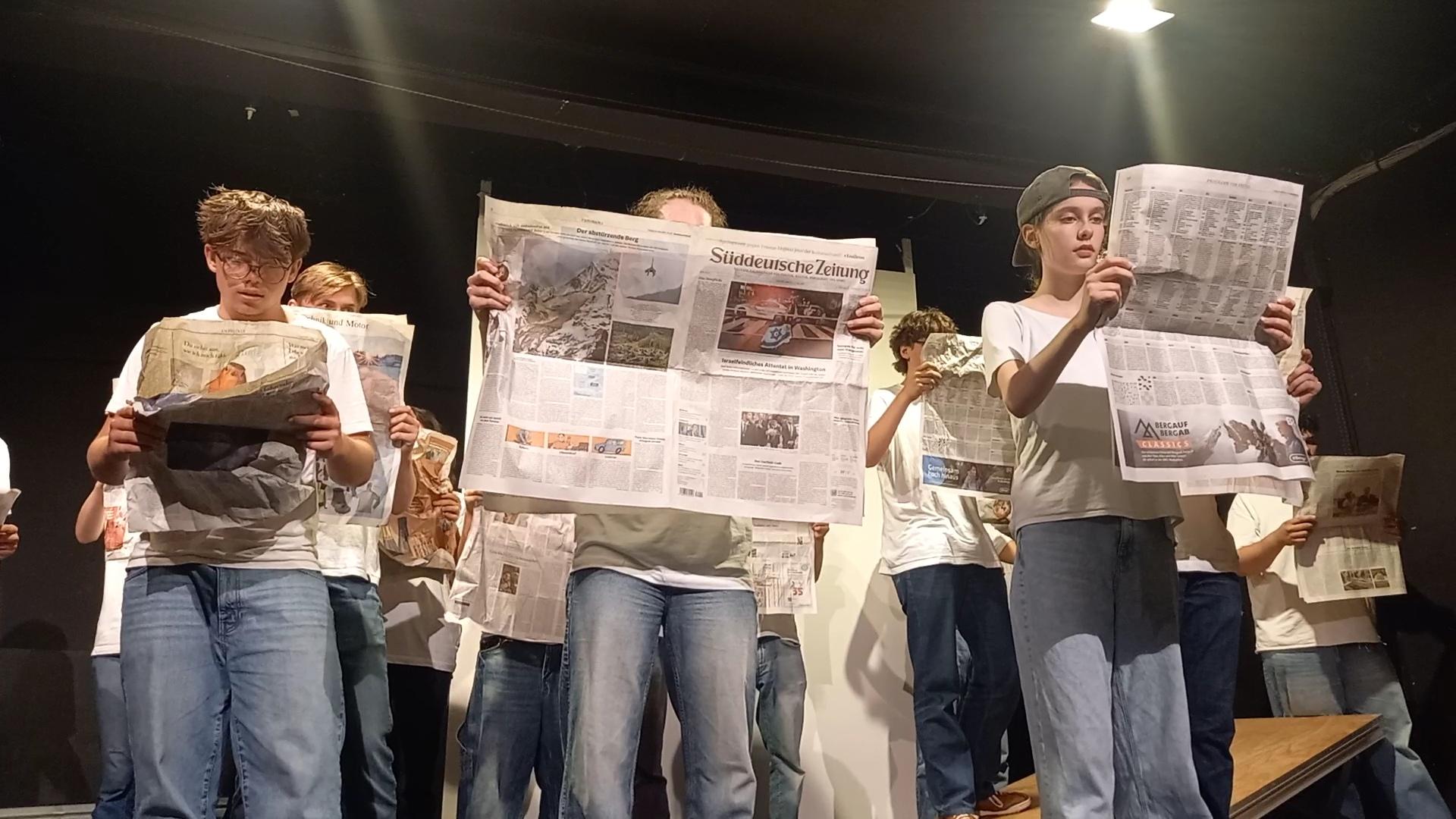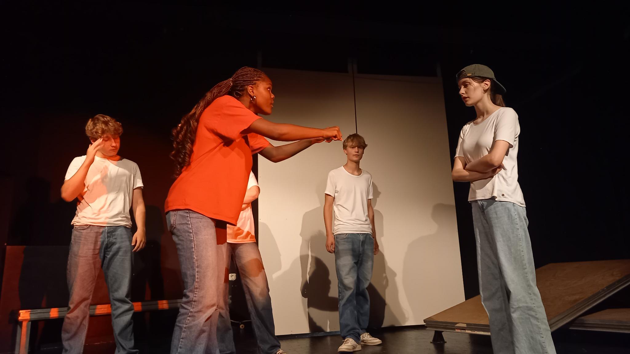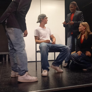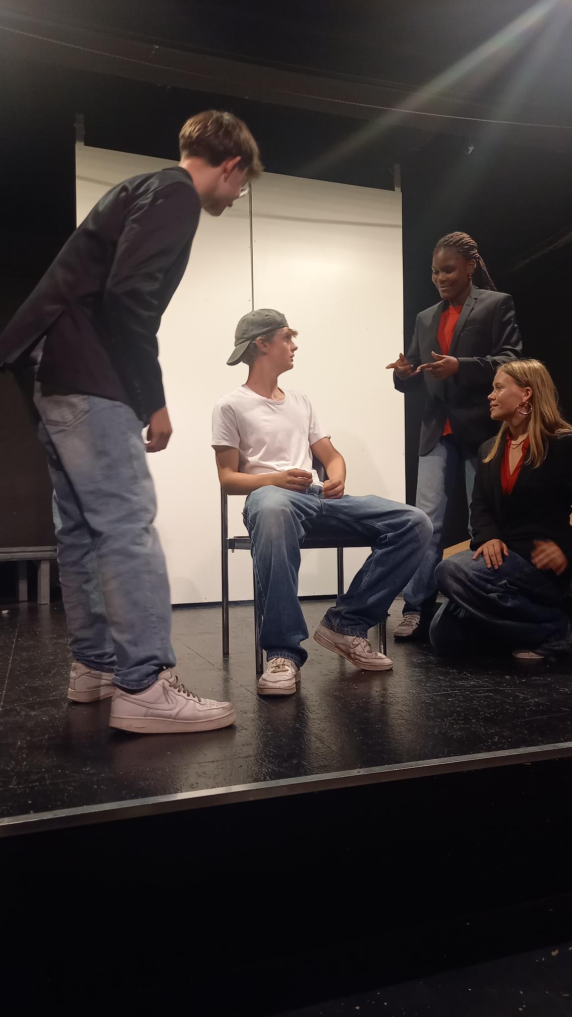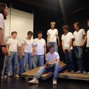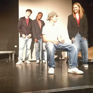 Mit lauter Musik, dunklen Lichtern, Skateboards, Rampen, Kaugummi-Zigaretten und Bierflaschen half nach dem Unterricht der gesamte WPU-Kurs der 10. Klassen von Frau Jensen dabei, unser vertrautes Studio in einen düsteren Skatepark umzuwandeln. Wir selbst bereiteten uns in der Generalprobe darauf vor, die Zuschauer:innen nach Portland, eine Stadt in den USA, zu führen. Als Vorlage für unsere Aufführung haben wir uns einen Roman genommen und von dieser Basis aus neu geschriebene Szenen aus dem Drehbuch Stück für Stück auf die Bühne gebracht.