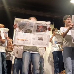 Nach fast zwei Jahren konnten wir mit unserem WPU-Kurs Darstellendes Spiel endlich Plakate in der ganzen Schule verteilen und somit den Abschluss unserer Zusammenarbeit und das Ende des gemeinsamen Schauspiels ankündigen.