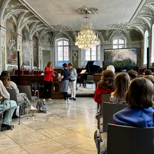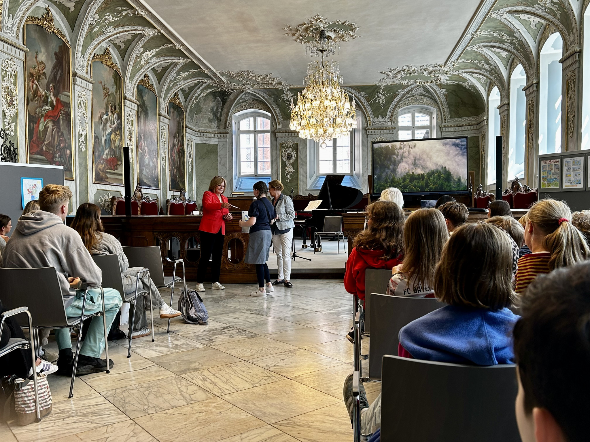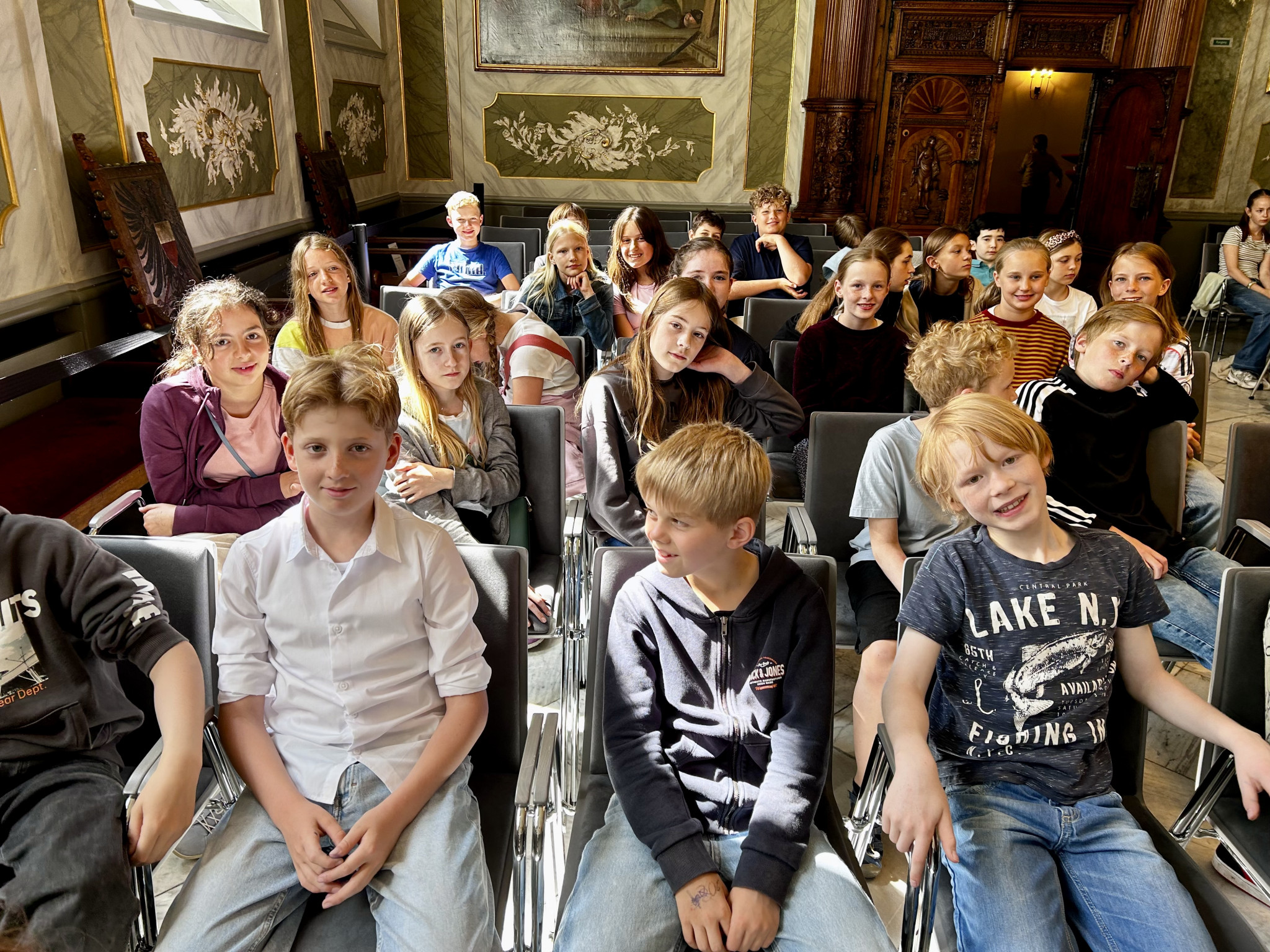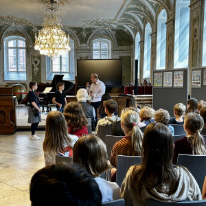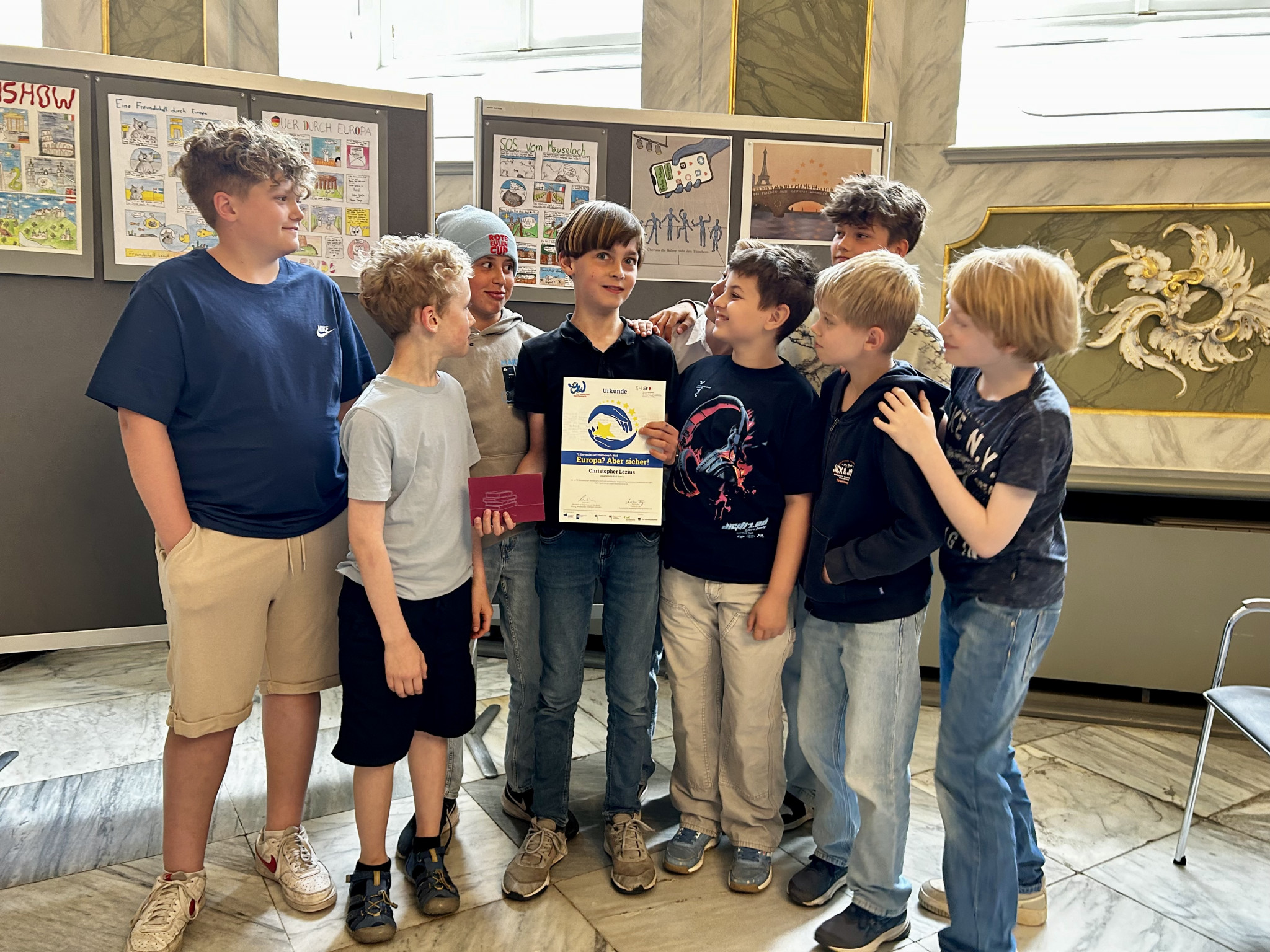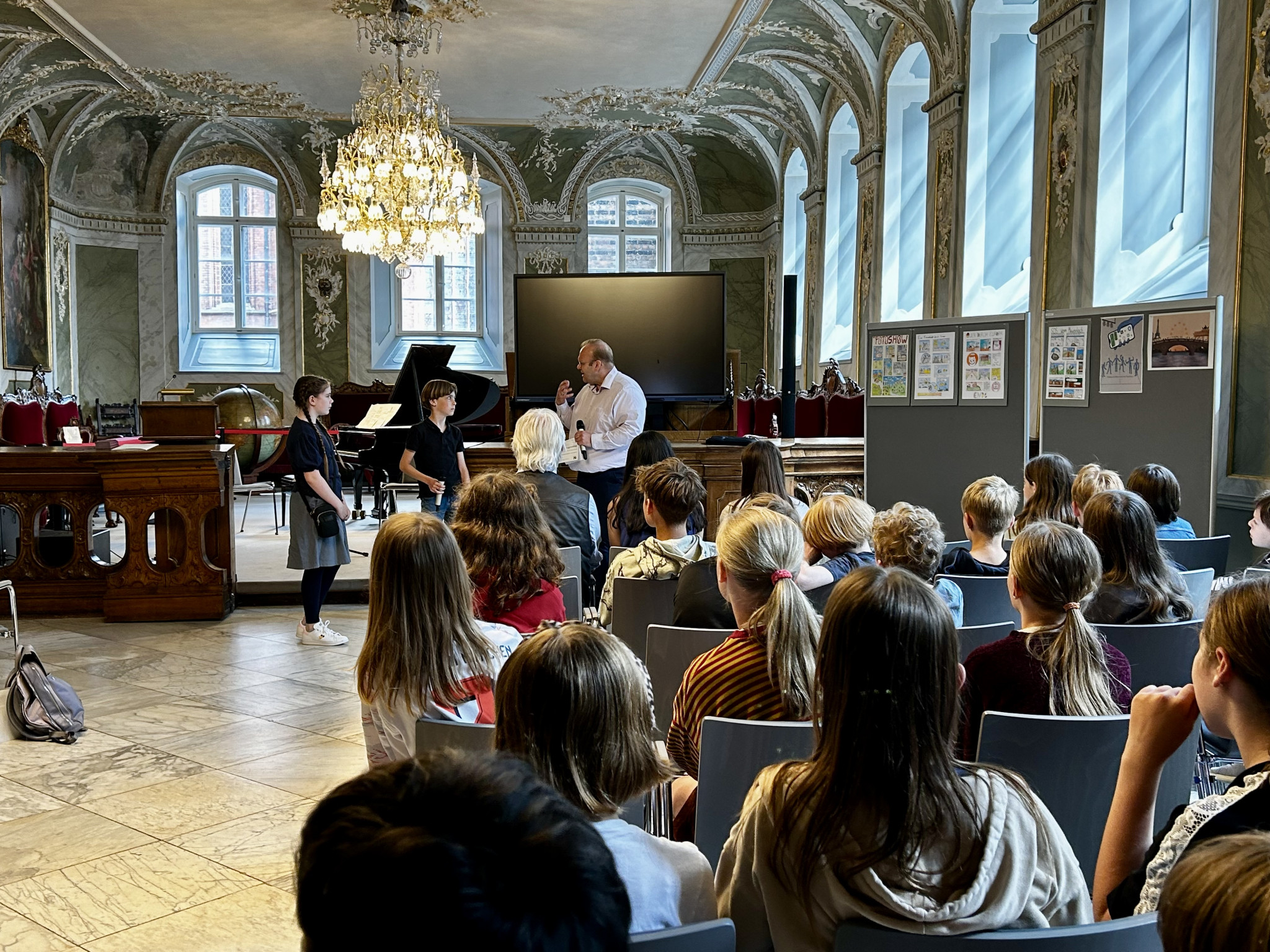 Für das Ergebnis, unsere Texte, gab es am 11. Juli 2025 im Audienzsaal des Rathauses eine Ehrung: Birgit Wille, die Vorsitzende der Europa-Union, und Senatorin Monika Frank haben uns zur Preisverleihung des Europäischen Wettbewerbs eingeladen, an dem jedes Jahr über 70.000 Schüler:innen in Deutschland teilnehmen. Wir waren total gespannt, wer mit seinem Märchen das Rennen gemacht hat. Und der Lübecker Politiker, Herr Kreft, hat uns und die Schüler:innen der anderen Schulen auch ein bisschen auf die Folter gespannt. Er wollte bei der Vorstellung unserer Arbeiten ganz genau wissen, was wir uns überlegt hatten und welche Eigenschaften wir an unseren Märchenfiguren als wichtig und wertvoll empfanden. Am Ende waren wir alle ein bisschen stolz, dass wir an dem Wettbewerb teilgenommen haben, denn die Preisverleihung ist schon ein schöner Moment. Und besonders stolz waren wir dann auf Sonja und Christopher, die beide mit ihren Texten einen Landespreis von Herrn Kreft und Frau Frank erhielten.