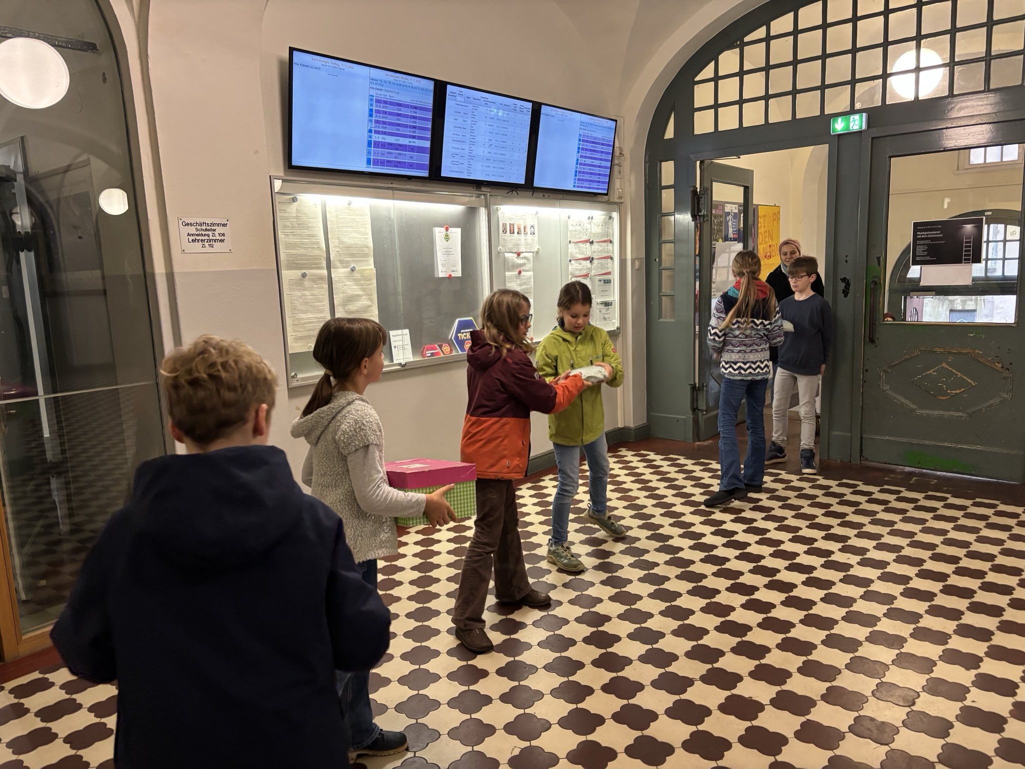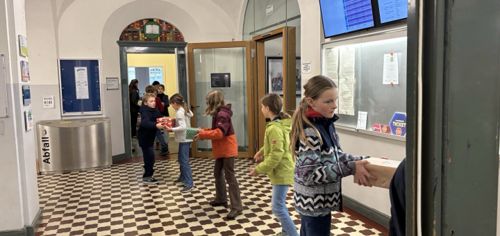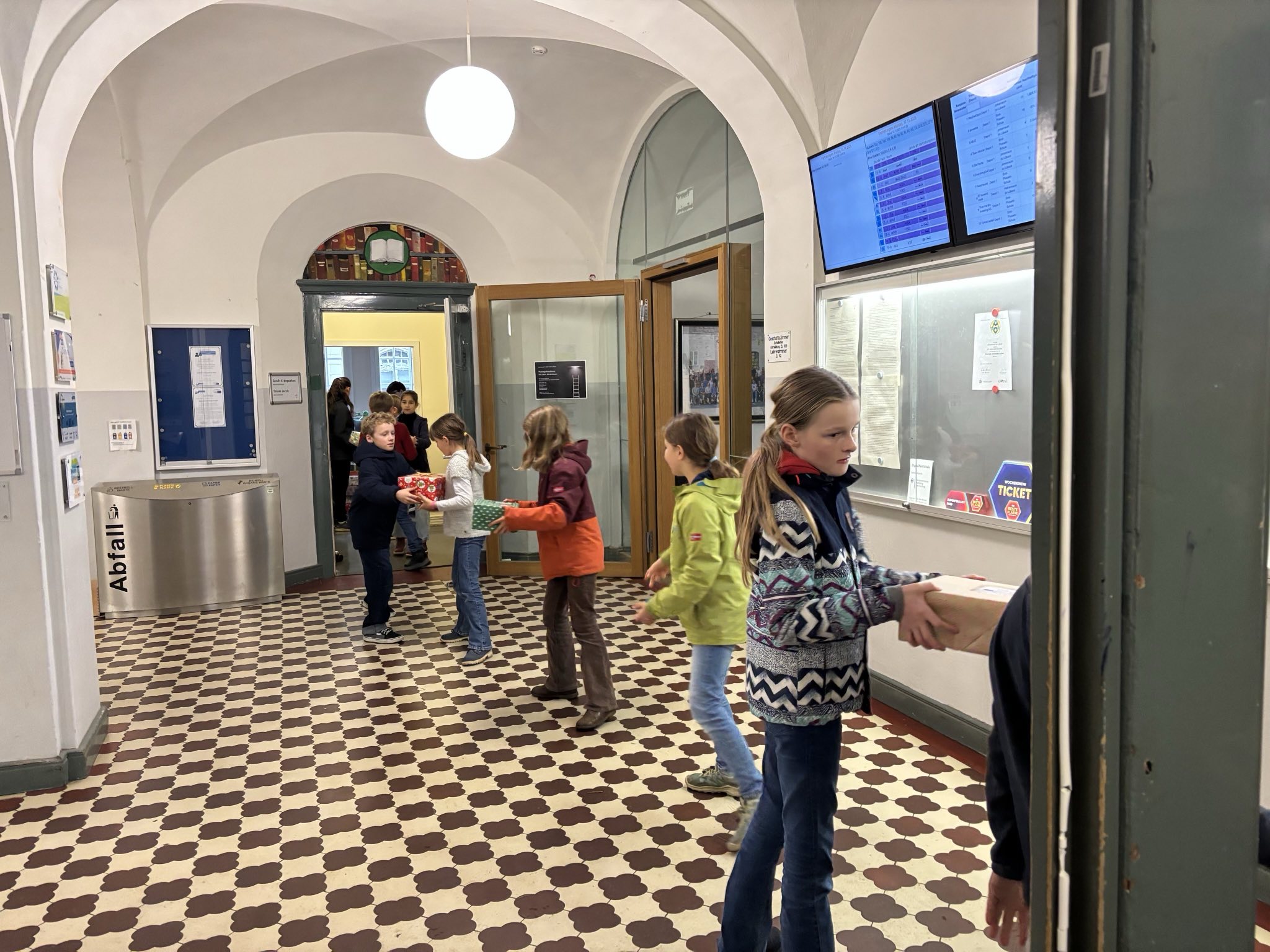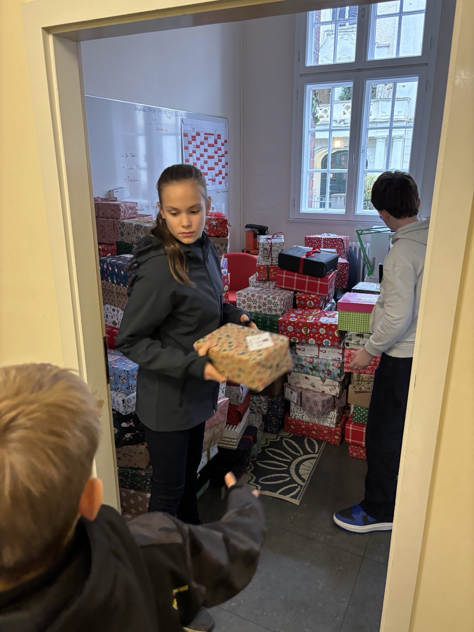 In den letzten Tagen füllte sich das Büro so sehr, dass die Tür kaum mehr aufging. Beim Abholen konnten die Kinder des Ganztags anpacken, durchzählen und staunen: Die Schulgemeinschaft unserer Schule hat insgesamt 245 liebevoll gepackte Päckchen für den Weihnachtspäckchenkonvoi gesammelt.