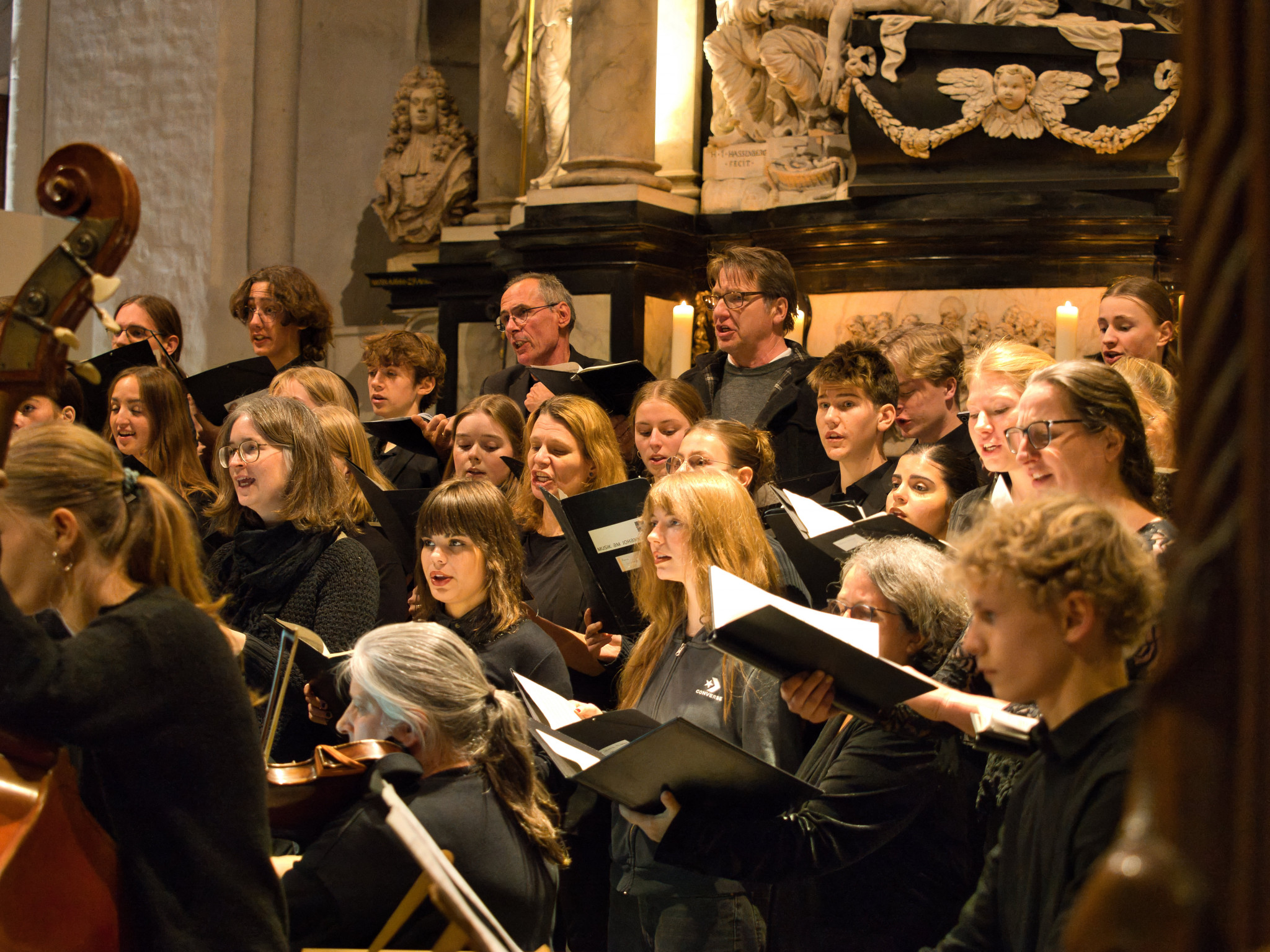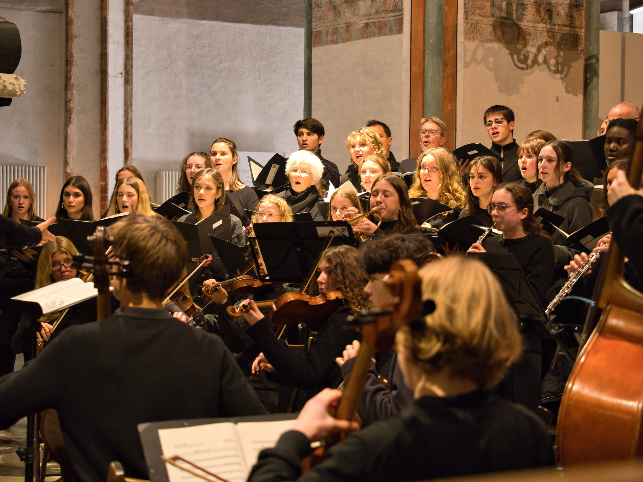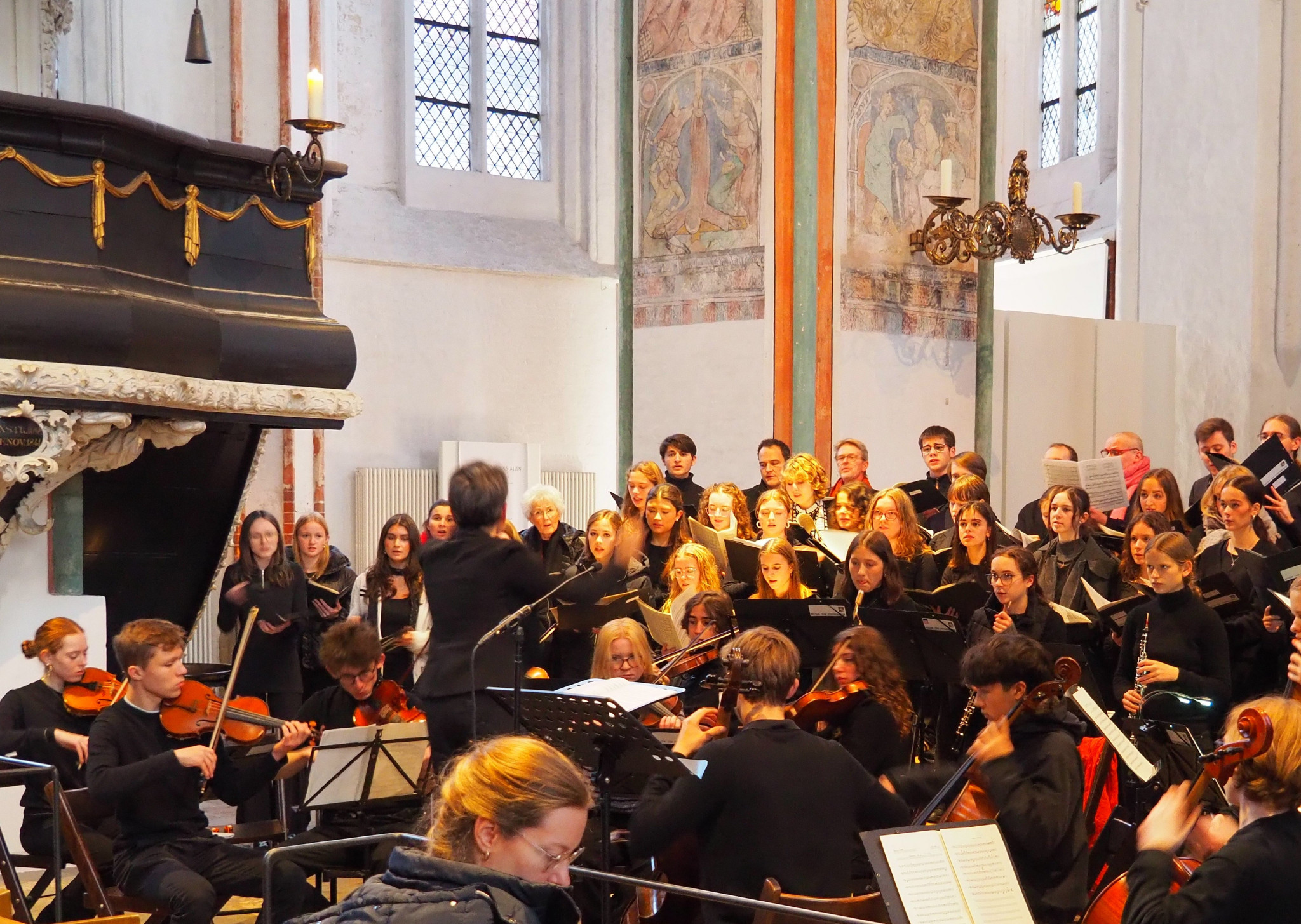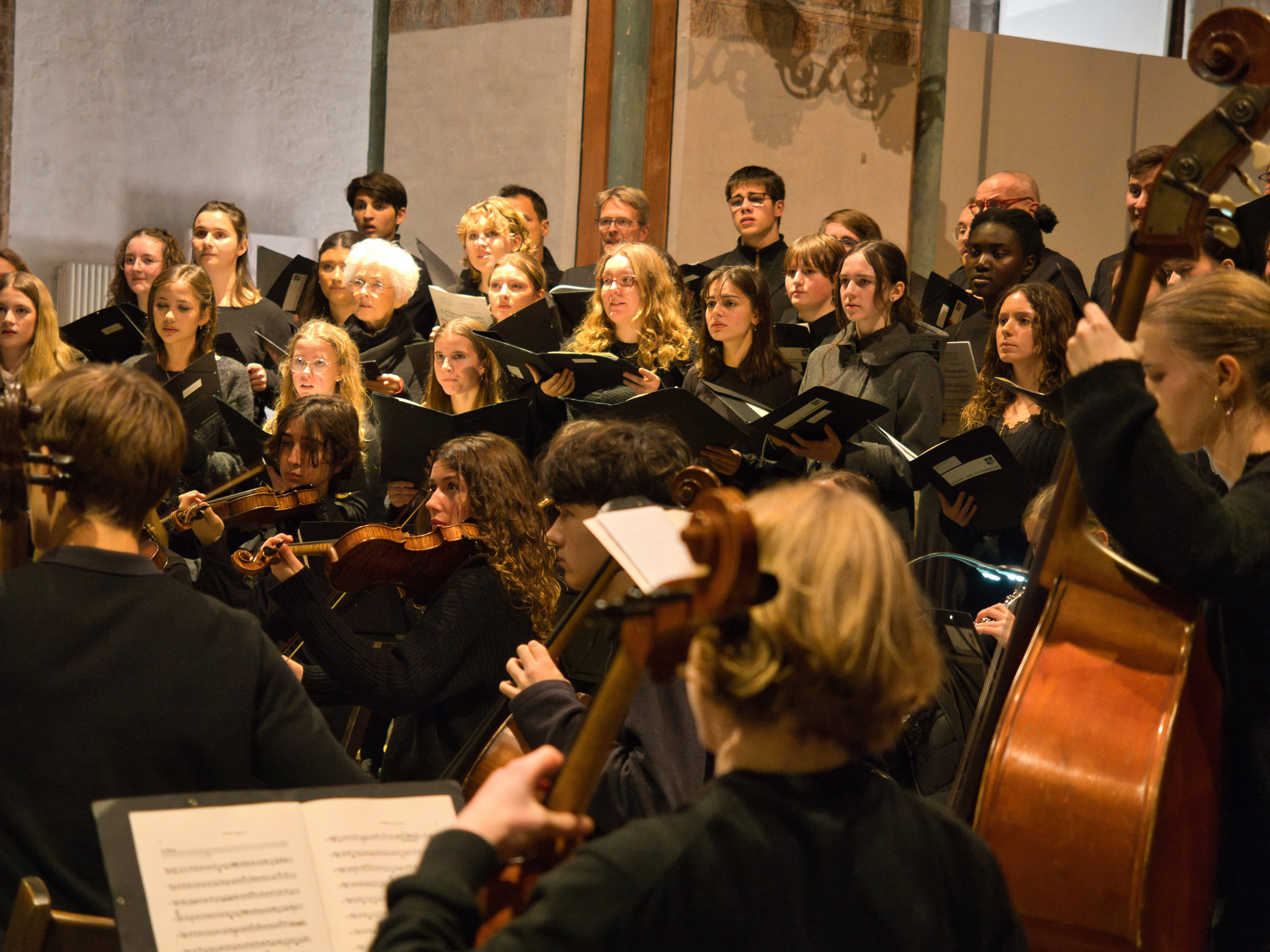 Bevor es in die Kirche ging, trafen sich der von Frau Salomon geleitete ELF-Chor und der Oberstufenchor zunächst im Gemeindesaal von St. Jacobi. Es wurde gemeinsam geprobt und letzte Einsätze abgeglichen. Anschließend begann die Generalprobe zusammen mit dem Kammerorchester des Johanneums. Die Kirche war nur wenig beheizt, doch diese kühle Umgebung war kein Nachteil, sondern ein Teil der besonderen Stimmung: klar, ruhig und offen für den Klang. In dieser mehr oder weniger kalten Kirche entwickelte sich ein sehr intensiver Probenmoment, in dem alle Beteiligten spürten, wie die Musik zu wirken begann.