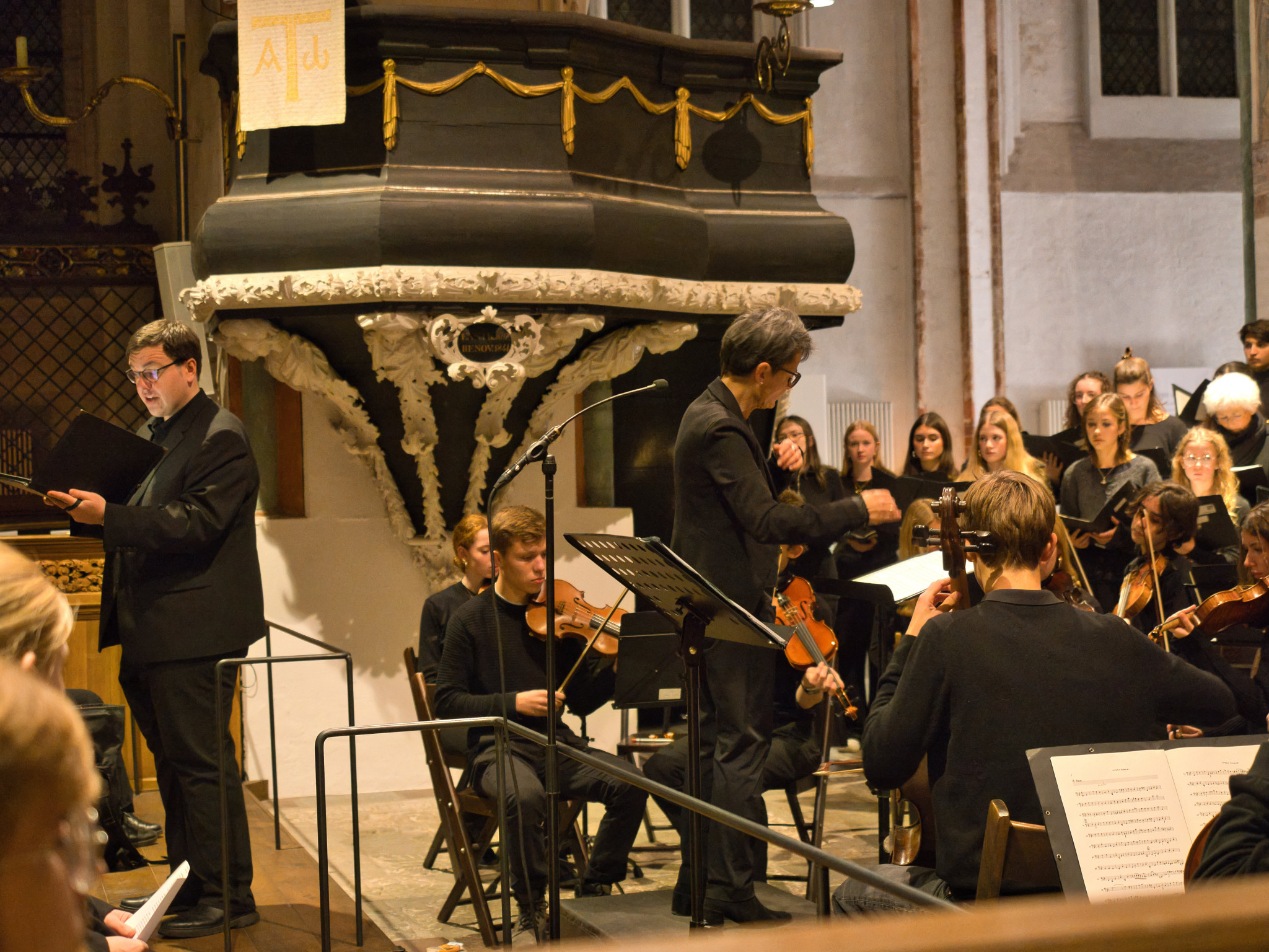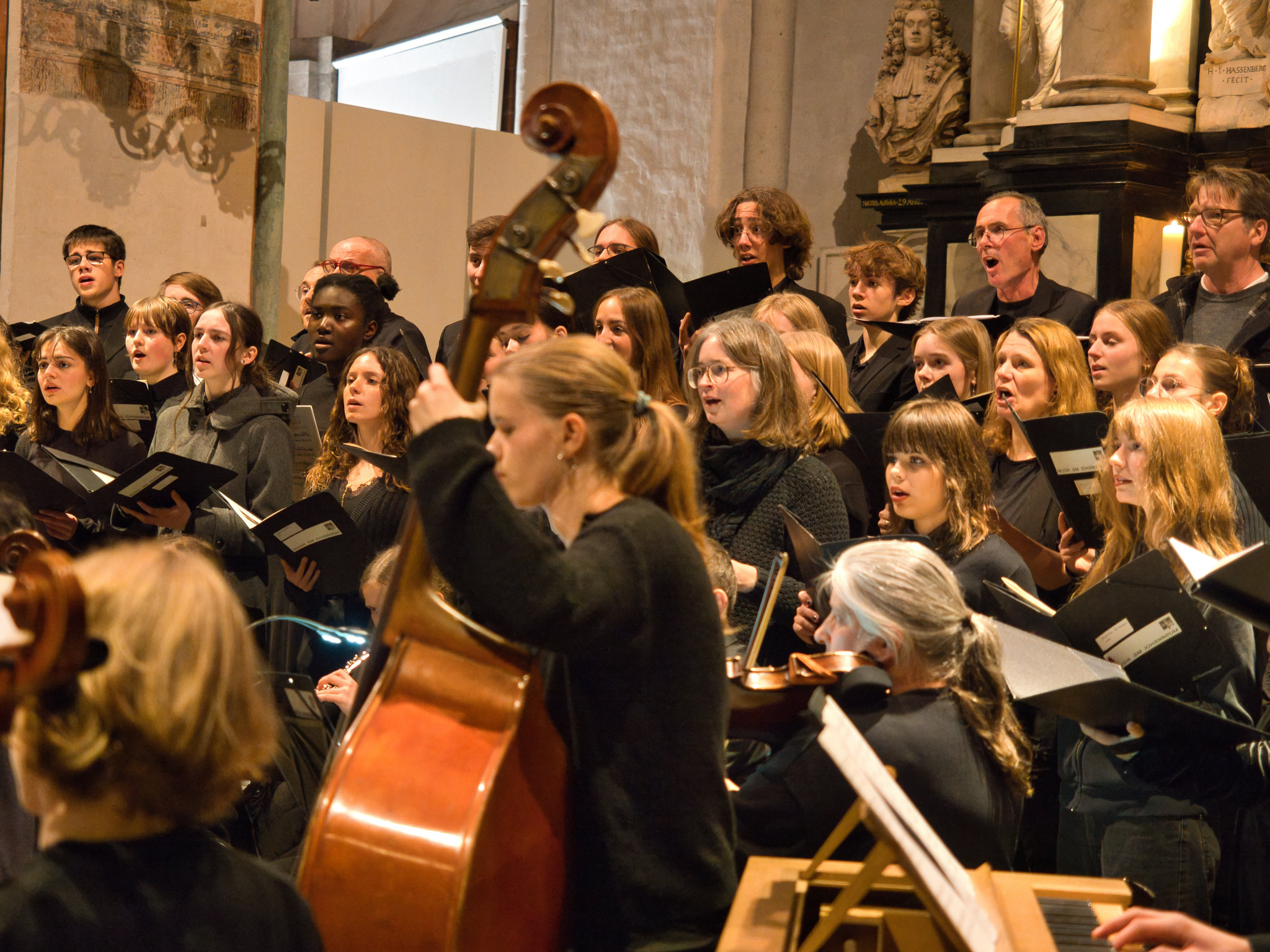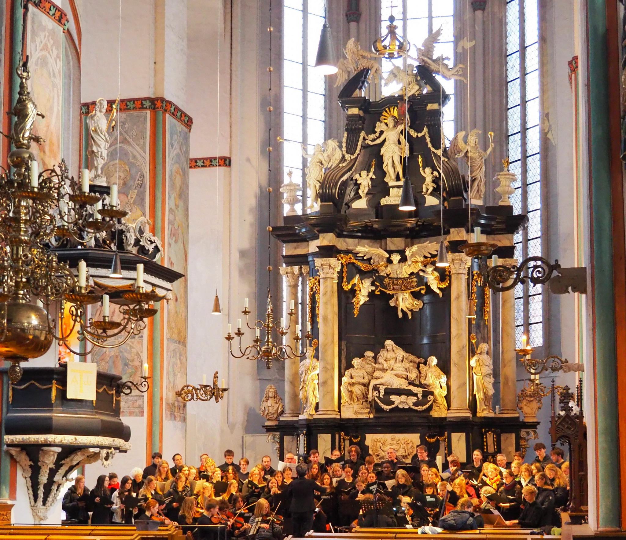 Bevor es in die Kirche ging, trafen sich der von Frau Salomon geleitete ELF-Chor und der Oberstufenchor zunächst im Gemeindesaal von St. Jacobi. Es wurde gemeinsam geprobt und letzte Einsätze abgeglichen. Anschließend begann die Generalprobe zusammen mit dem Kammerorchester des Johanneums. Die Kirche war nur wenig beheizt, doch diese kühle Umgebung war kein Nachteil, sondern ein Teil der besonderen Stimmung: klar, ruhig und offen für den Klang. In dieser mehr oder weniger kalten Kirche entwickelte sich ein sehr intensiver Probenmoment, in dem alle Beteiligten spürten, wie die Musik zu wirken begann.