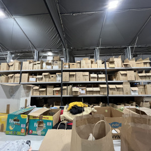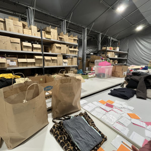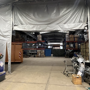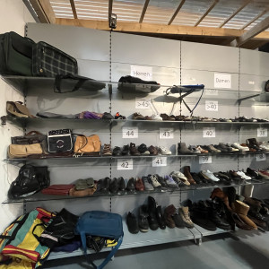 Was ist nun gemeint mit „Schritt für Schritt“? Die Kleidung wird zunächst in einer großen Halle in der Nähe der Gollan Werft gesammelt. Dort stehen große Regale unter einem großen Zelt. Diese halten mehr Gewicht aus als die besten IKEA Regale, weil darauf eine kleine Kleiderkammer mit Büro gebaut wurde.