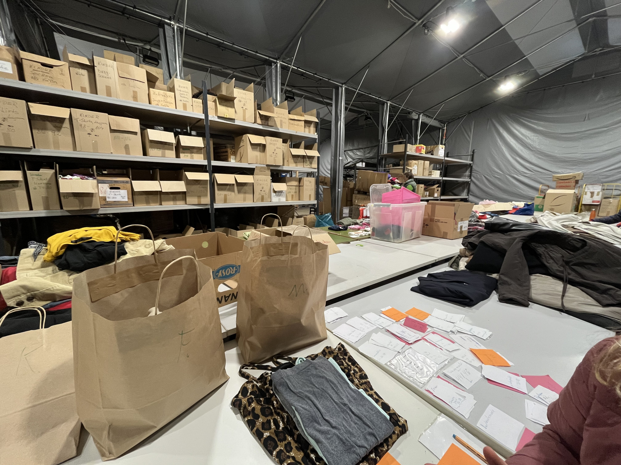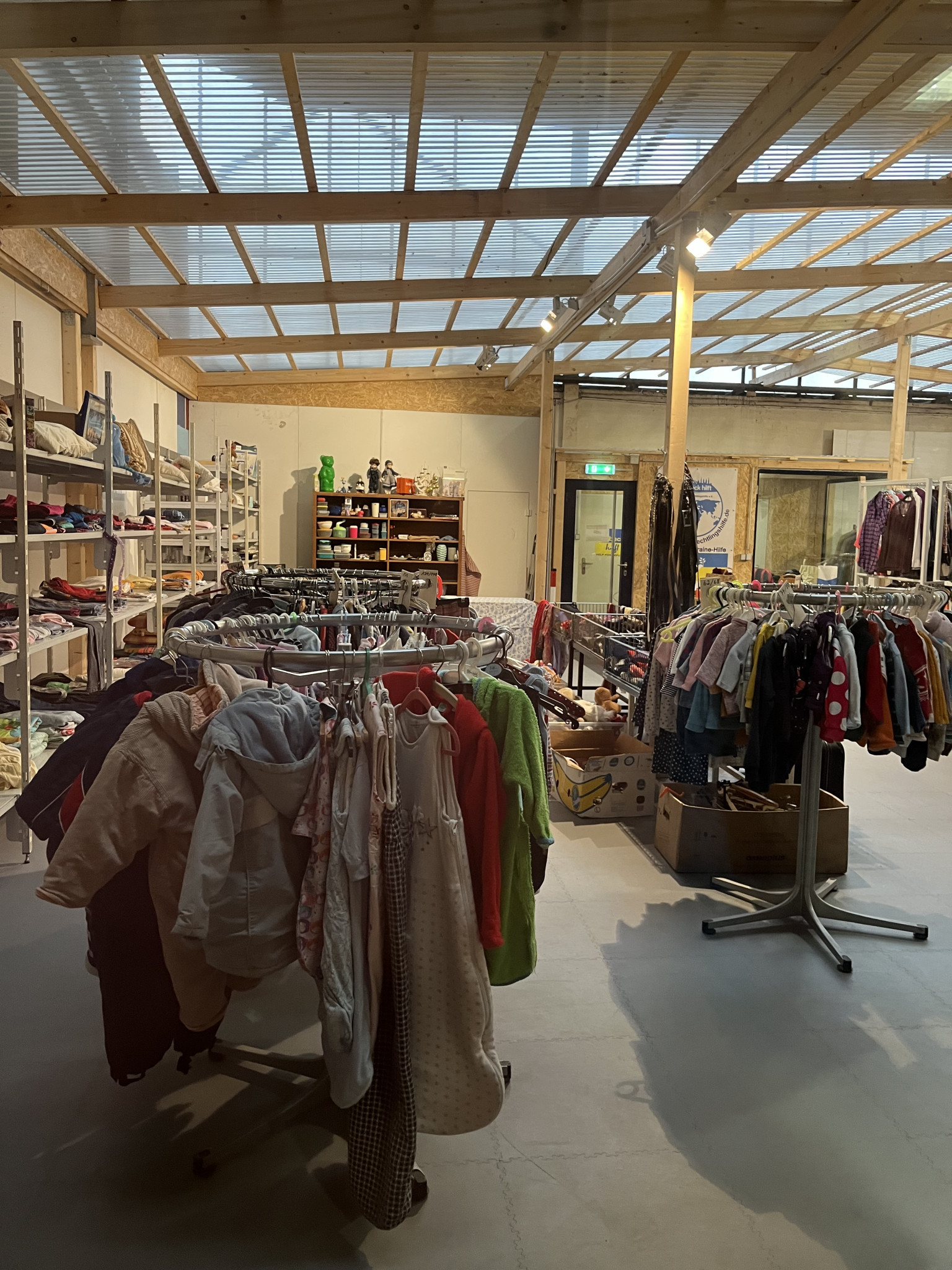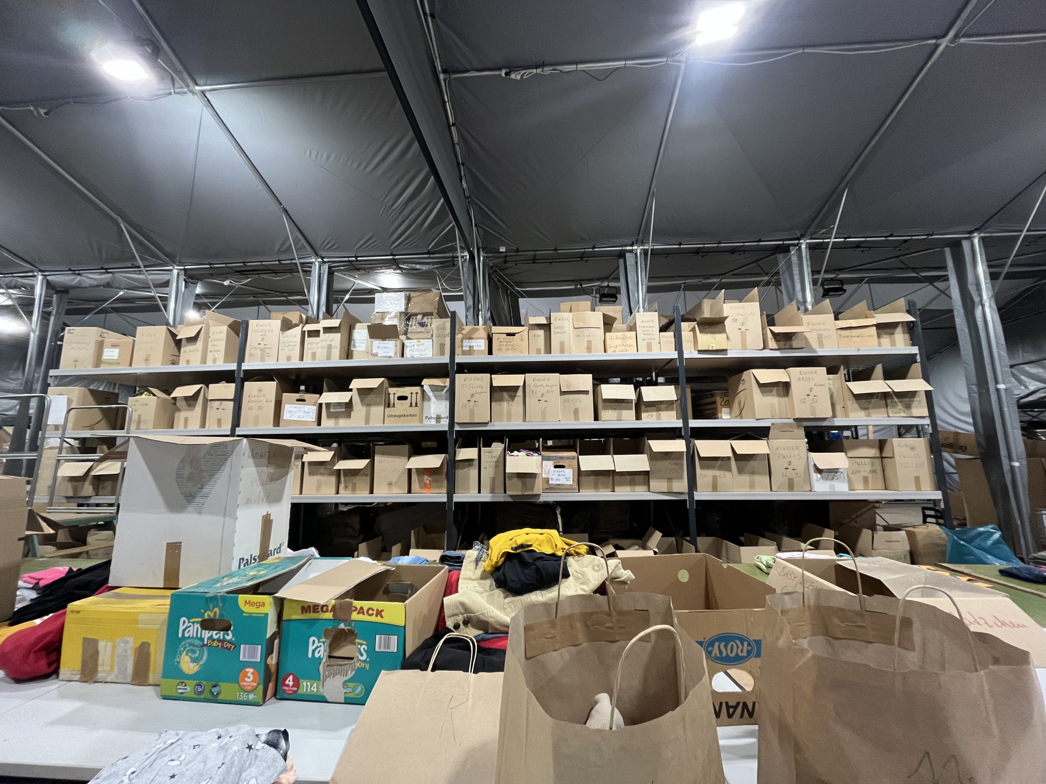 Was ist nun gemeint mit „Schritt für Schritt“? Die Kleidung wird zunächst in einer großen Halle in der Nähe der Gollan Werft gesammelt. Dort stehen große Regale unter einem großen Zelt. Diese halten mehr Gewicht aus als die besten IKEA Regale, weil darauf eine kleine Kleiderkammer mit Büro gebaut wurde.