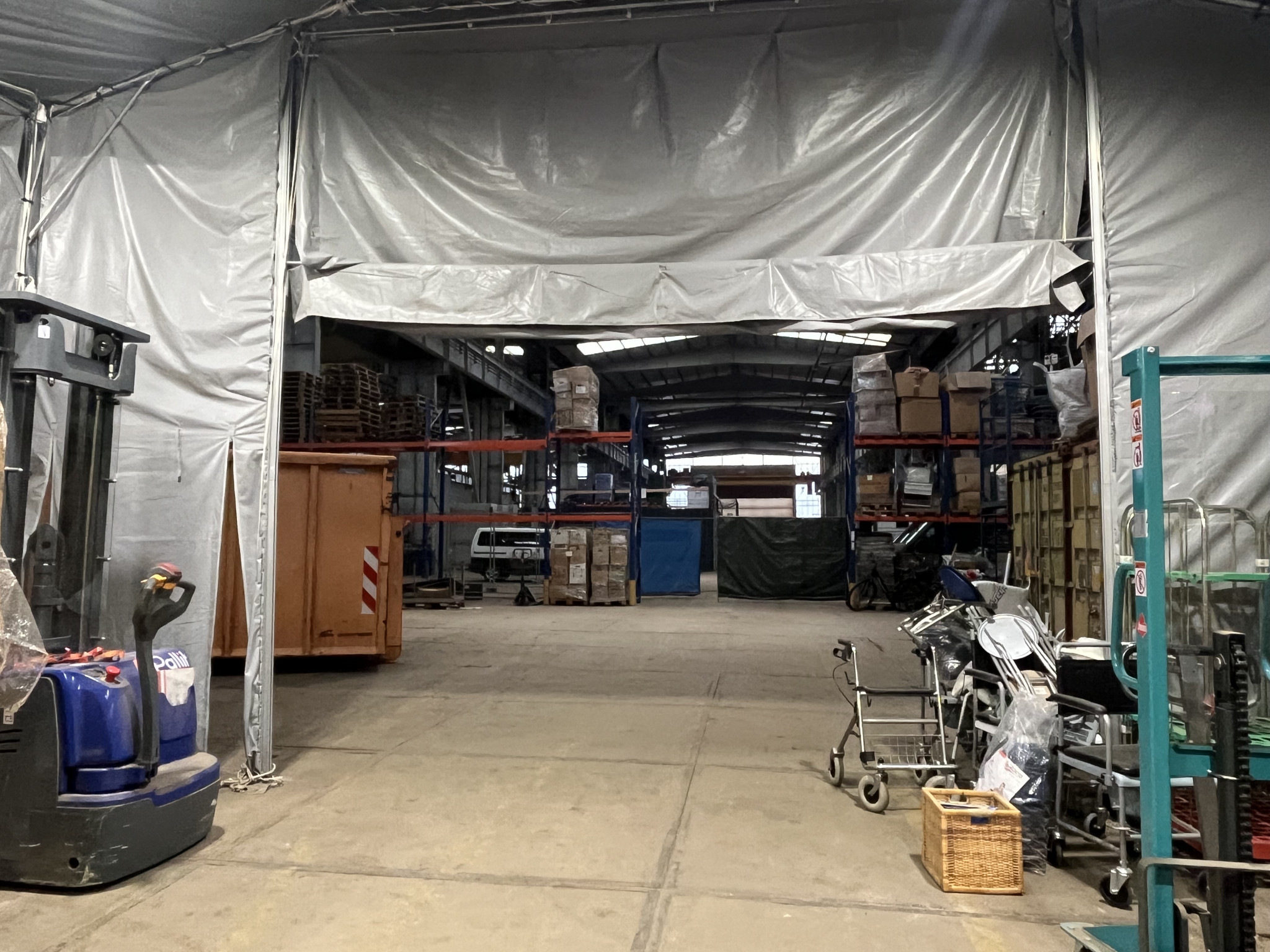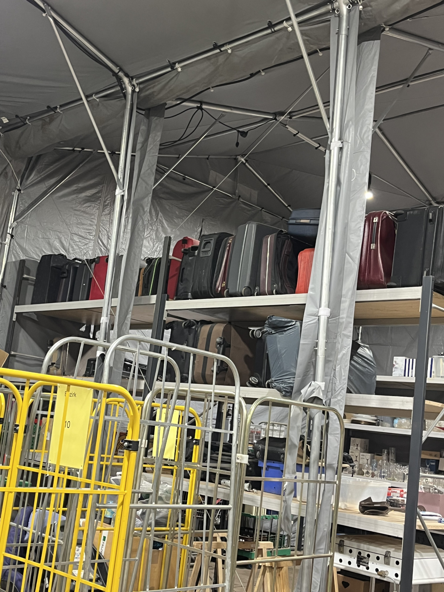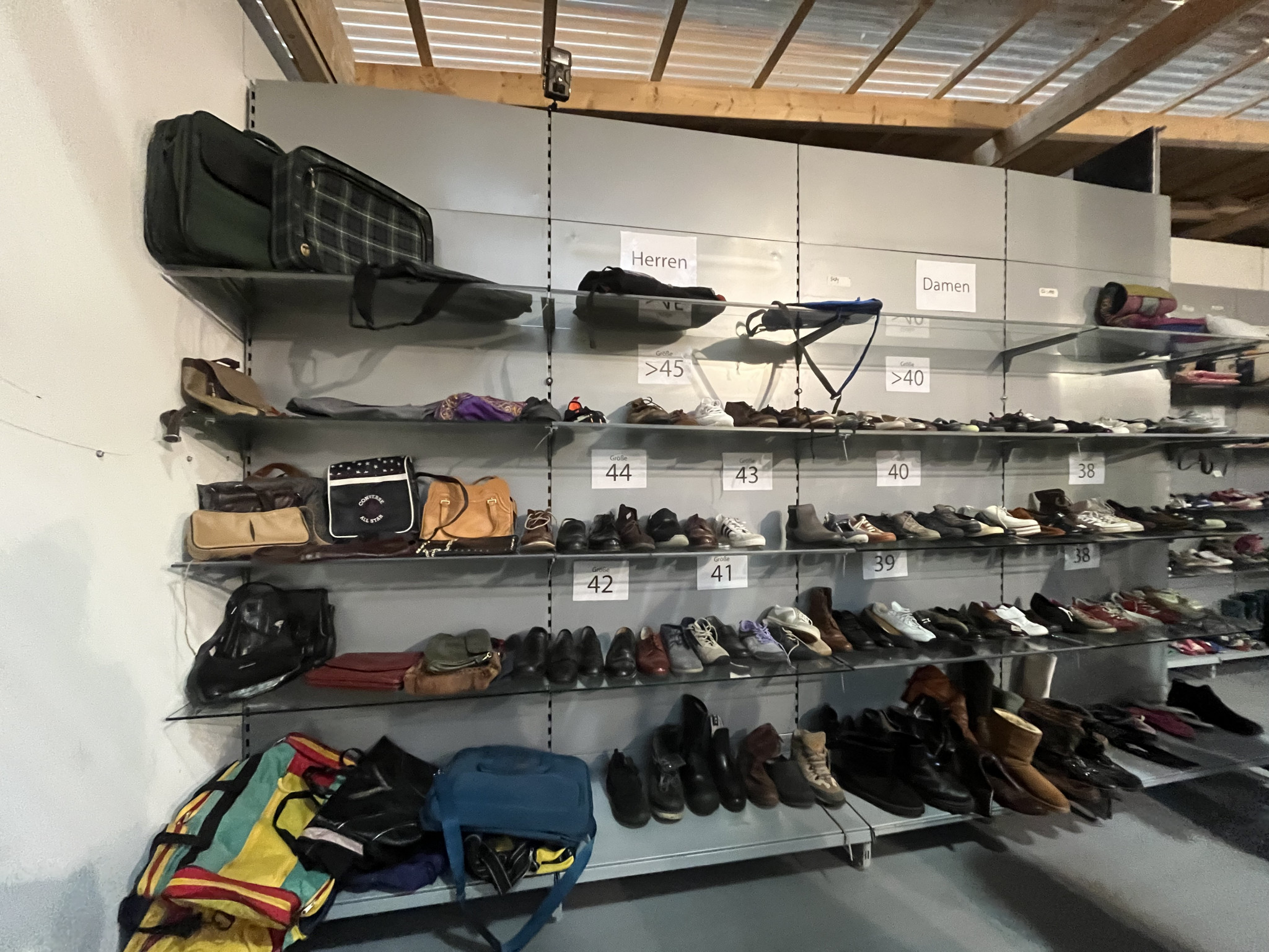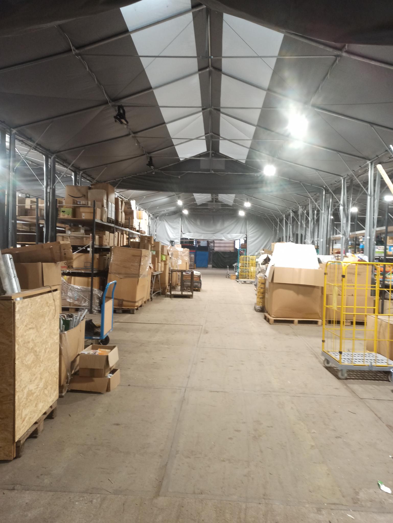 Was ist nun gemeint mit „Schritt für Schritt“? Die Kleidung wird zunächst in einer großen Halle in der Nähe der Gollan Werft gesammelt. Dort stehen große Regale unter einem großen Zelt. Diese halten mehr Gewicht aus als die besten IKEA Regale, weil darauf eine kleine Kleiderkammer mit Büro gebaut wurde.