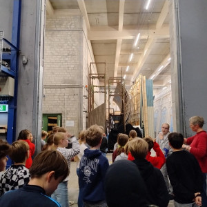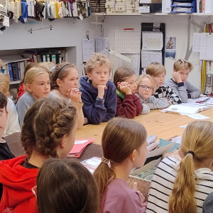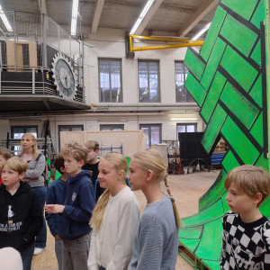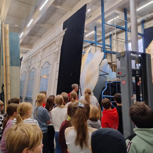 Es gibt im Theater einen großen Malsaal, in dem die Bühnenbilder Farbe bekomen. Außerdem gibt es eine eigene Tischlerei, in der die Kulissen und Hintergründe gebaut werden. Wir konnten schon einzelne Elemente, die im Stück eingesetzt werden, im Aufbau anschauen. Zum Schluss haben wir die Schneiderei beucht. Dort wurde uns erklärt, was man beim Schneidern der Kostüme beachten sollte.