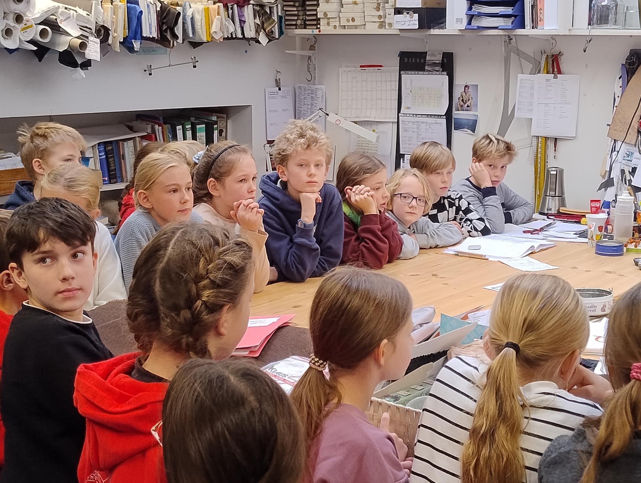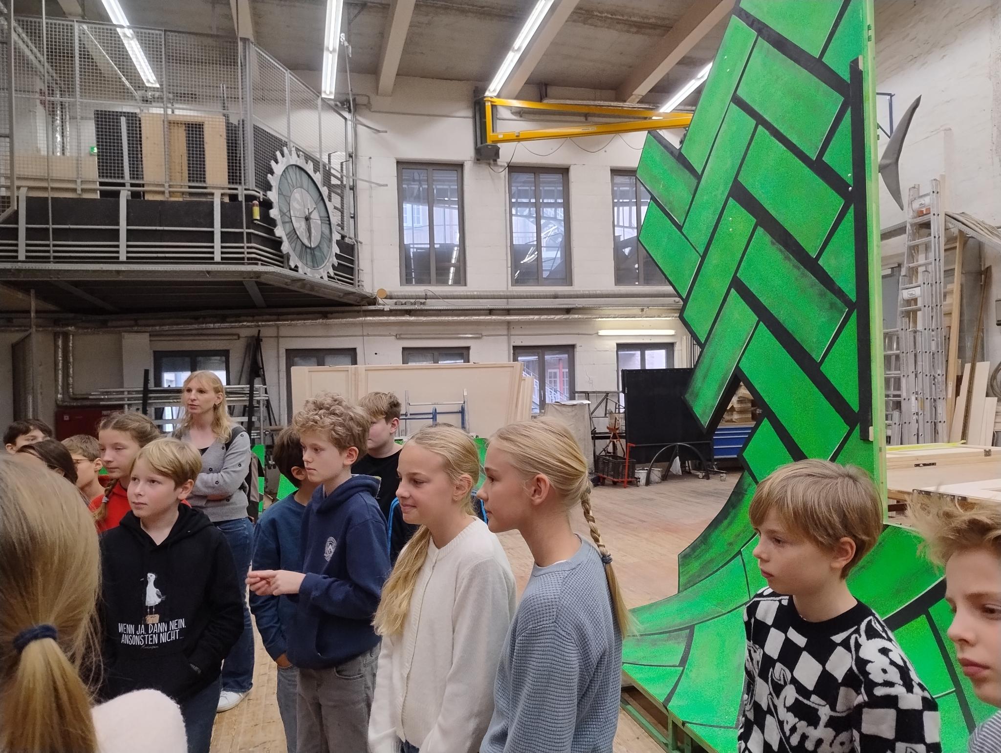Es gibt im Theater einen großen Malsaal, in dem die Bühnenbilder Farbe bekomen. Außerdem gibt es eine eigene Tischlerei, in der die Kulissen und Hintergründe gebaut werden. Wir konnten schon einzelne Elemente, die im Stück eingesetzt werden, im Aufbau anschauen. Zum Schluss haben wir die Schneiderei beucht. Dort wurde uns erklärt, was man beim Schneidern der Kostüme beachten sollte.