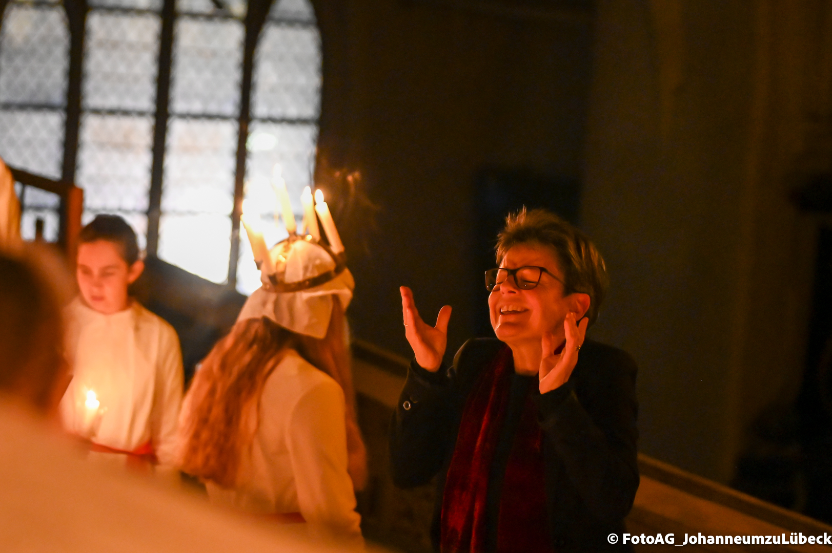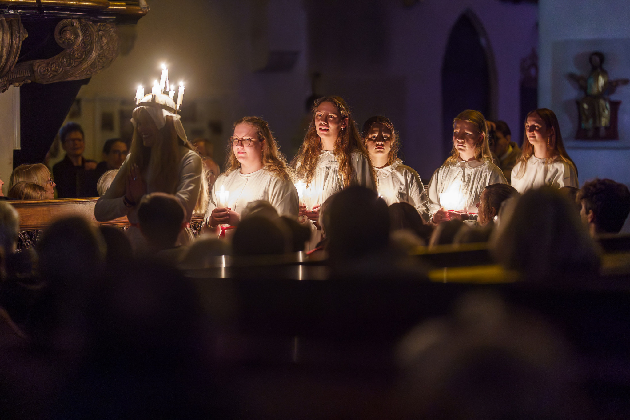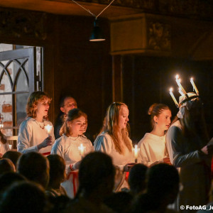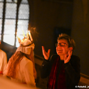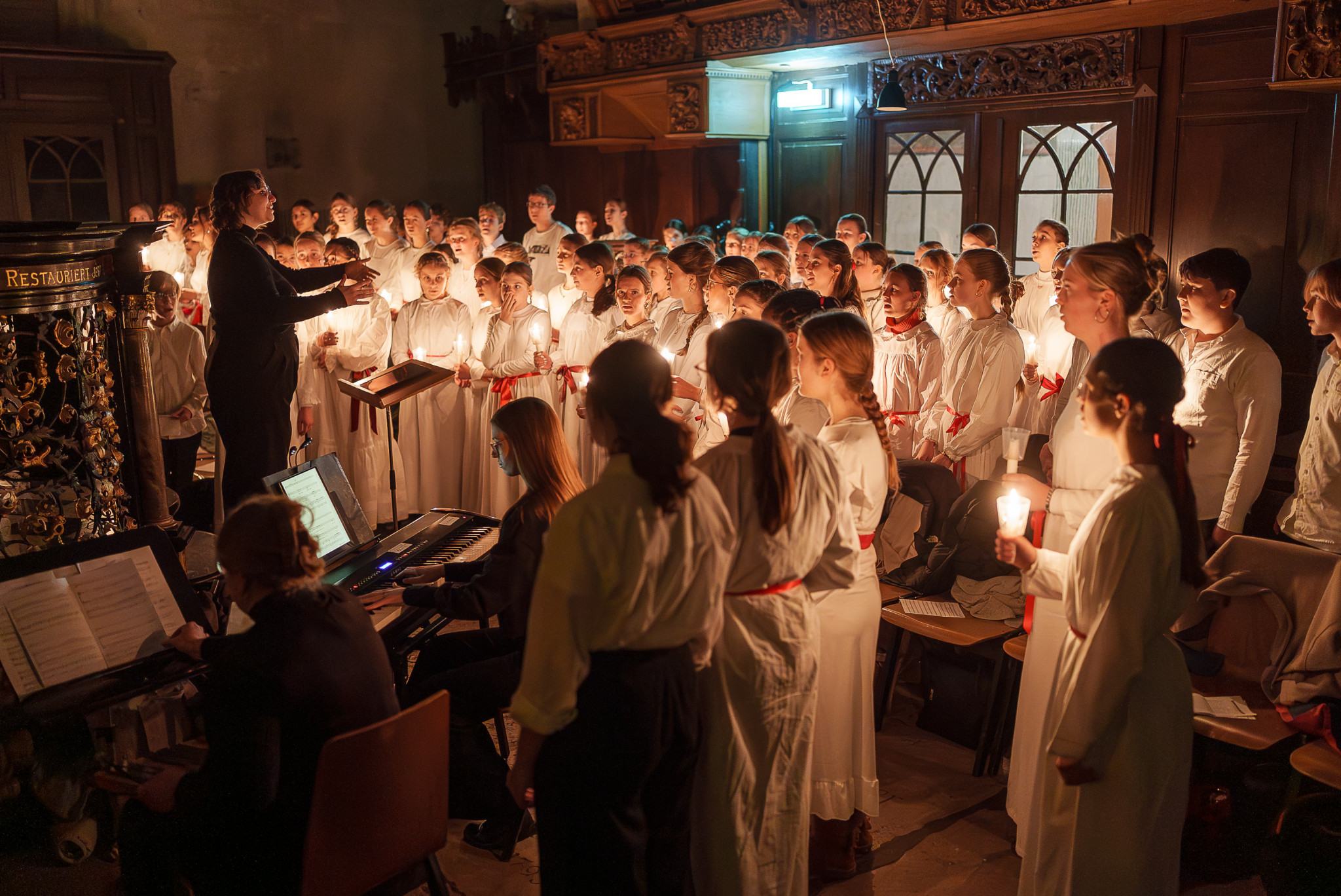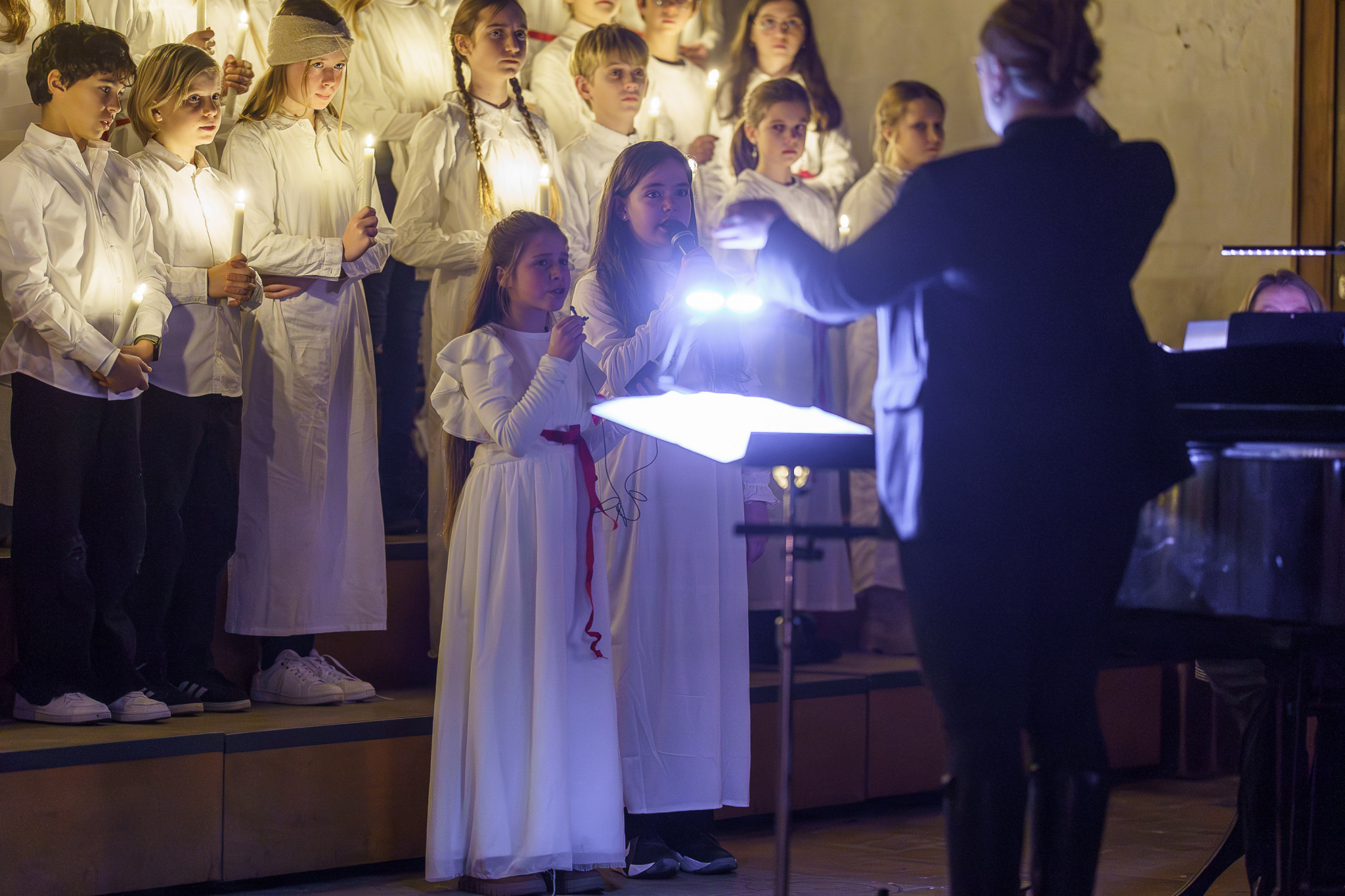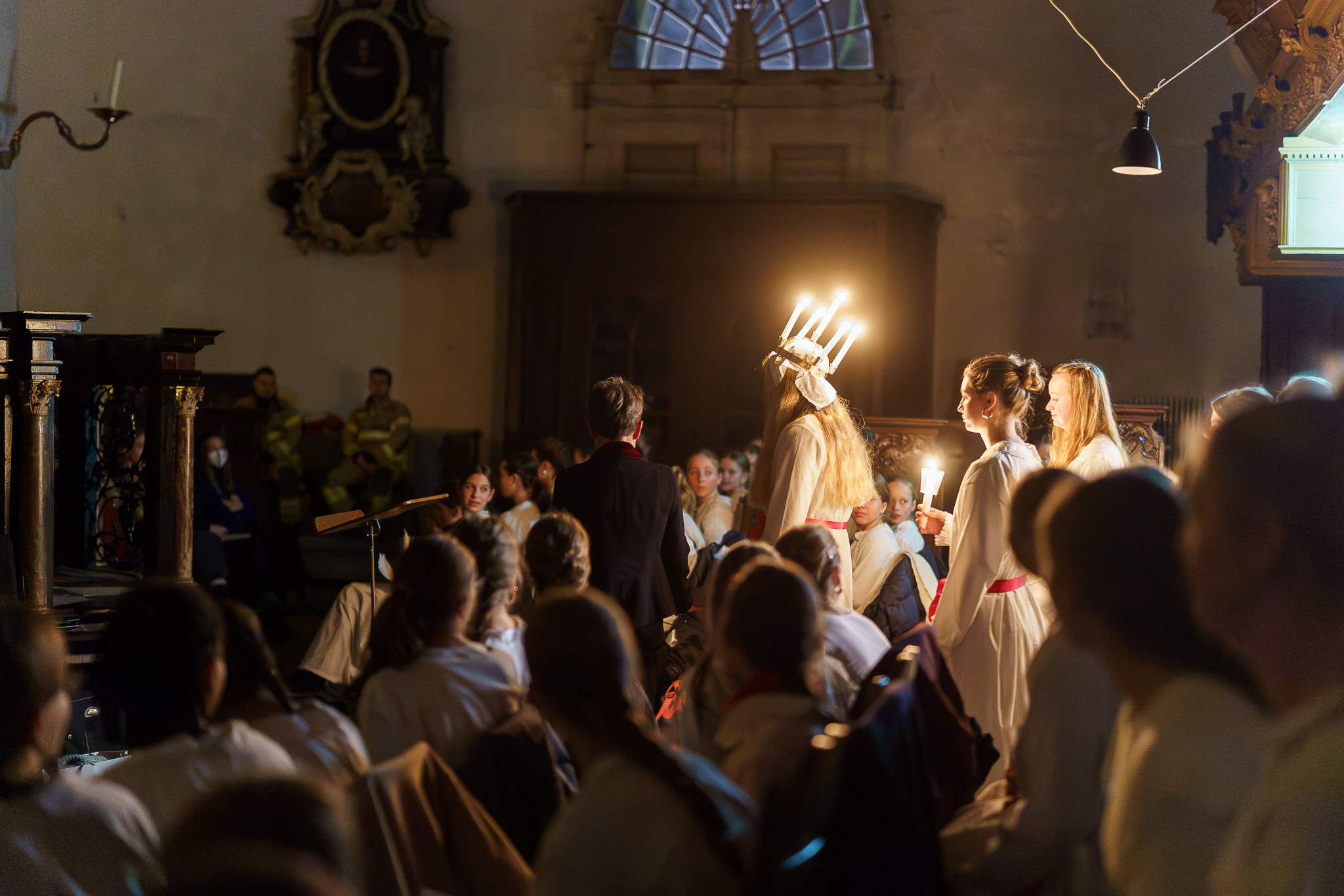 Zweimal füllte sich der Kirche an diesem Tag bis auf den letzten Platz, das Licht ging aus und es wurde still in der Kirche. Nach der von zwei Kindern solistisch gesungenen Ankündigung der Lichterkönigin kam die Lucia herein und brachte das Kerzenlicht, das dann in allen Chören verbreitet wurde. Im Konzert wurden Lieder aus verschiedenen Ländern gesungen. Einige auch aus Schweden, wo das Lucia-Fest entstanden ist. Mehrere Schüler:innen beeindruckten durch solistische Vorträge.