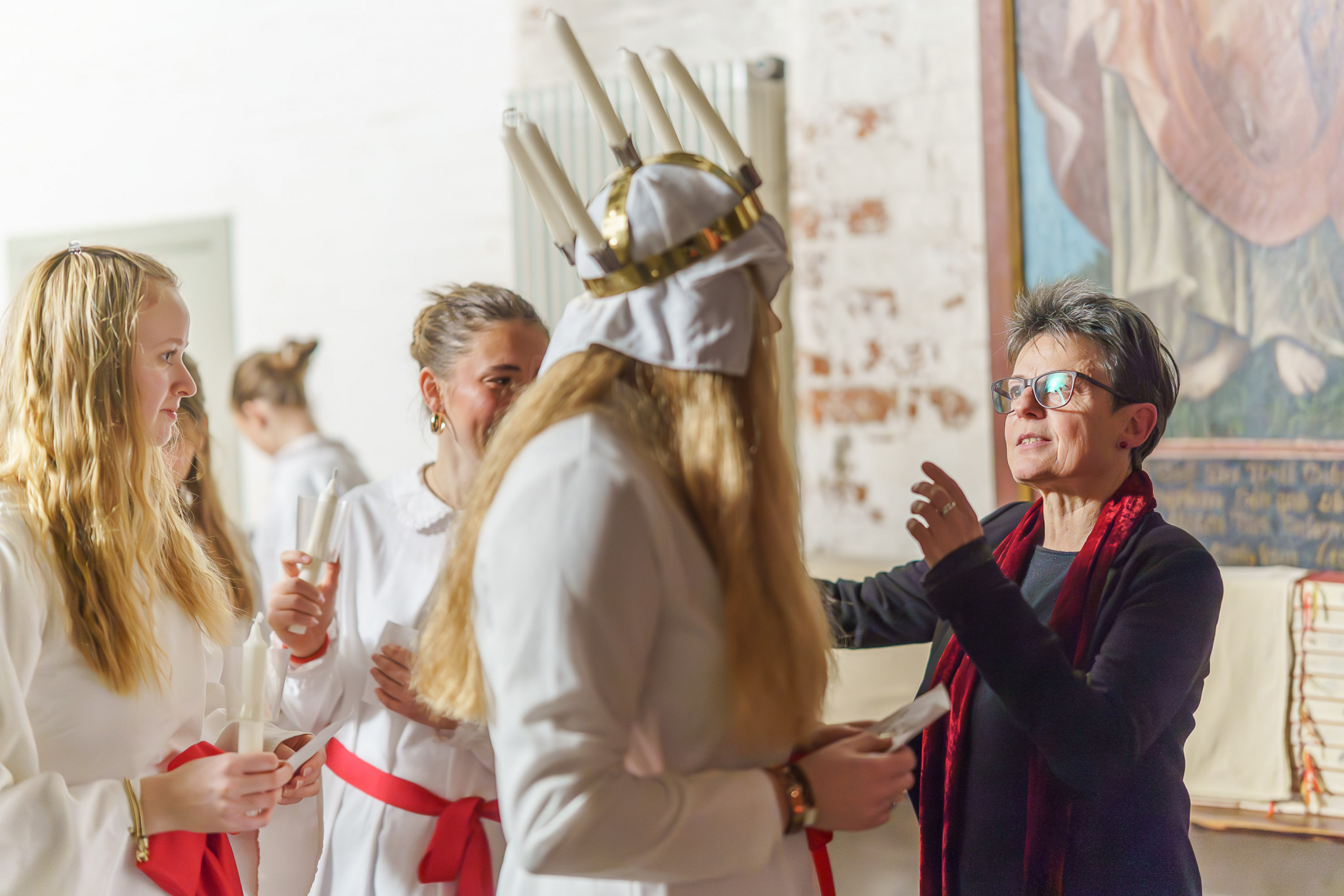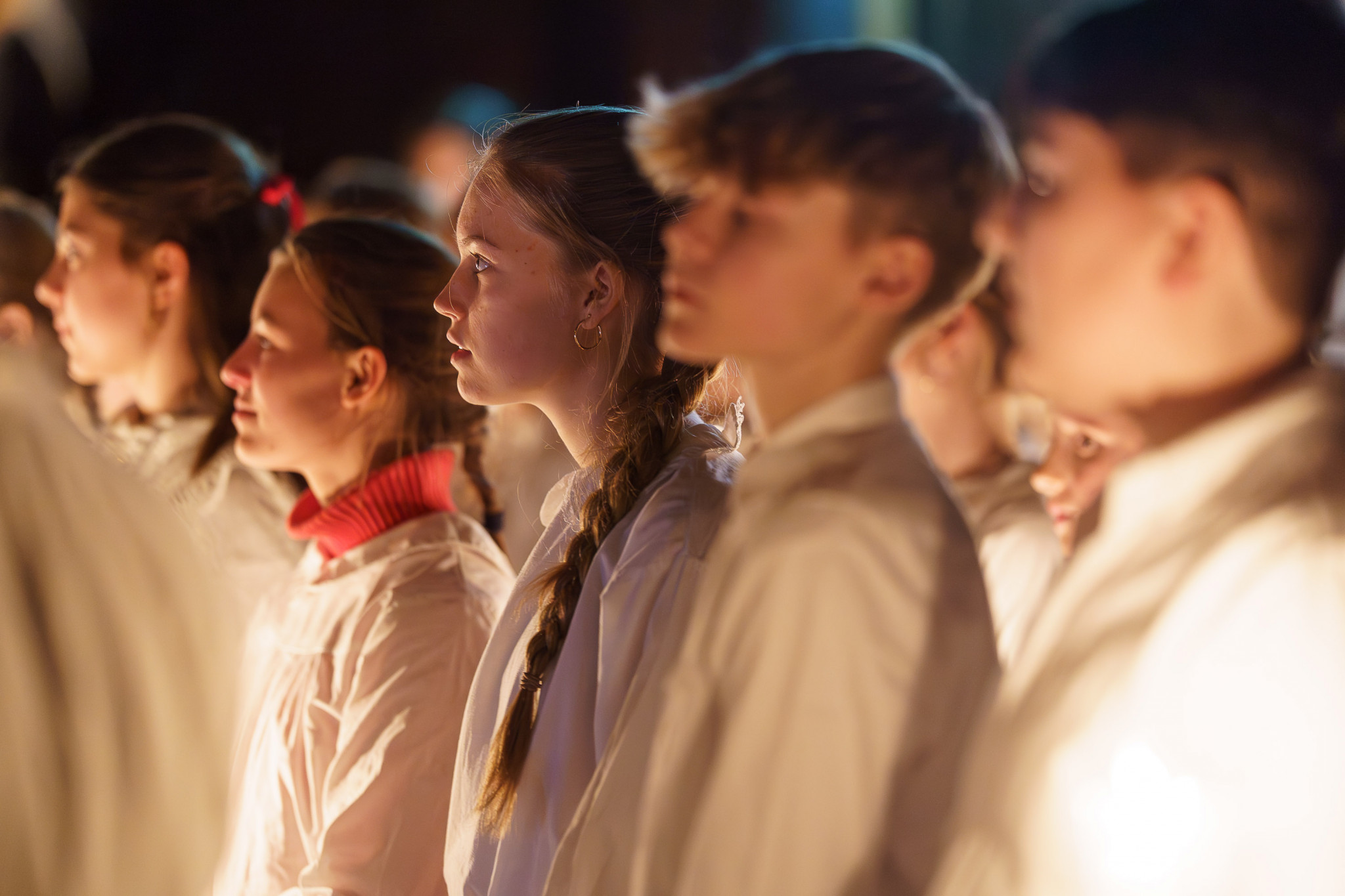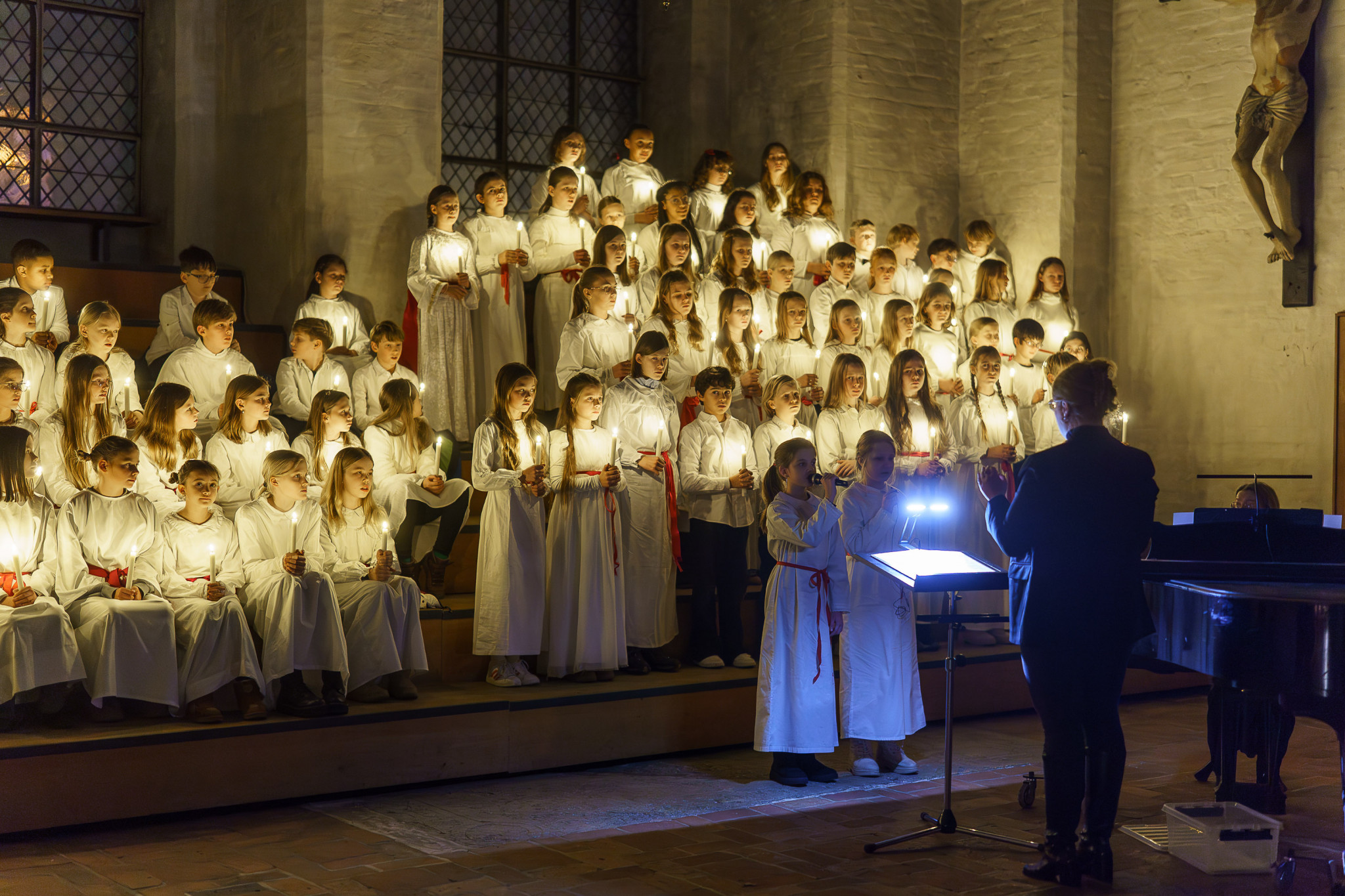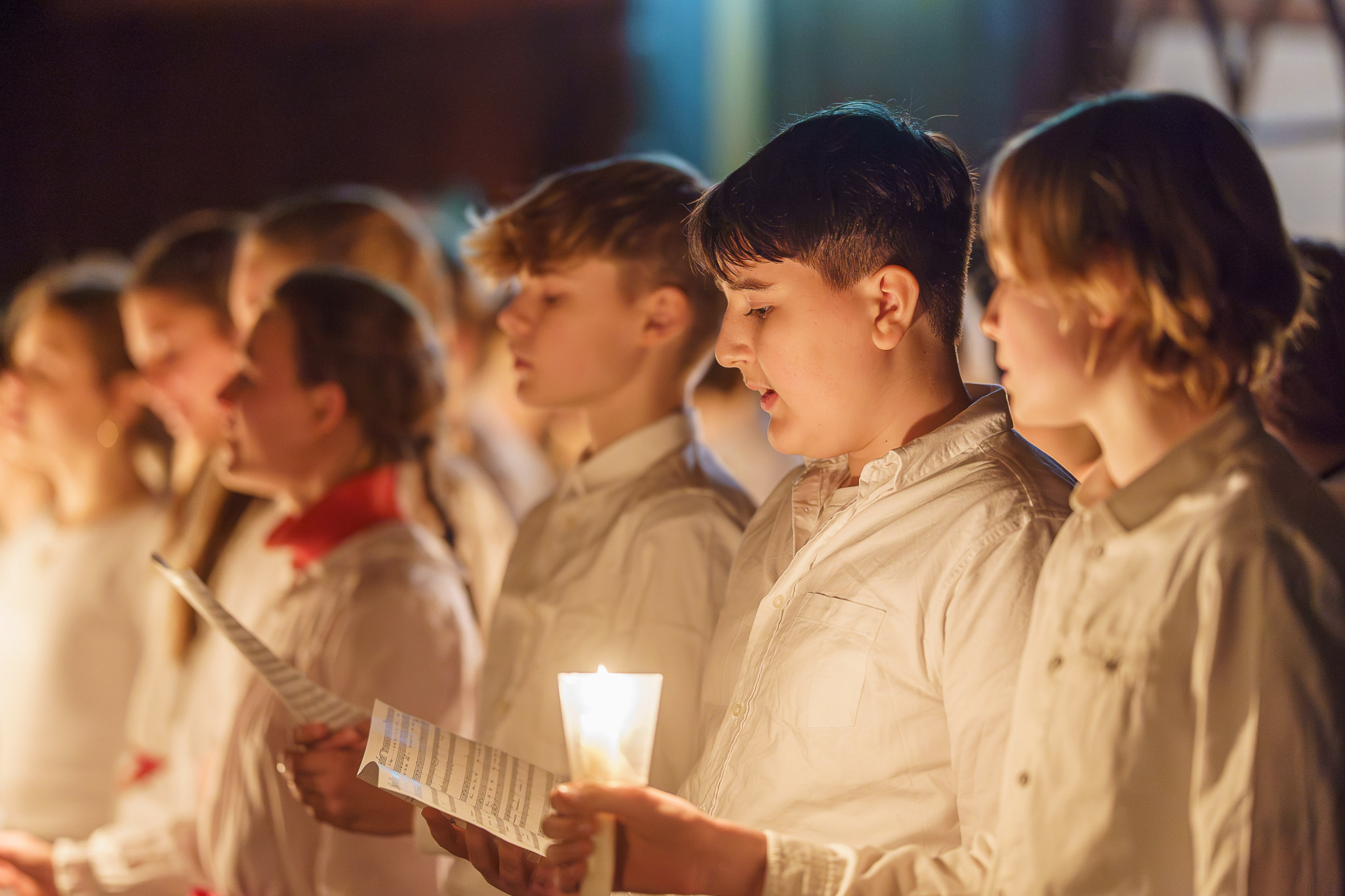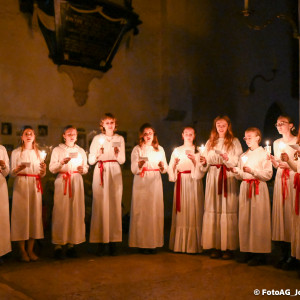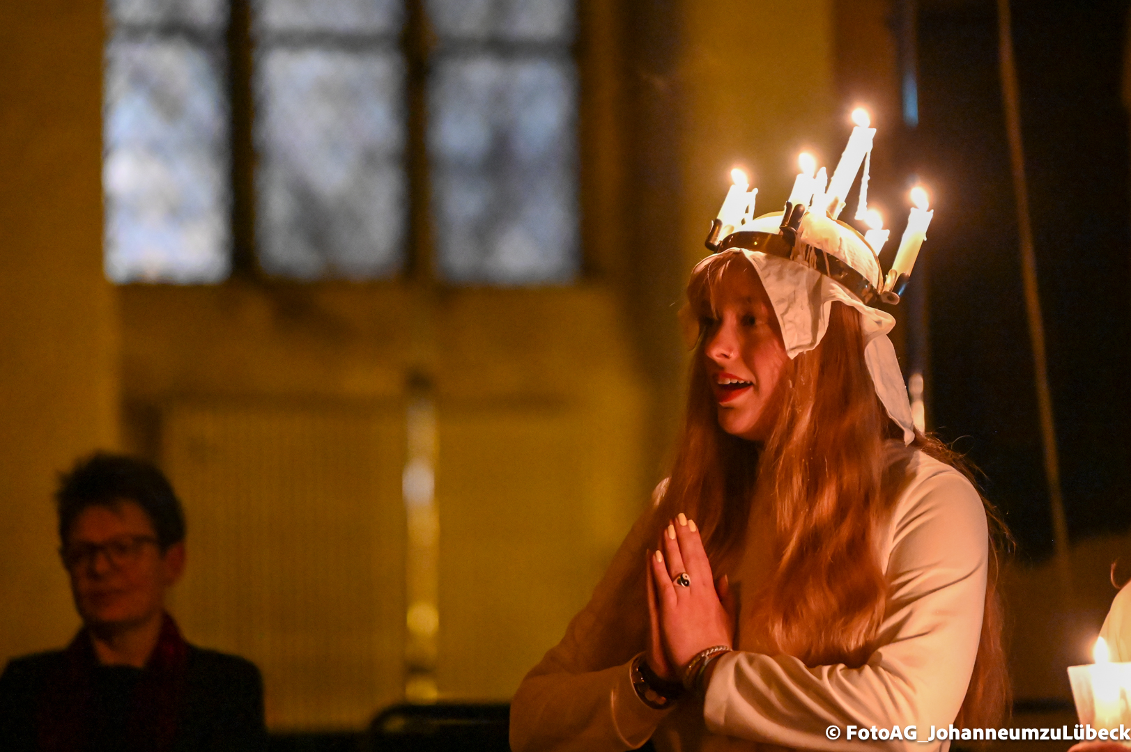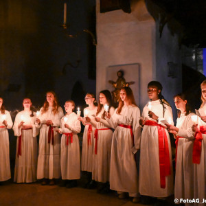 Zweimal füllte sich der Kirche an diesem Tag bis auf den letzten Platz, das Licht ging aus und es wurde still in der Kirche. Nach der von zwei Kindern solistisch gesungenen Ankündigung der Lichterkönigin kam die Lucia herein und brachte das Kerzenlicht, das dann in allen Chören verbreitet wurde. Im Konzert wurden Lieder aus verschiedenen Ländern gesungen. Einige auch aus Schweden, wo das Lucia-Fest entstanden ist. Mehrere Schüler:innen beeindruckten durch solistische Vorträge.