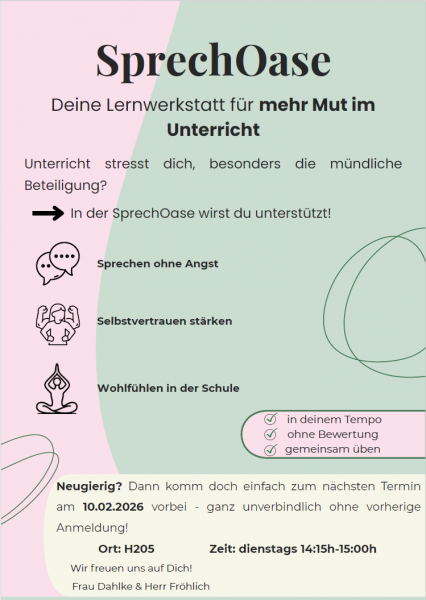In unserer neu gegründeten Lernwerkstatt SprechOase möchten wir euch dabei unterstützen, den Schulalltag entspannter zu erleben. Ihr lernt Methoden und Strategien kennen, die euch dabei unterstützen, selbstbewusster aufzutreten und euch im Unterricht aktiver mündlich einzubringen.
