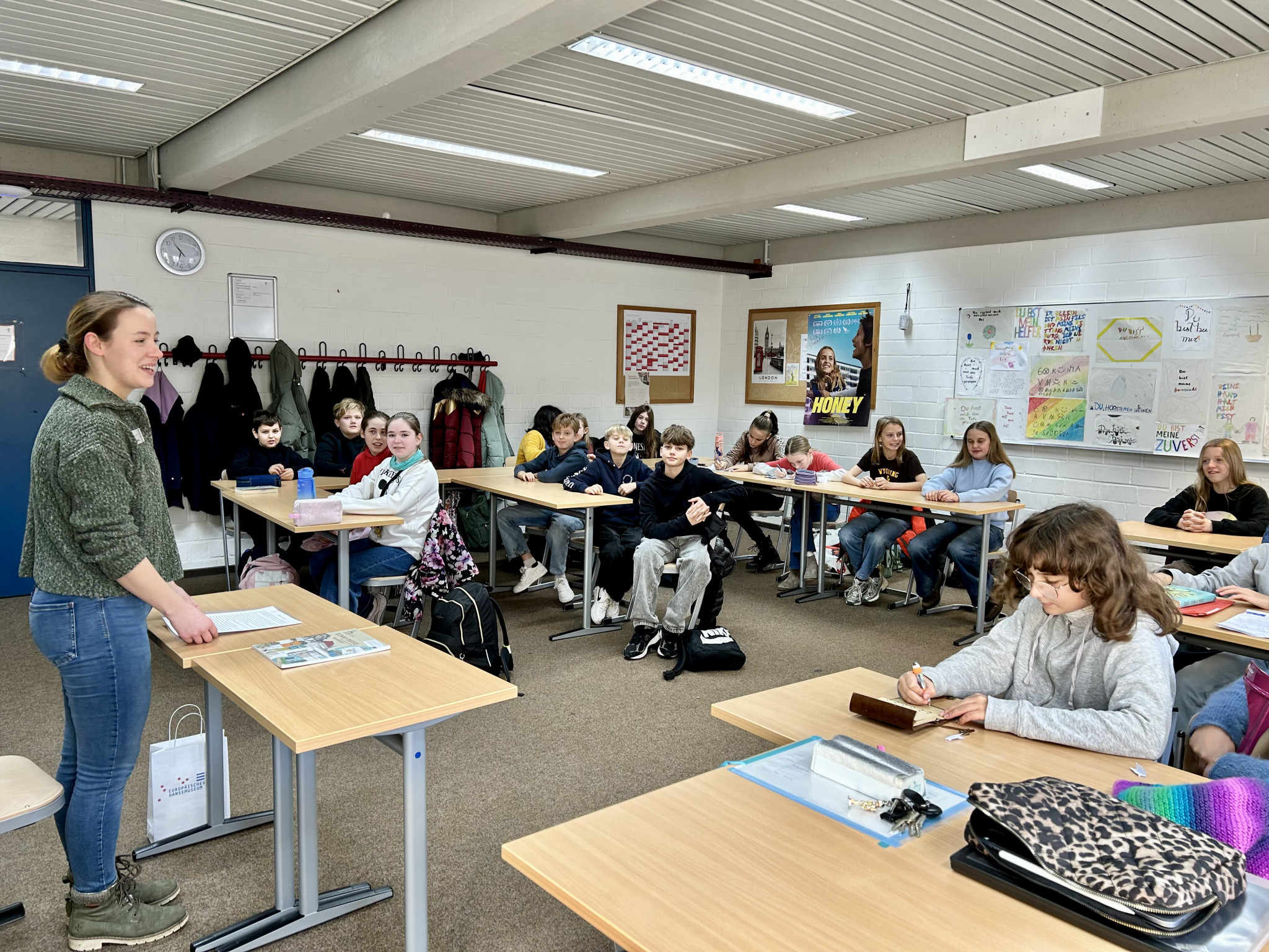 Dann erzählte Frau Lietz noch etwas über sich selbst. Sie ist stellvertretende Teamleiterin des Besucherbetreuerteams, das dafür zuständig ist, Workshops und Führungen zu geben und Fragen zu beantworten. Es gab sehr viel Interessantes, und als Frau Lietz davon erzählte, waren wir so begeistert, dass wollen wir unbedingt auch machen!!!