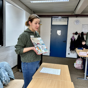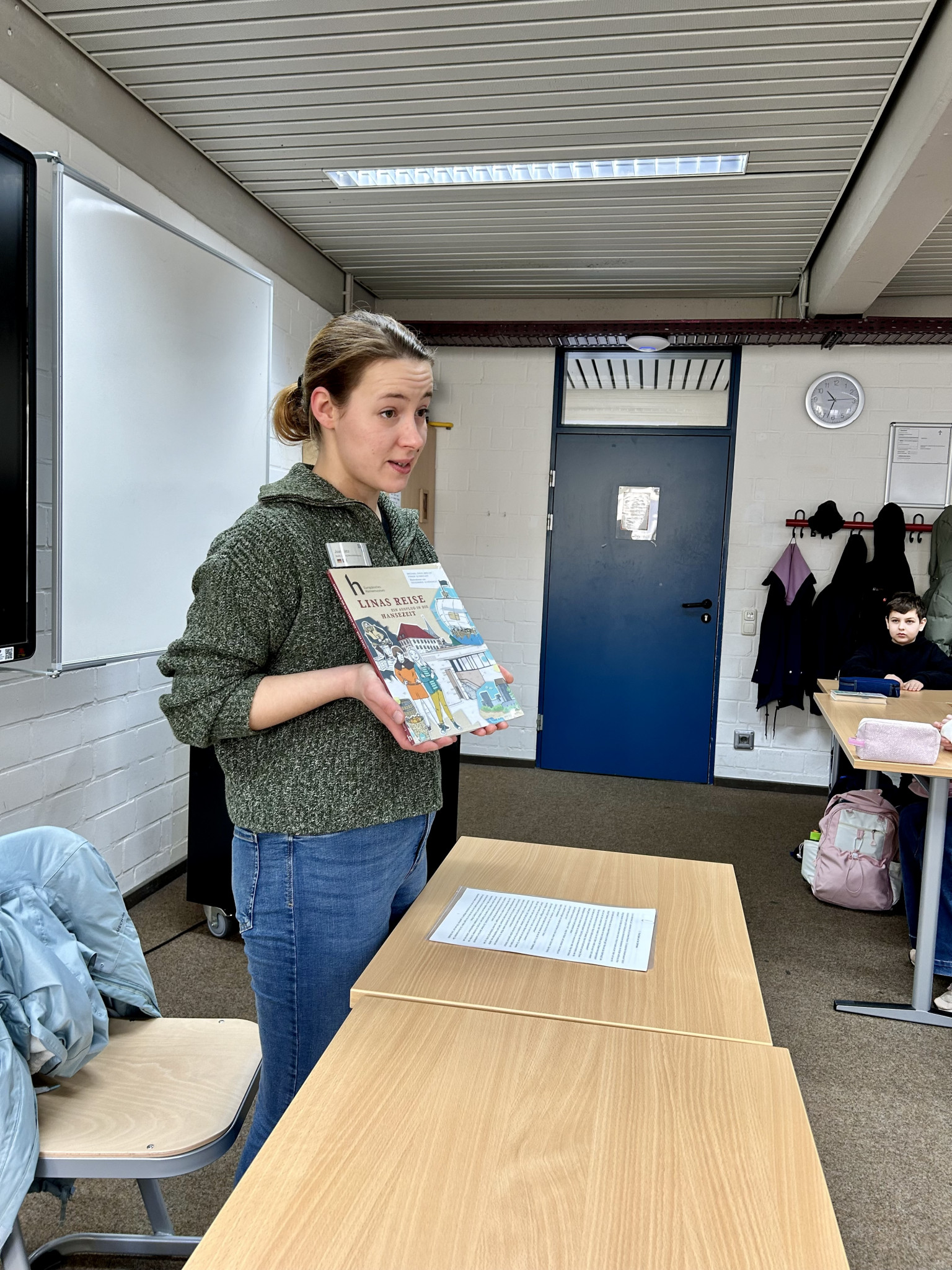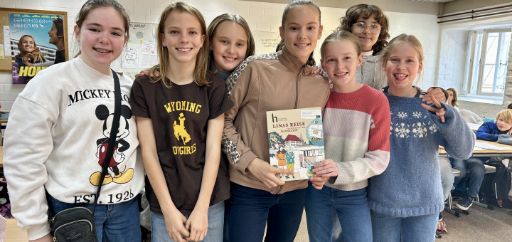 Zum „Welttag des Buches“ wurde uns aus dem Buch „Linas Reise ein Ausflug in die Hansezeit“ vorgelesen. Das Buch wurde von Michael Engelbrecht und Frank Schwieger geschrieben und von Rosemarie Schöningh illustriert. Vorgelesen wurde uns von Frau Lietz, die beim Europäischen Hansemuseum arbeitet. Sie erzählte uns, dass sie eine gekürzte Fassung lesen wird, da das echte Buch mit 81 Seiten zu lang für eine Doppelstunde ist.
