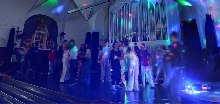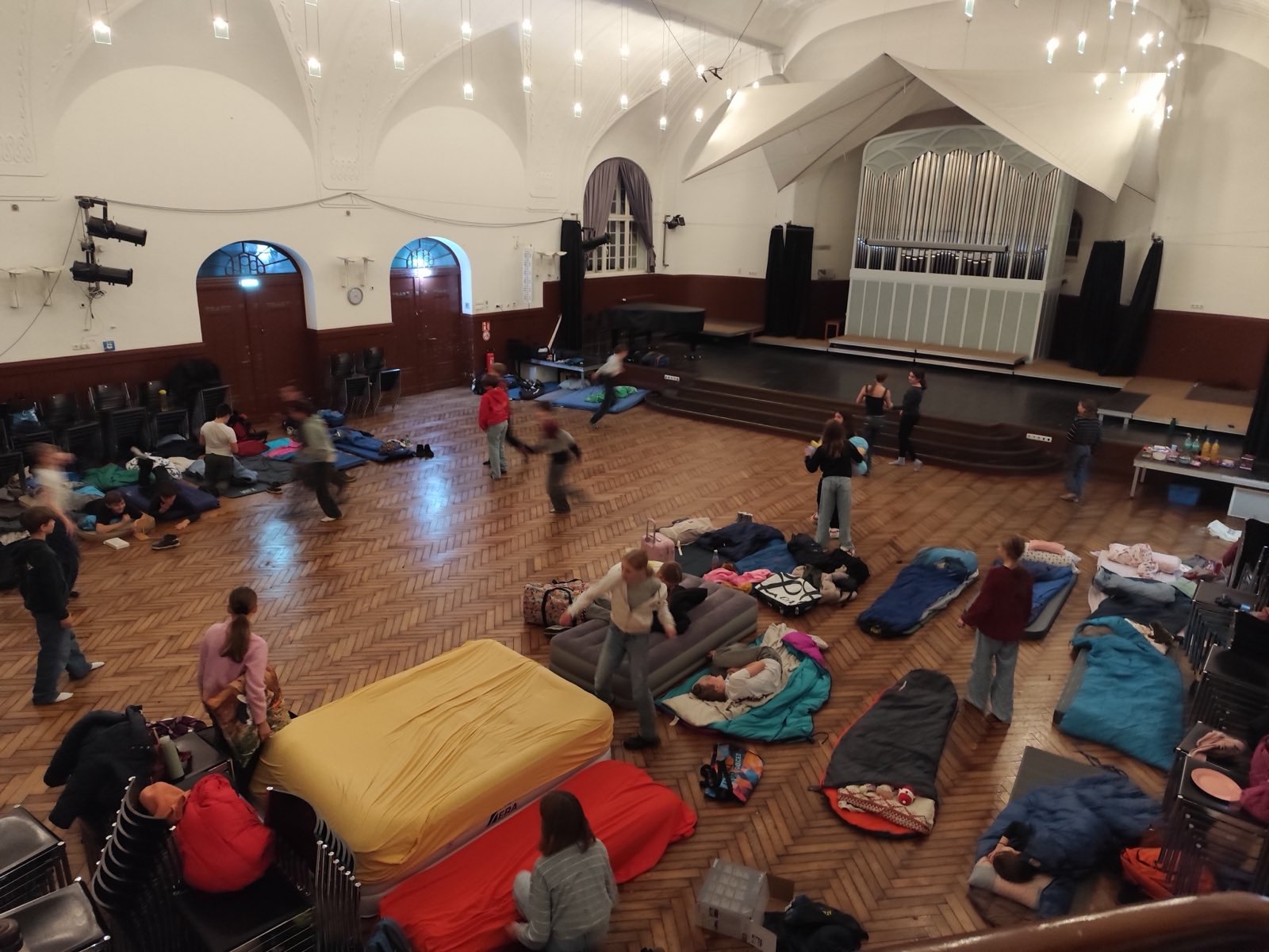 Nach dem Essen wurde es Zeit, die Schlafplätze vorzubereiten. Eigentlich wollte die Klasse in der kleinen Turnhalle übernachten, aber am Ende wurde die Aula zum Schlaflager umfunktioniert – und das war gar nicht schlimm. Nachdem alle ihre Luft- und Isomatten aufgepumpt hatten, gab es ein kleines Buffet und eine große Tanzparty. Stopptanz, Tanzduelle und viele andere Spiele brachten alle zum Lachen und Toben.