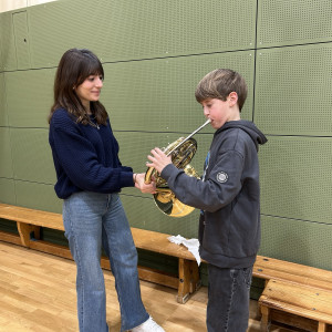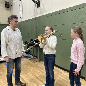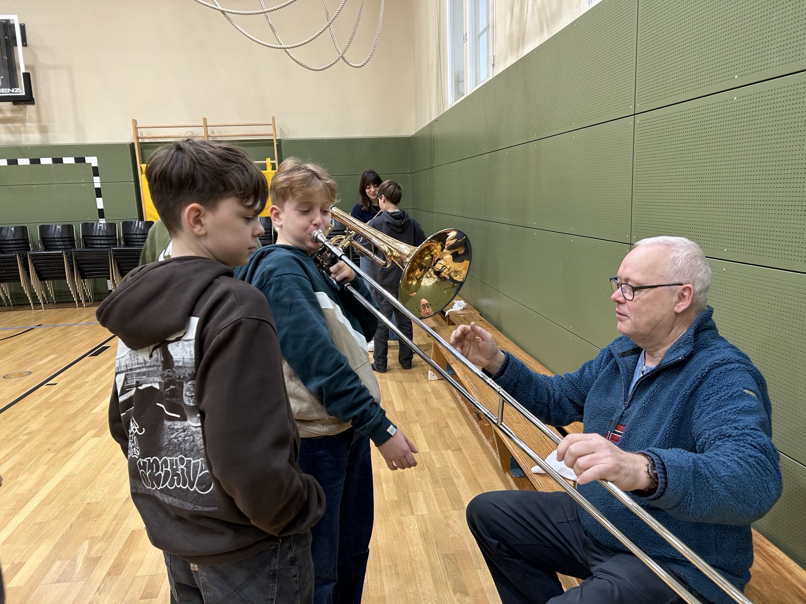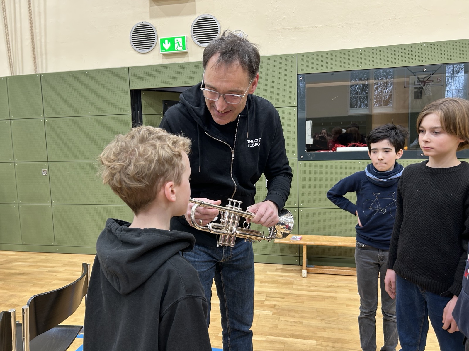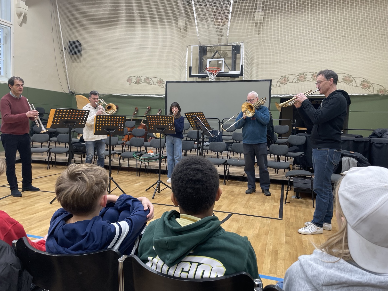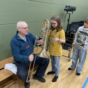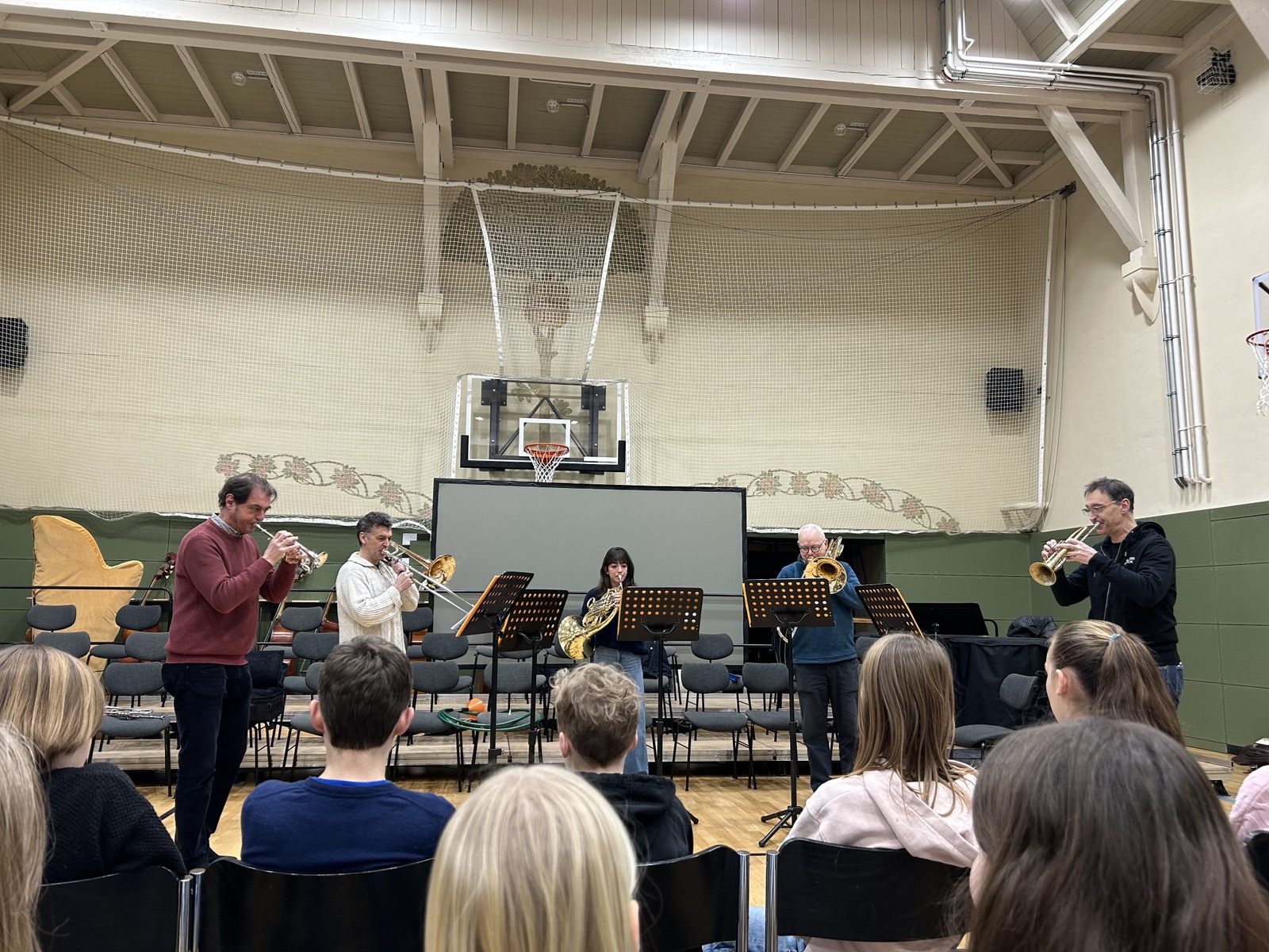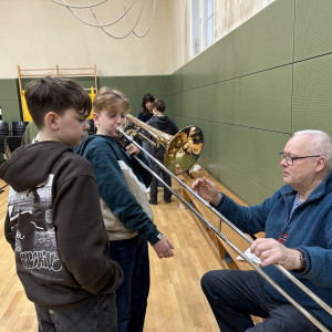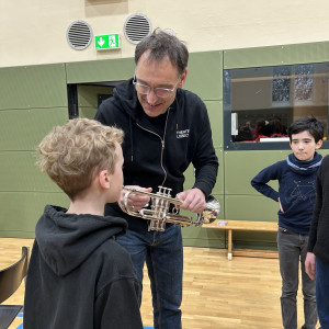 Einen besonders musikalischen Besuch durften wir als 5d und 6d in unserer kleinen Turnhalle kürzlich erleben. Ein Ensemble aus Blechblasinstrumenten vom Theater Lübeck stellte ihre Instrumente vor und gab uns ein kleines Konzert. Mit viel Begeisterung und Geduld erzählten die Musiker:innen vieles über die Spielweise und Tonerzeugung ihrer Instrumente (Trompete, Horn, Posaune). Wusstet ihr, dass ein Horn auseinandergerollt 3-4 Meter lang ist?