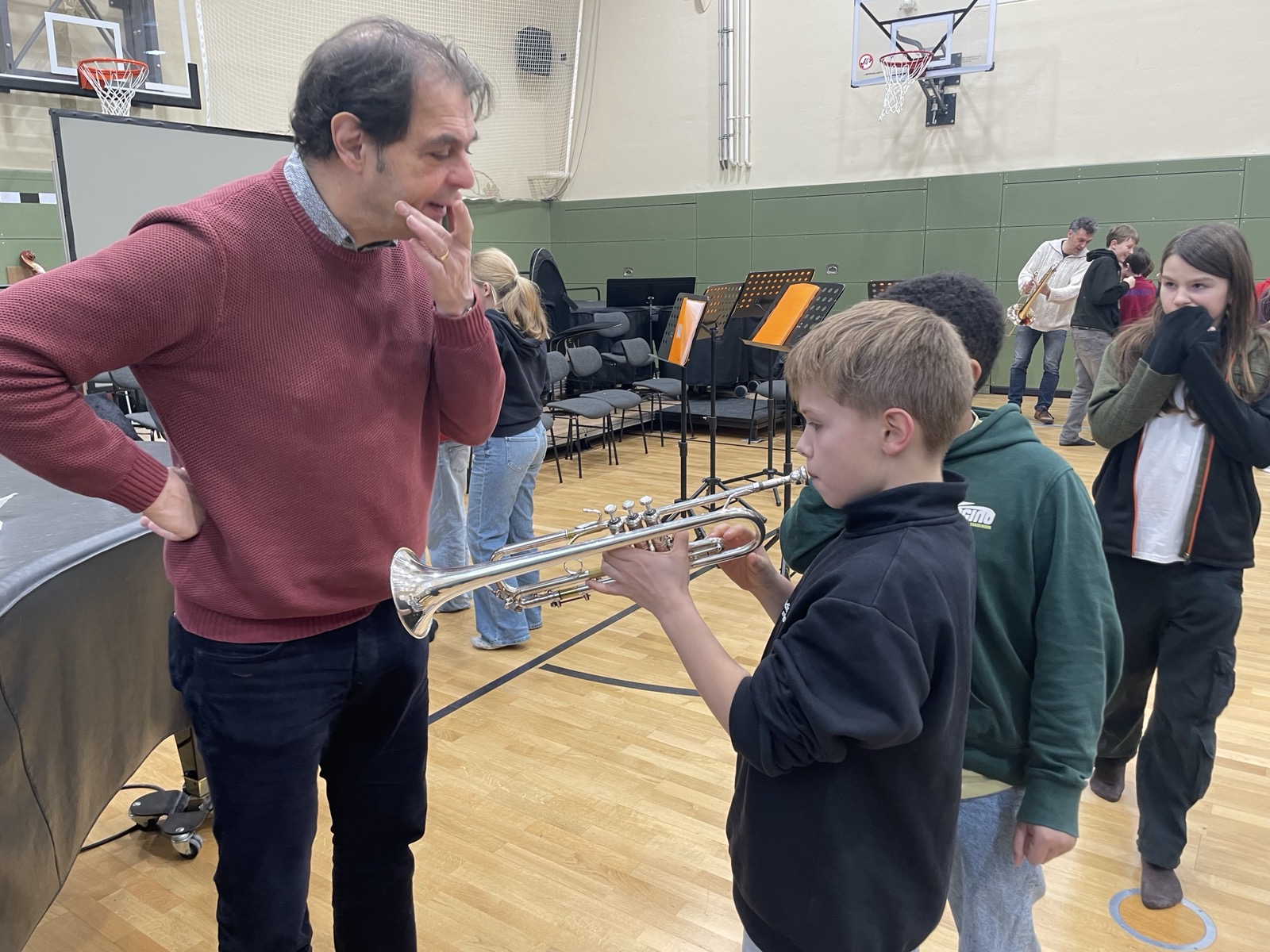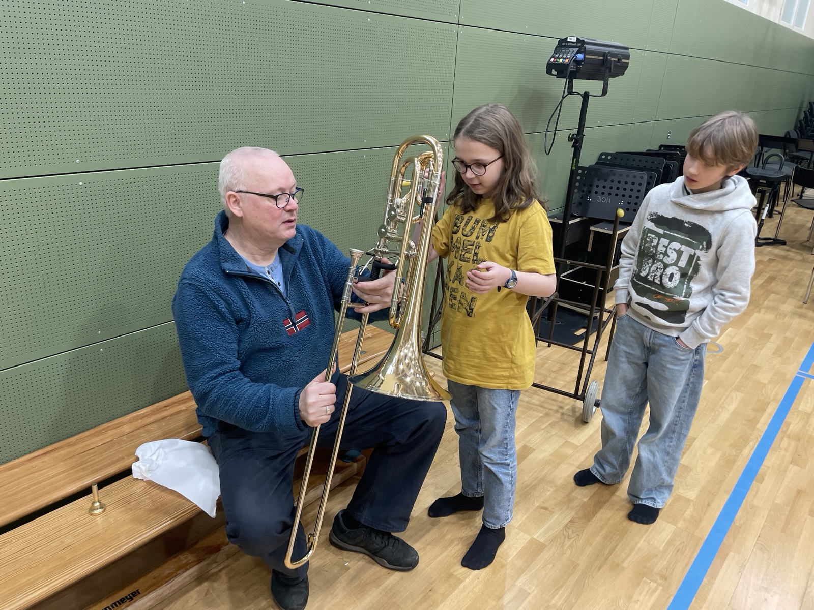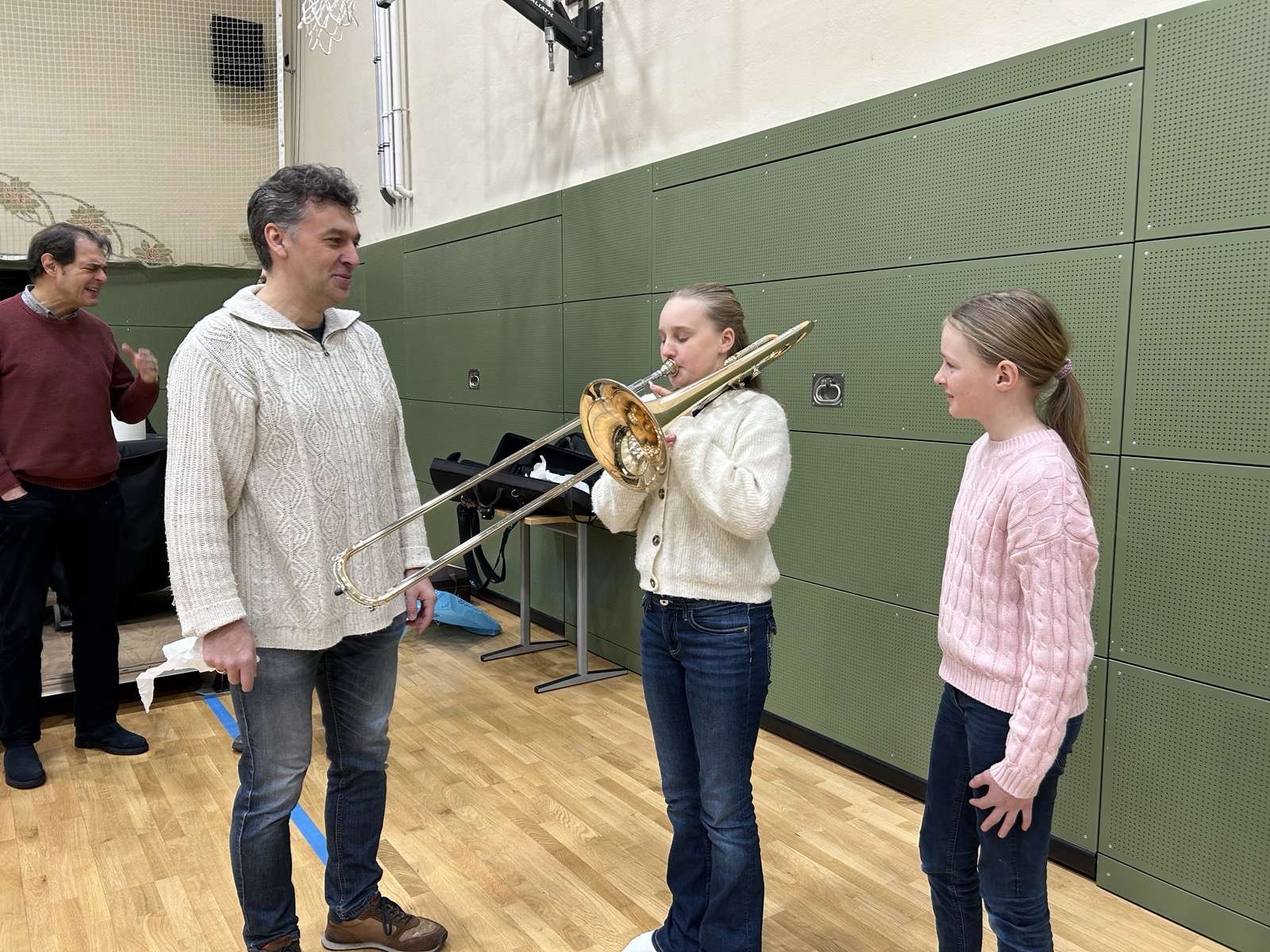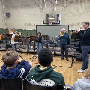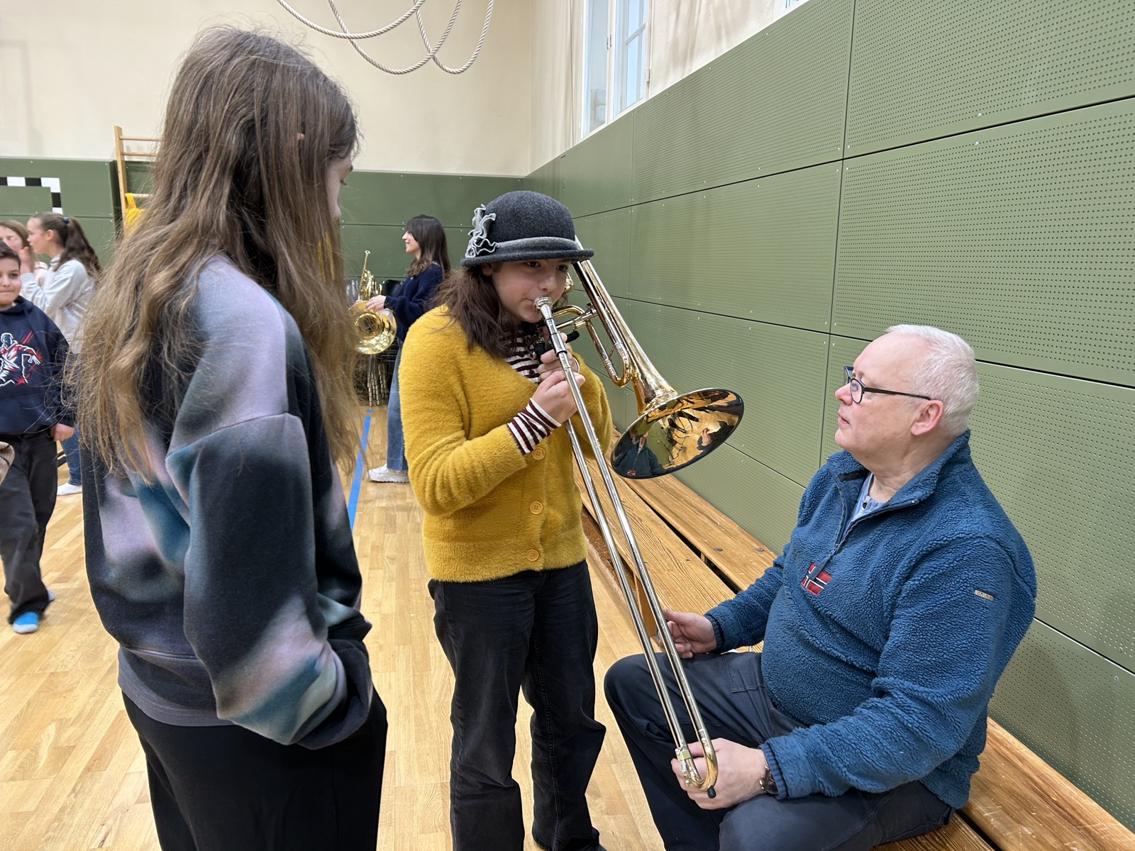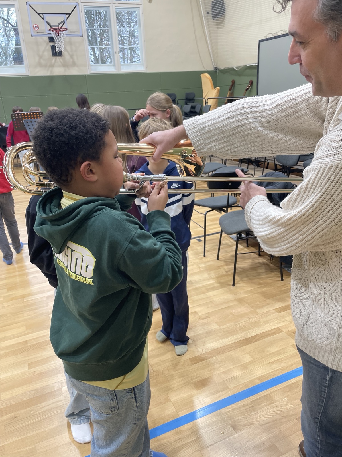 Einen besonders musikalischen Besuch durften wir als 5d und 6d in unserer kleinen Turnhalle kürzlich erleben. Ein Ensemble aus Blechblasinstrumenten vom Theater Lübeck stellte ihre Instrumente vor und gab uns ein kleines Konzert. Mit viel Begeisterung und Geduld erzählten die Musiker:innen vieles über die Spielweise und Tonerzeugung ihrer Instrumente (Trompete, Horn, Posaune). Wusstet ihr, dass ein Horn auseinandergerollt 3-4 Meter lang ist?