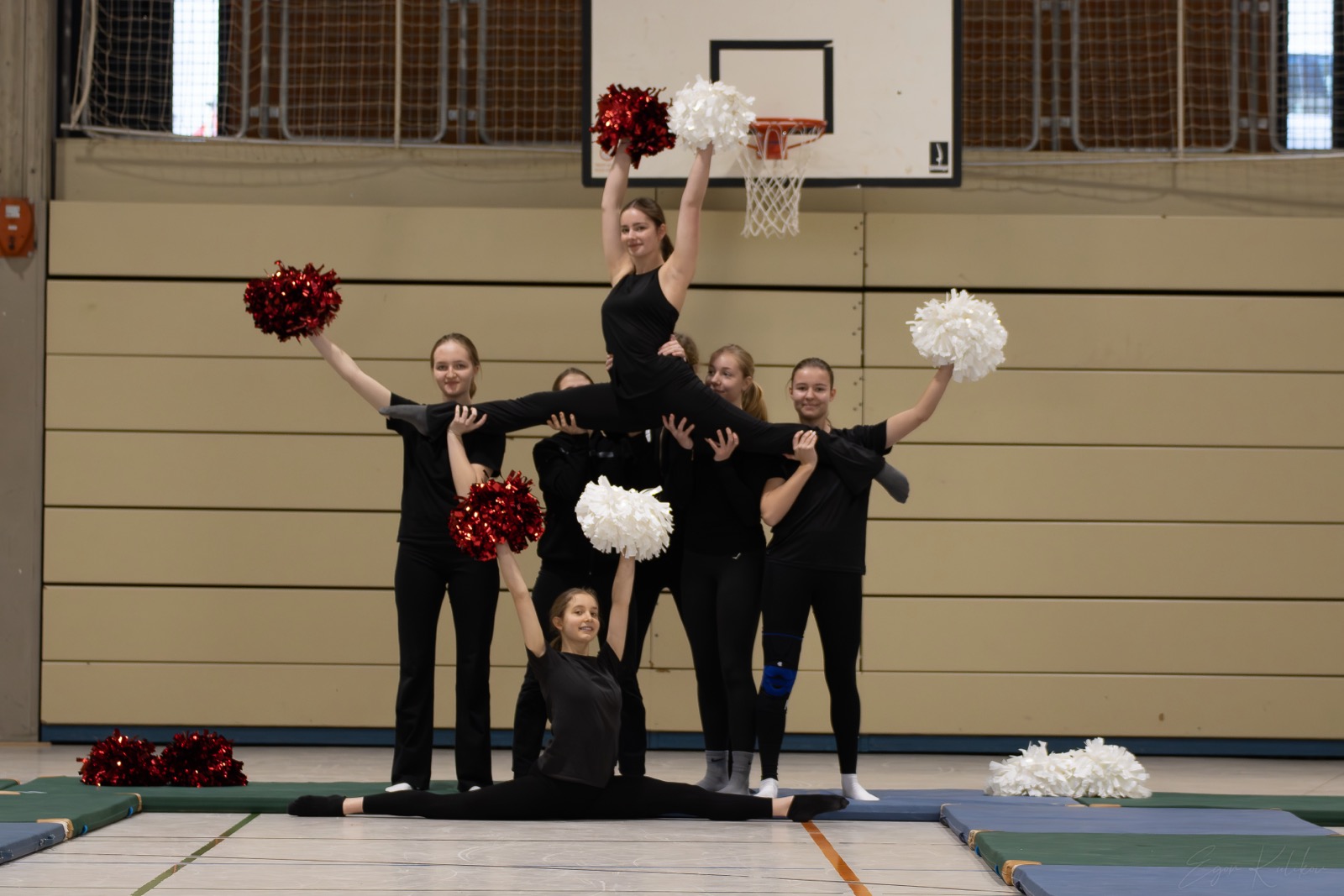 Zusammen mit Frau Sirocko haben wir uns erstmal die verschieden Bestandteile des Cheerleadings (also Motions,Tumblings, etc.) angeschaut und selbst ausprobiert. Toll war, dass wir alle einmal alles ausprobieren durften, bei der finalen Choreo aber jede:r nur das gemacht hat, was er:sie am besten kann und gerne machen wollte. Am Ende haben wir dann selbst zu dem Lied „Golden“ aus K-Pop Demon Hunters eine Choreo getanzt und geturnt. Ein paar Fotos davon könnt ihr auch hier sehen.