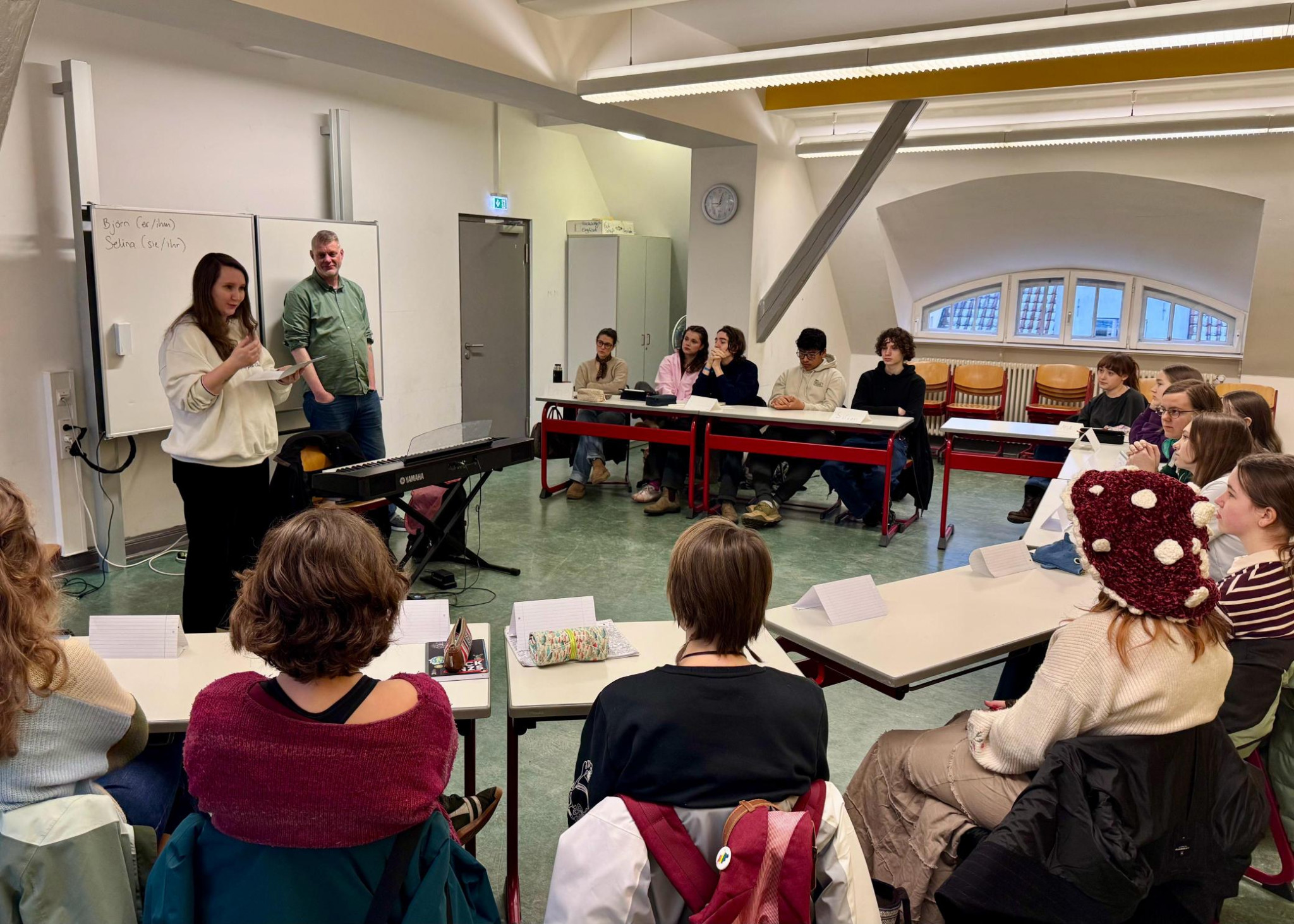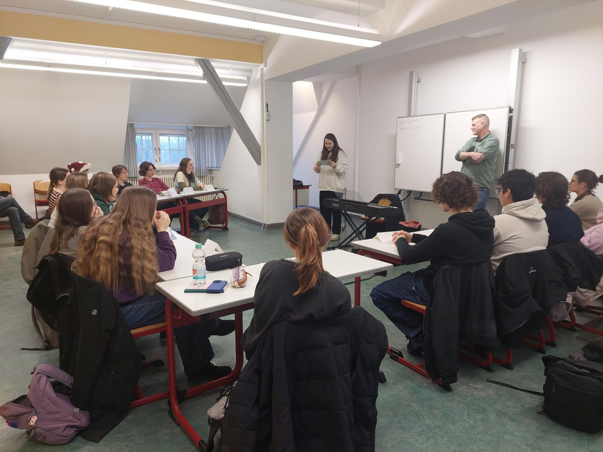 Am 6. und 7. Februar hatten wieder interessierte Schüler:innen von Klasse 10-Q2 die Möglichkeit, sich angeleitet von Profi-Slammer:innen beim Schreiben von Slam-Texten auszuprobieren. Dieses Jahr kamen für diesen Workshop Selina Seemann und Björn Högsdal aus Kiel angereist, um zunächst eigene Texte vorzustellen, typische Merkmale von Poetry Slam zu erarbeiten und dann das eigene Schreiben anzuregen und diesen Schreibprozess zu begleiten. So ist mindestens einer der beiden Texte entstanden, den die Schüler:innen dann beim Schulslam am 10. März um 19:00 Uhr in der Mensa der Hüxschule präsentieren, in der Hoffnung, dank Publikumsjury-Bepunktung nochmal im Finale an dem Abend ihren zweiten Text ins Rennen zu schicken. Denn die zwei Gewinner:innen des Abends starten dann bei der großen Lübecker Schulslam-Meisterschaft so richtig durch.