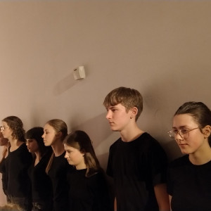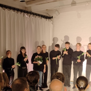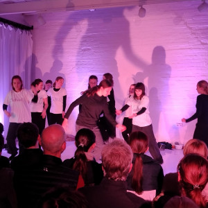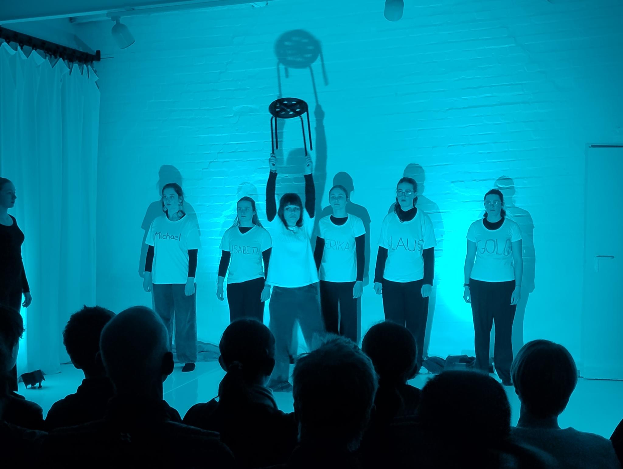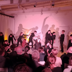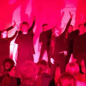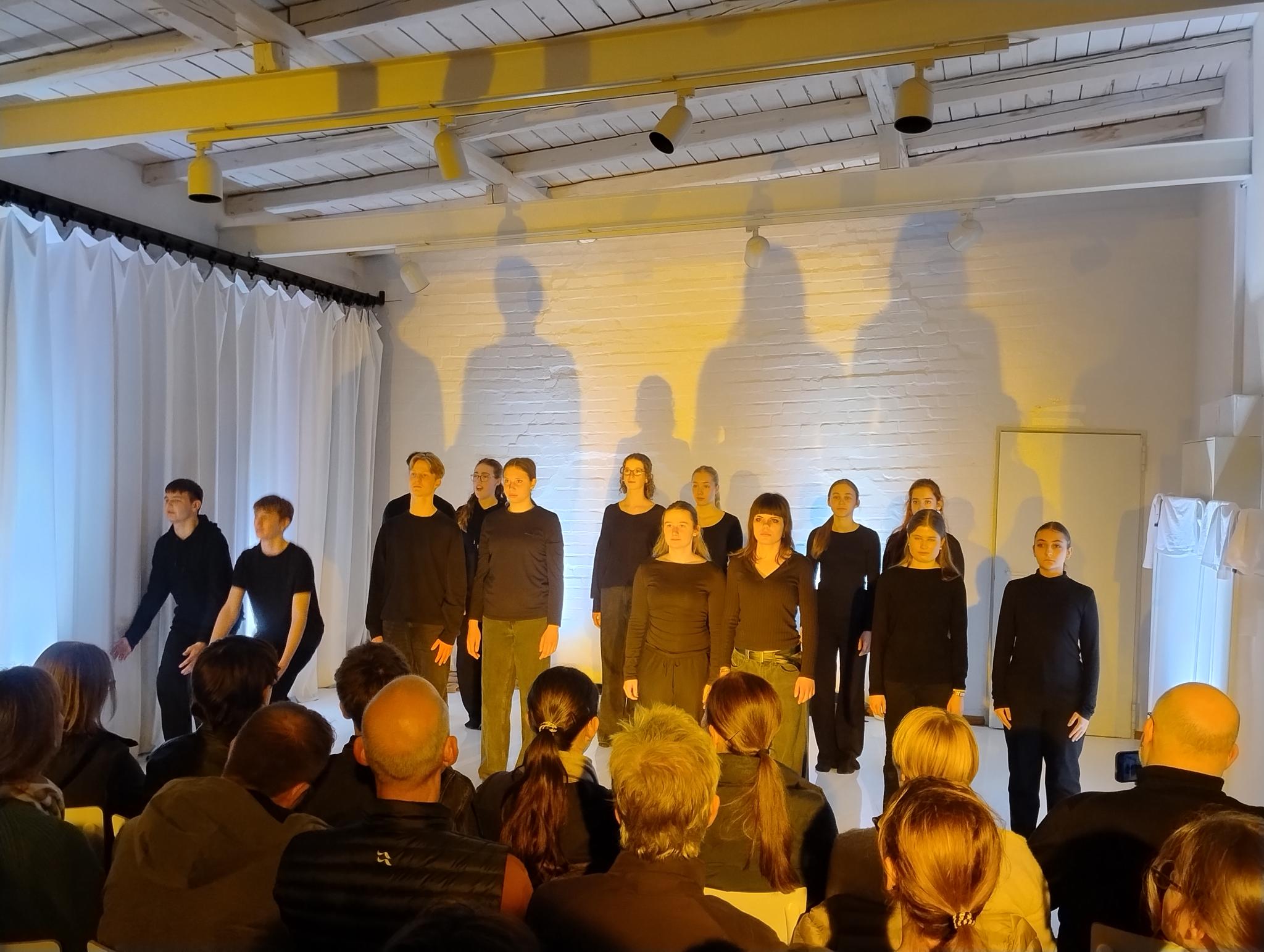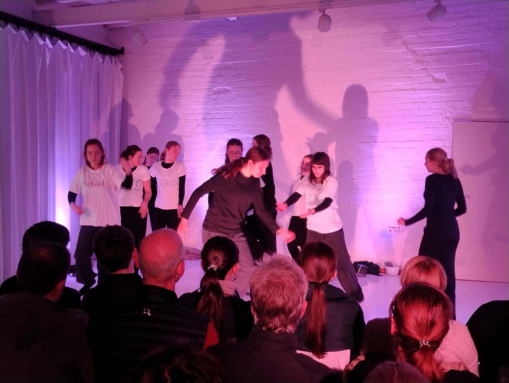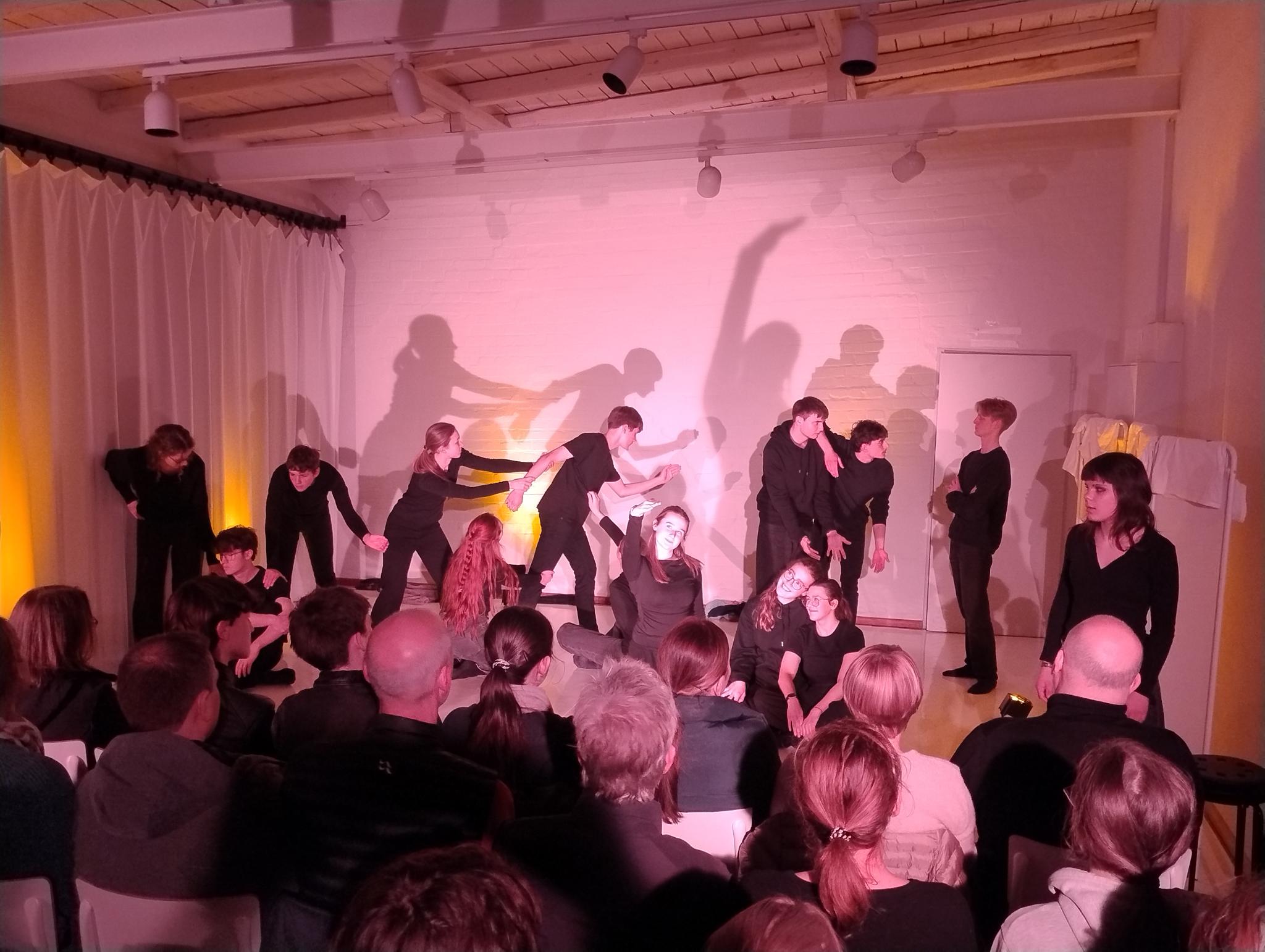 Die Außenstelle des Lübecker Theaters an der Kanalstraße war ganz genau bis auf den letzten Platz gefüllt, als die 17 Schüler:innen des DSP-Kurses, technisch unterstützt von Frederik Adler, Q1e, in selbstenwickelten Szenen die unterschiedlichsten Facetten des Themas „Familie“ ausleuchteten. Im Wechsel von O-Tönen aus dem Off, in denen neben den Jugendlichen offensichtlich auch Eltern und Großeltern zu Wort kamen, Szenen in kleiner Besetzung und der gesamten Gruppe auf der Bühne, erlebte das Publikum absolut unterschiedliche Stimmungen.