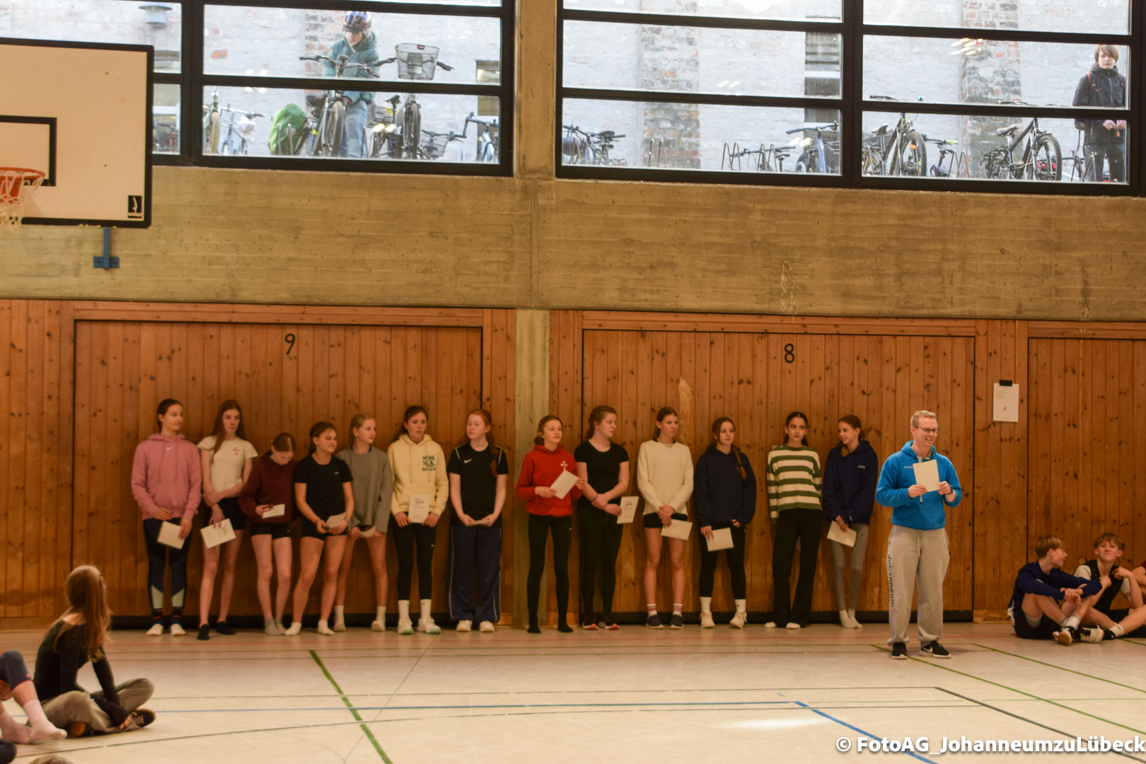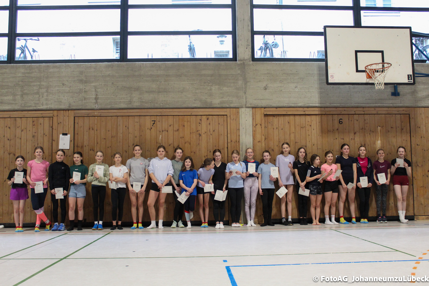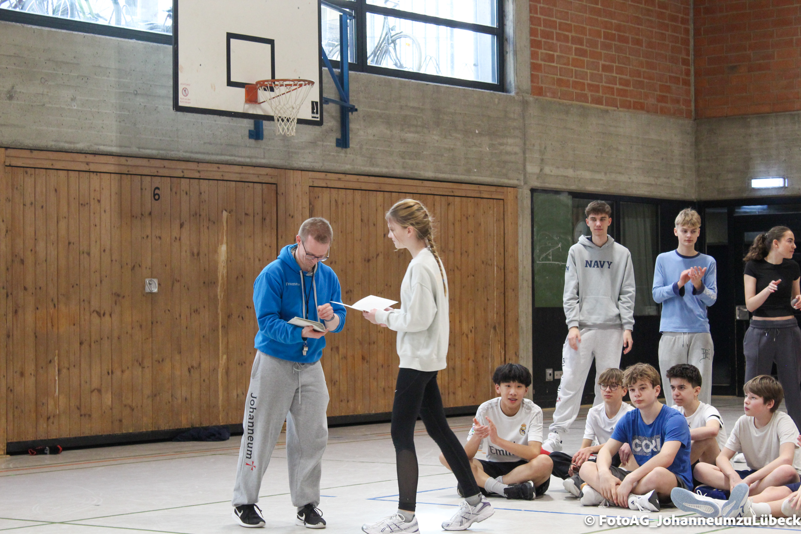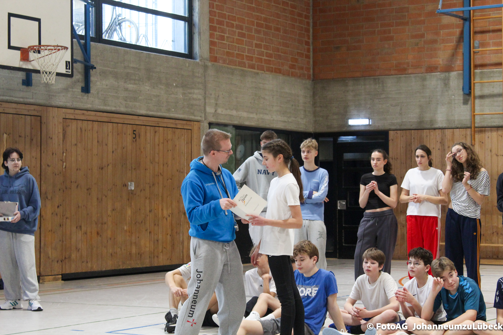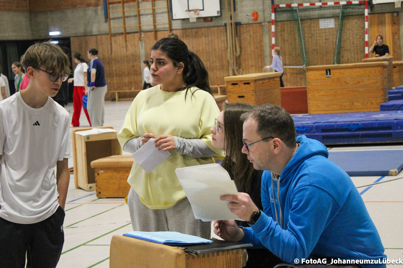 Nach vielen geschlagenen Rädern, Handständen und Vorwärtsrollen war es endlich soweit und unsere Darbietungen wurden ausgewertet. Um uns die Zeit zu vertreiben, bis die Ehrenurkunden verteilt wurden, baten die Riegenführer:innen uns spaßige Pausenspiele an, die mit Freude angenommen worden sind.