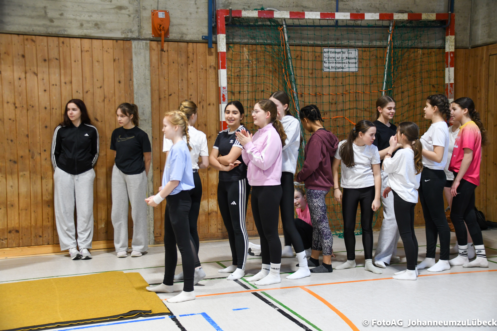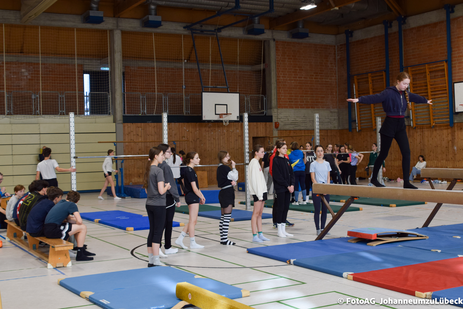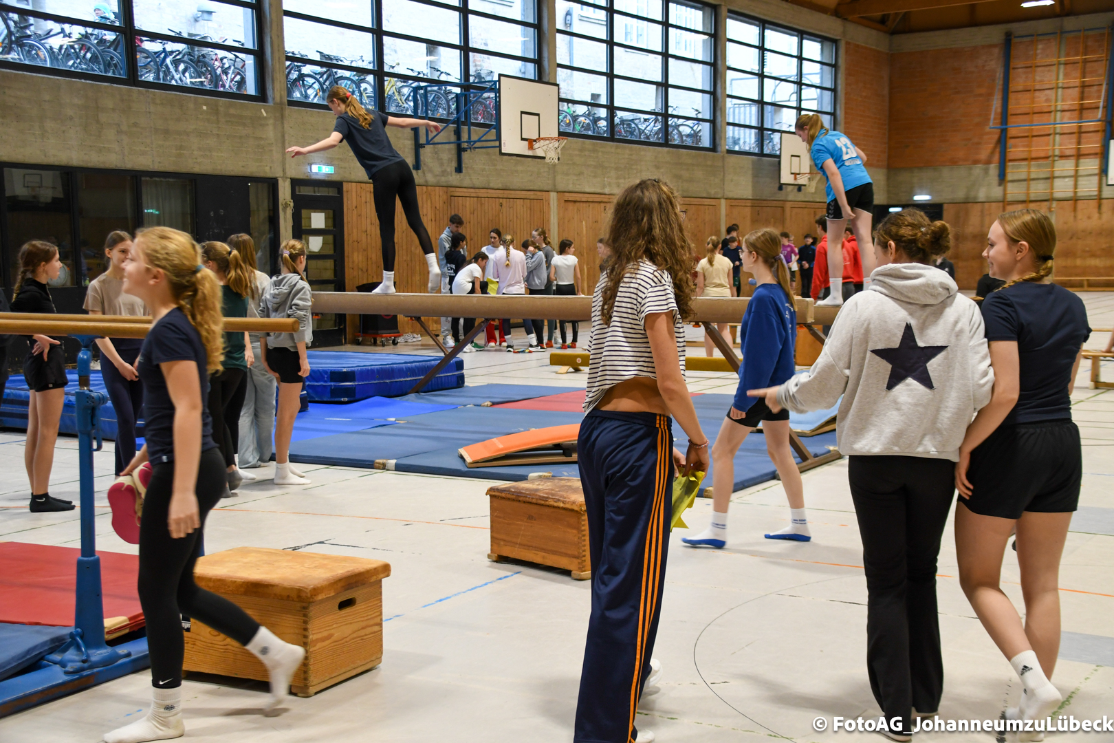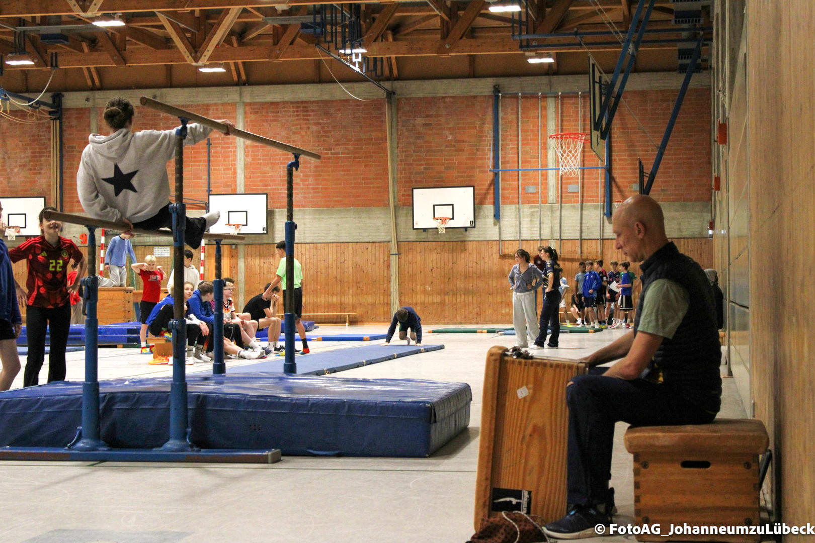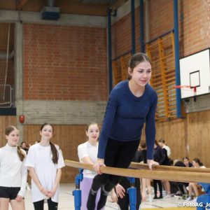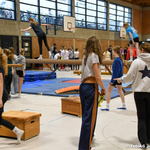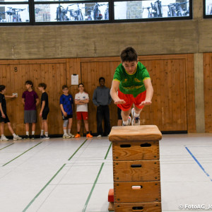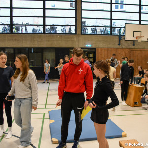 Gestartet hat alles mit einer Ansprache von Herrn Fromme, bevor wir klassenweise mit unseren Riegenführer:innen von Station zu Station geführt wurden. Nach dem jeweiligen Einturnen konnten wir dann den Lehrkräften vorführen, was wir zuvor in unseren Unterrichtsstunden geübt hatten.