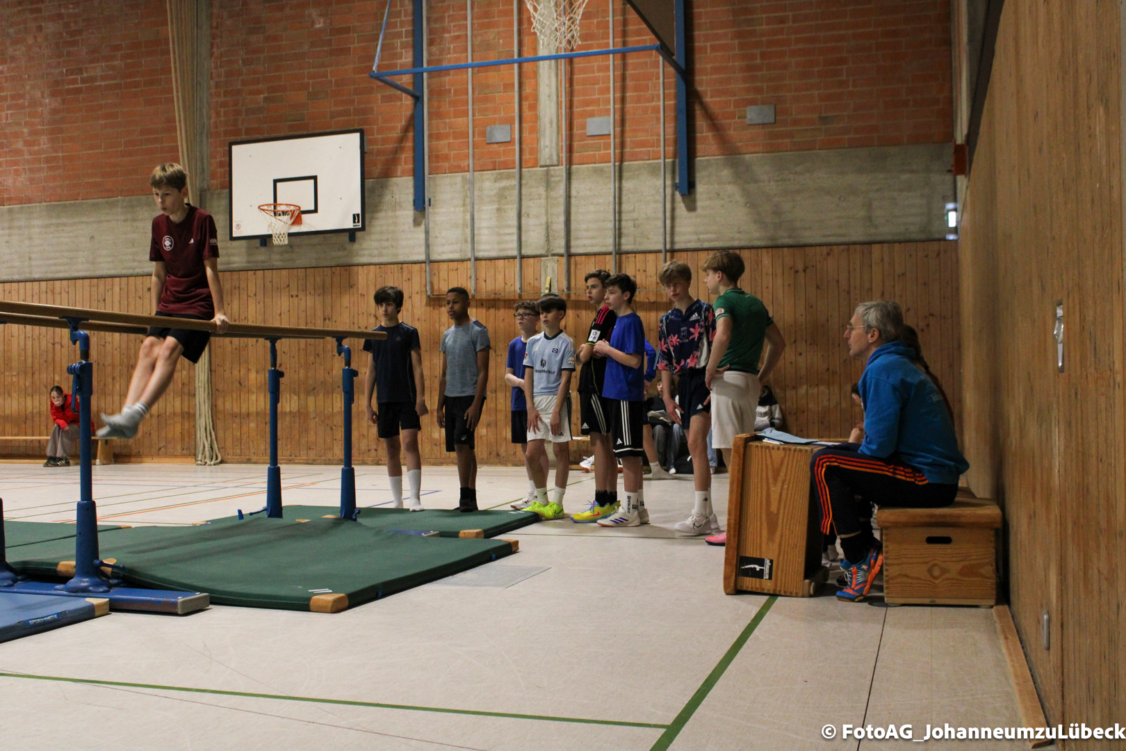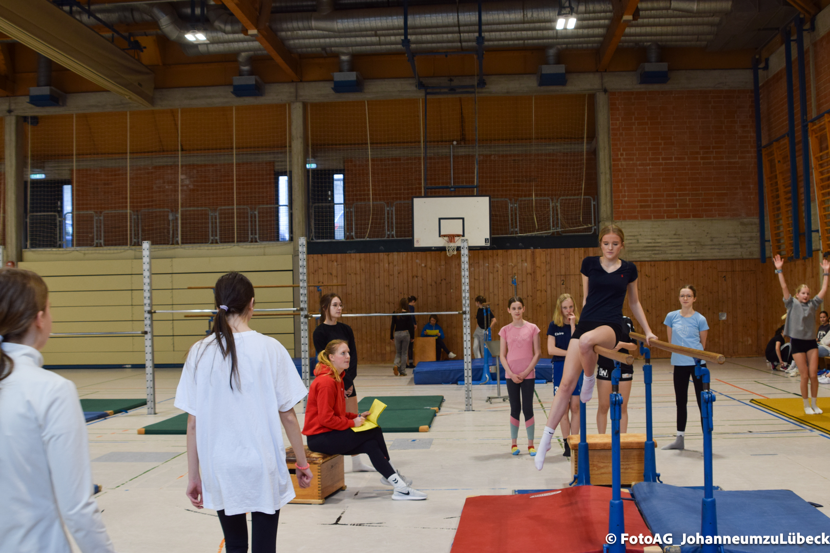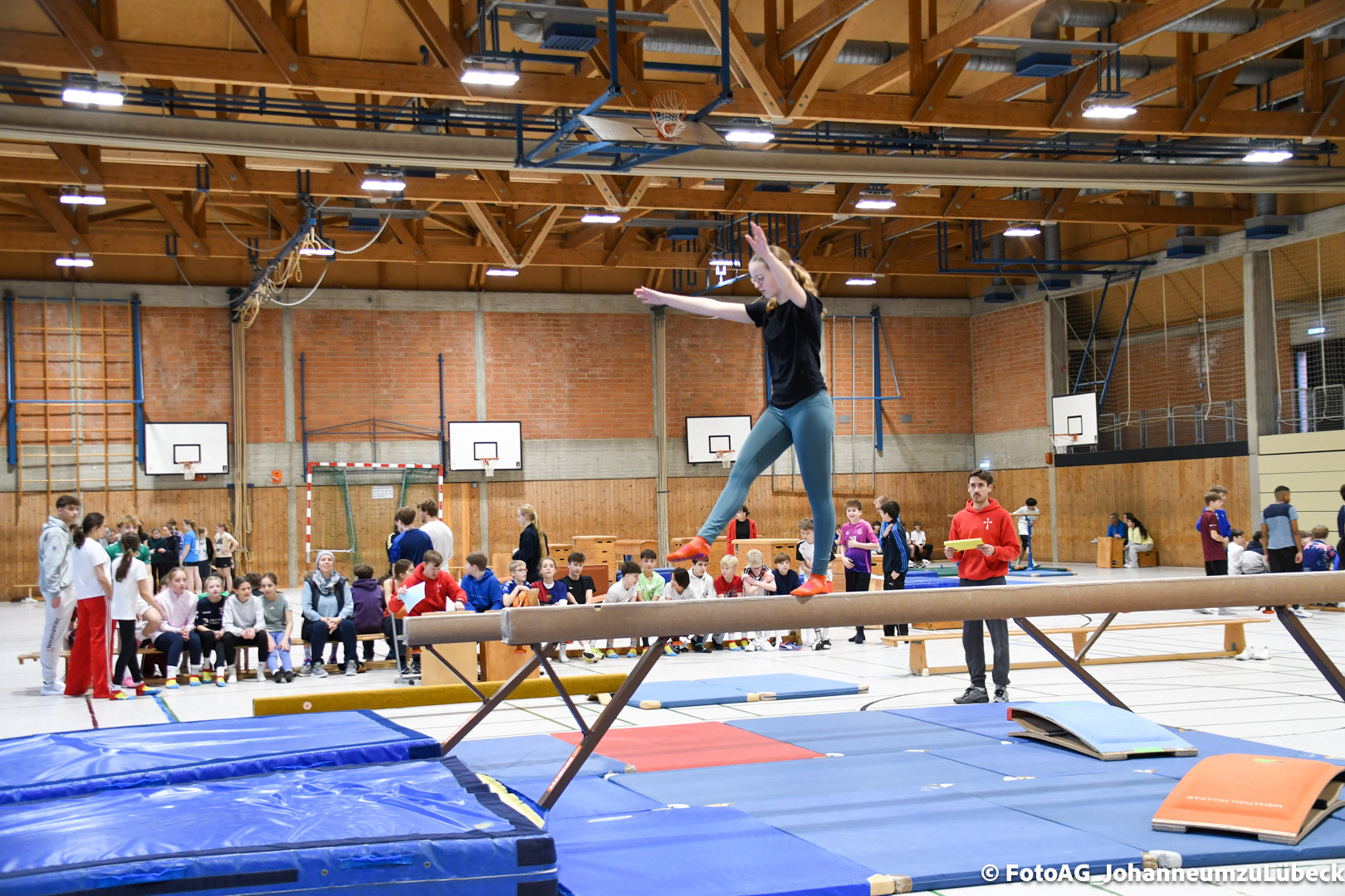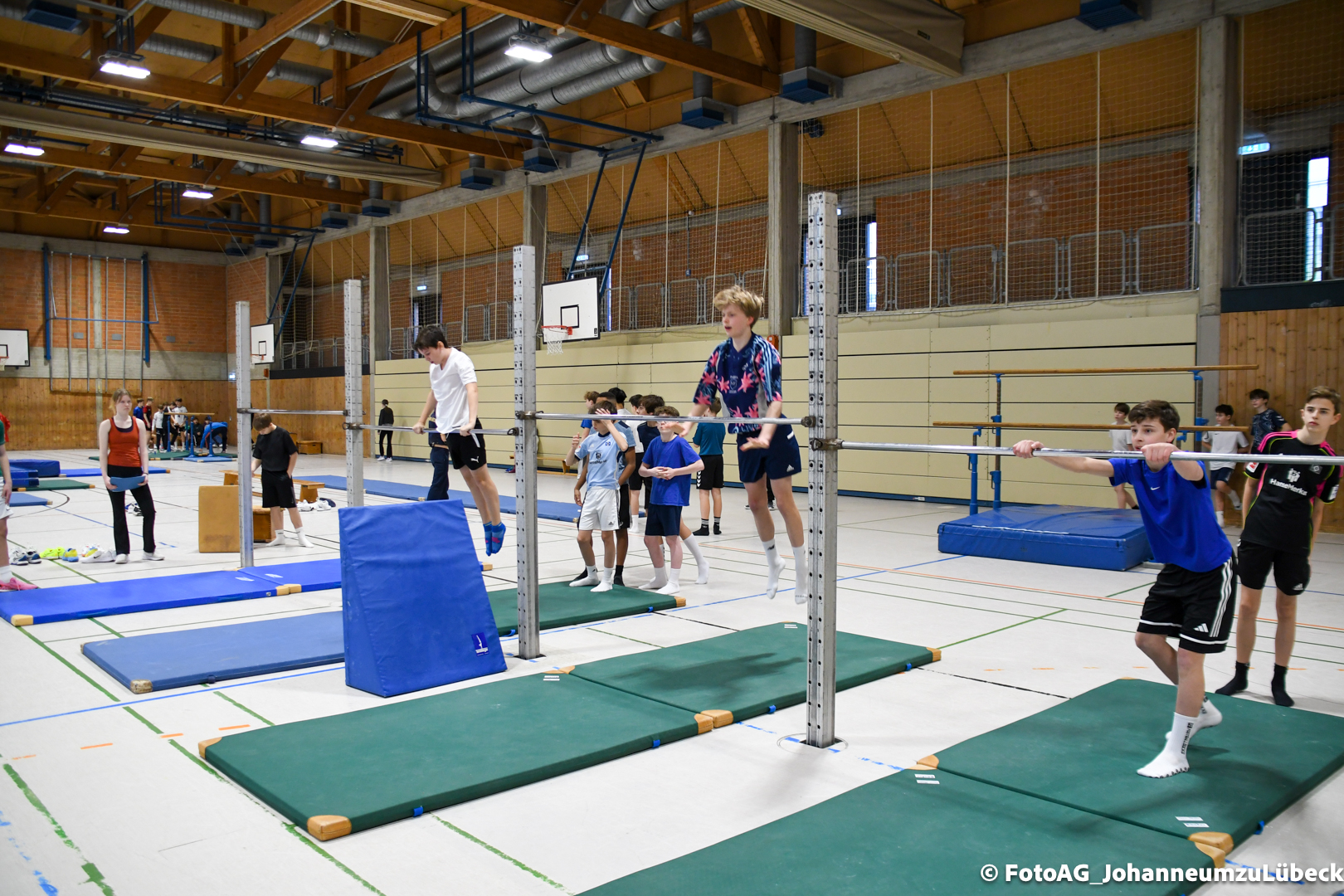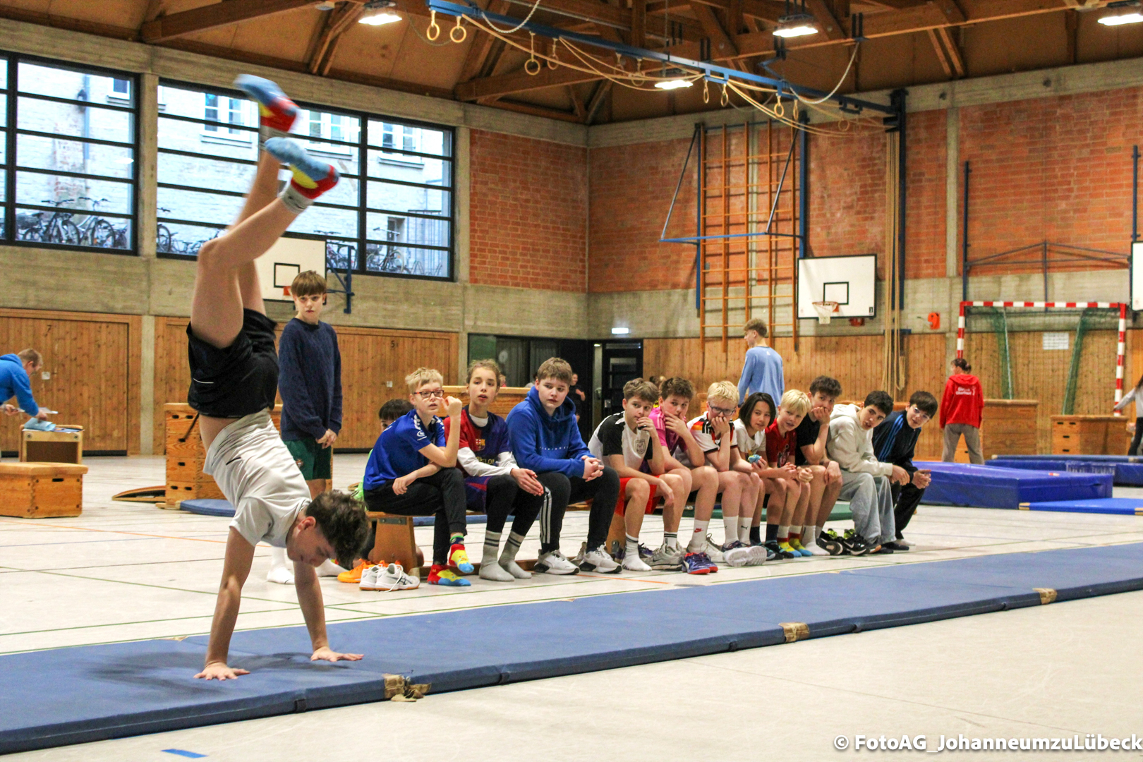 Gestartet hat alles mit einer Ansprache von Herrn Fromme, bevor wir klassenweise mit unseren Riegenführer:innen von Station zu Station geführt wurden. Nach dem jeweiligen Einturnen konnten wir dann den Lehrkräften vorführen, was wir zuvor in unseren Unterrichtsstunden geübt hatten.