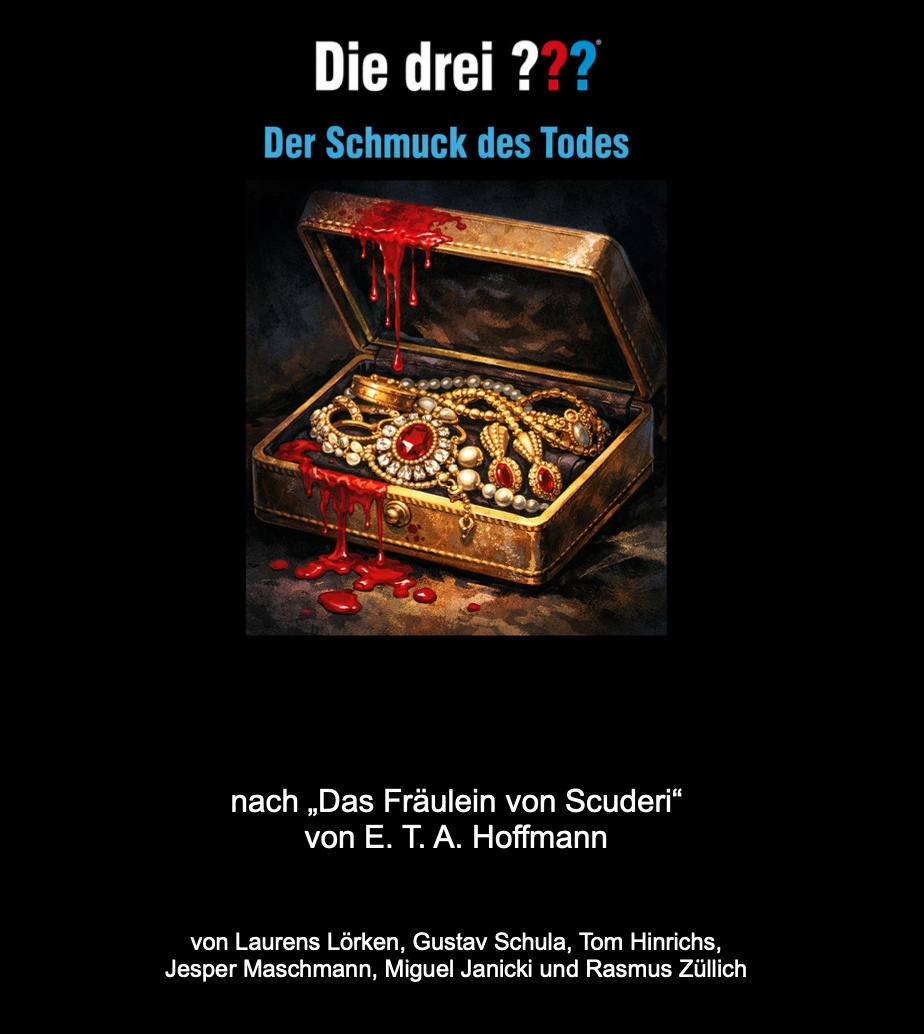 Wenige Wochen zuvor hatte die Klasse bereits im Rahmen des Deutschunterrichts ,,Das Fräulein von Scuderi‘‘ von E.T.A. Hoffmann gelesen. Die anschließende Aufgabe war, die Geschichte im Stil eines modernen Detektivhörspiels aus unserer Kindheit zu erzählen. Zu viert bis siebt beugten sich also alle über die kleinen gelben Reclam-Hefte. Die einen versuchten, die damalige Sprache in eine moderne umzuformulieren, die anderen ließen Charaktere wie Justus Jonas, Anne oder George klingen, als kämen sie gerade aus dem 17. Jahrhundert. Skripte wurden getippt, Rollen verteilt, Sätze geübt, Geräusche rausgesucht.