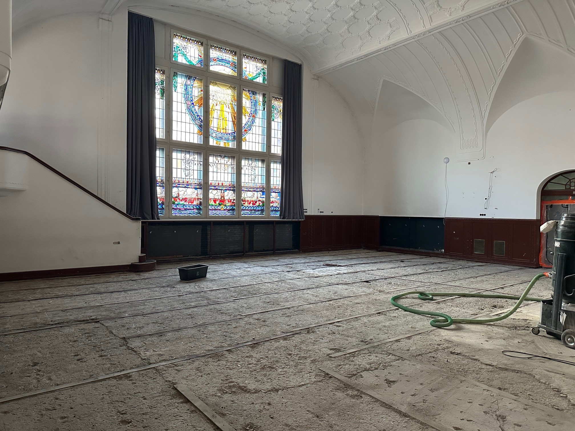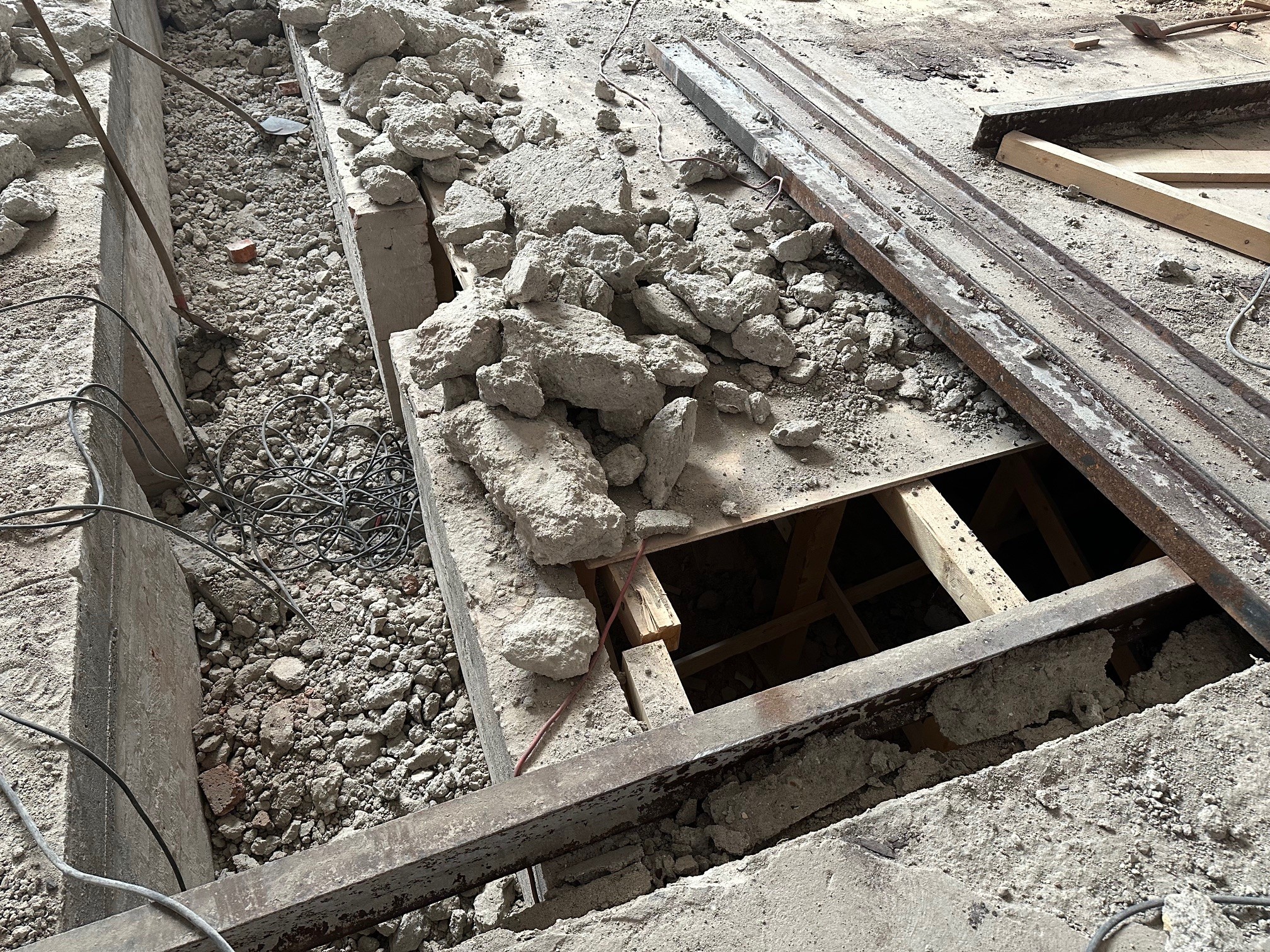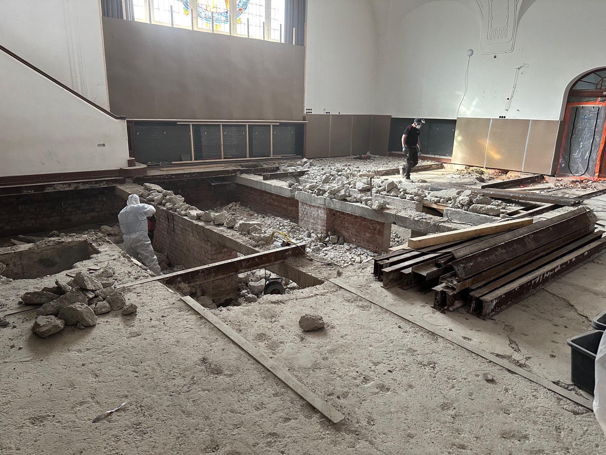Richtig zur Sache geht es aktuell in der Aula. Der Fußboden ist leider schon seit einigen Jahren nicht mehr richtig tragfähig und wurde von unten mit einer Holzkontruktion abgestützt. Auch der Aulaboden wird jetzt ganz neu gemacht. Vorher muss aber der alte Fußboden raus und das ist schon zu einem großen Teil geschehen, wie man auf den folgenden Bildern sehen kann.