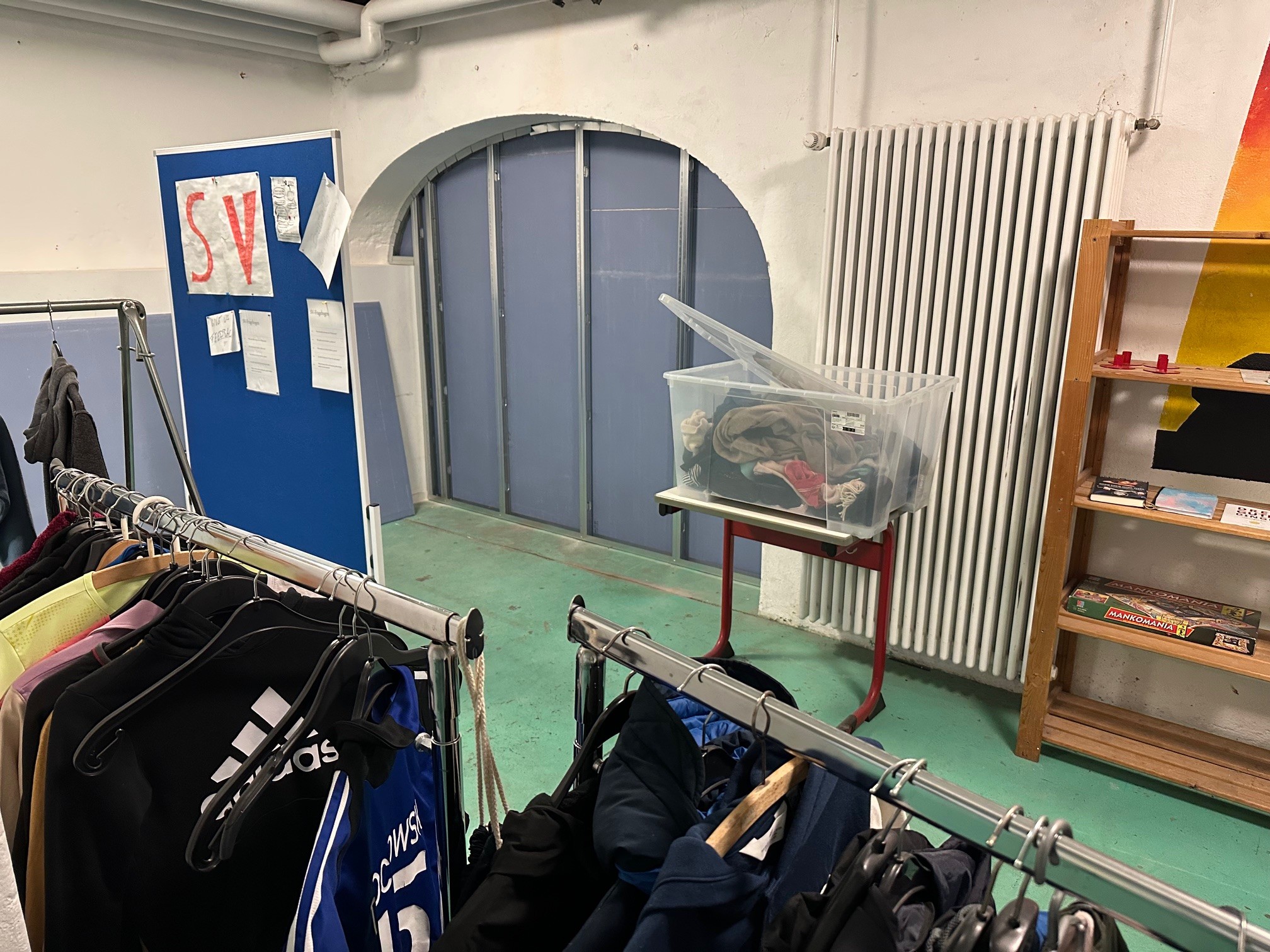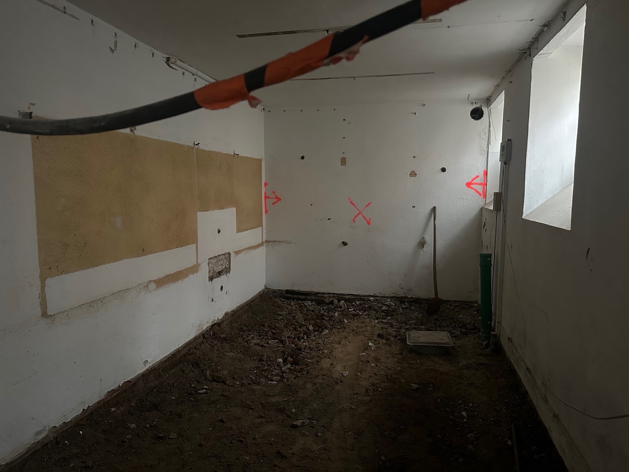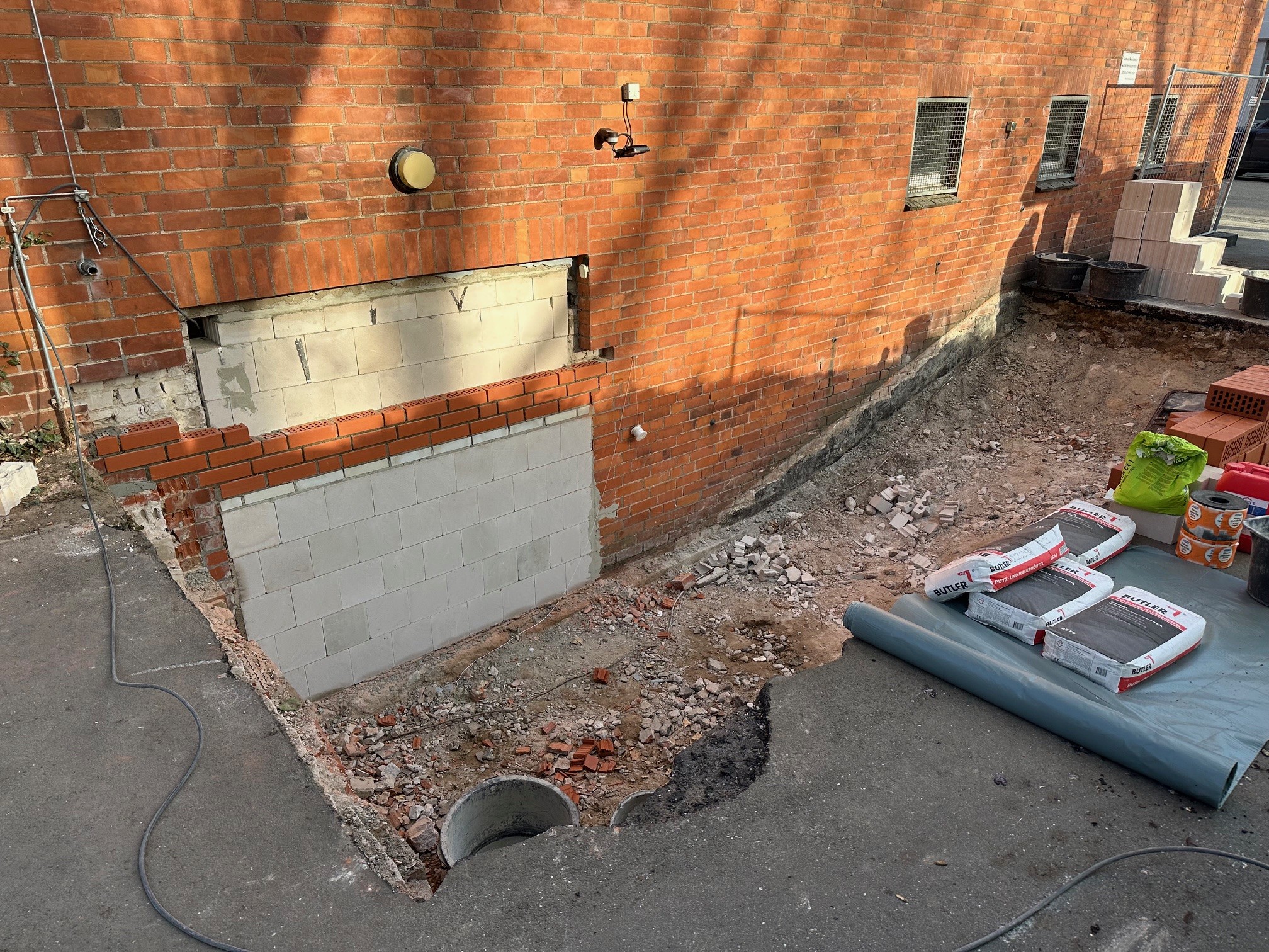 Hinter dem Anbau an das Hauptgebäude, dort wo die Mülltonnen stehen, entsteht eine neue Feuerwehrzufahrt, weil die neueren Feuerwehrfahrzeuge nicht mehr durch die Einfahrt zwischen großer Sporthalle und Feuerwache passen. Dafür müssen der Kellereingang und die Boulderwand weichen. Eine neue Boulderwand bekommen wir auf der anderen Seite der kleinen Sporthalle, wo jetzt der Bücherschrank steht. In dem Kellerraum, der zur Zeit noch als Abstellraum genutzt wird, entsteht in den nächsten Jahren ein neuer Dsp-Raum.
