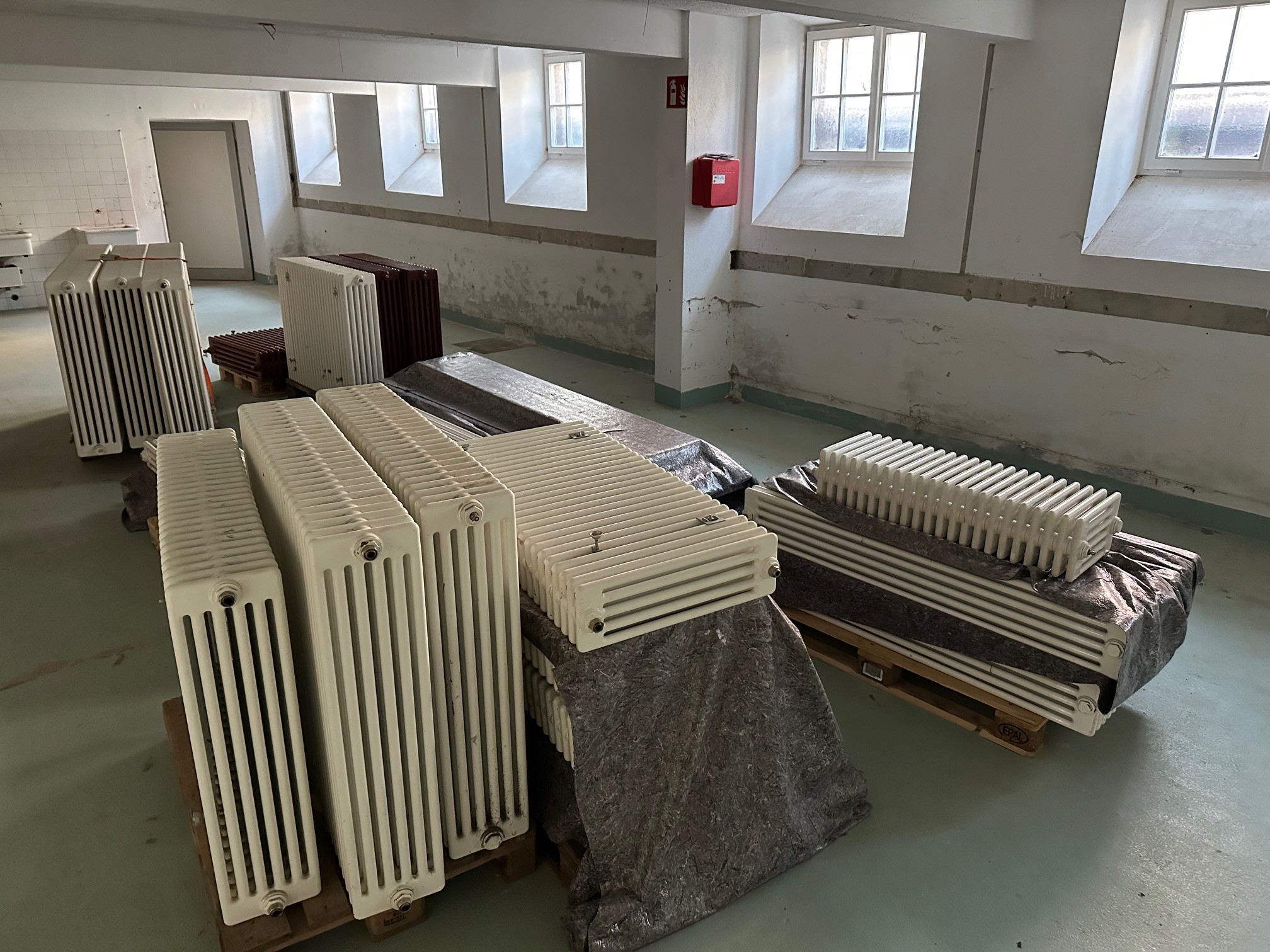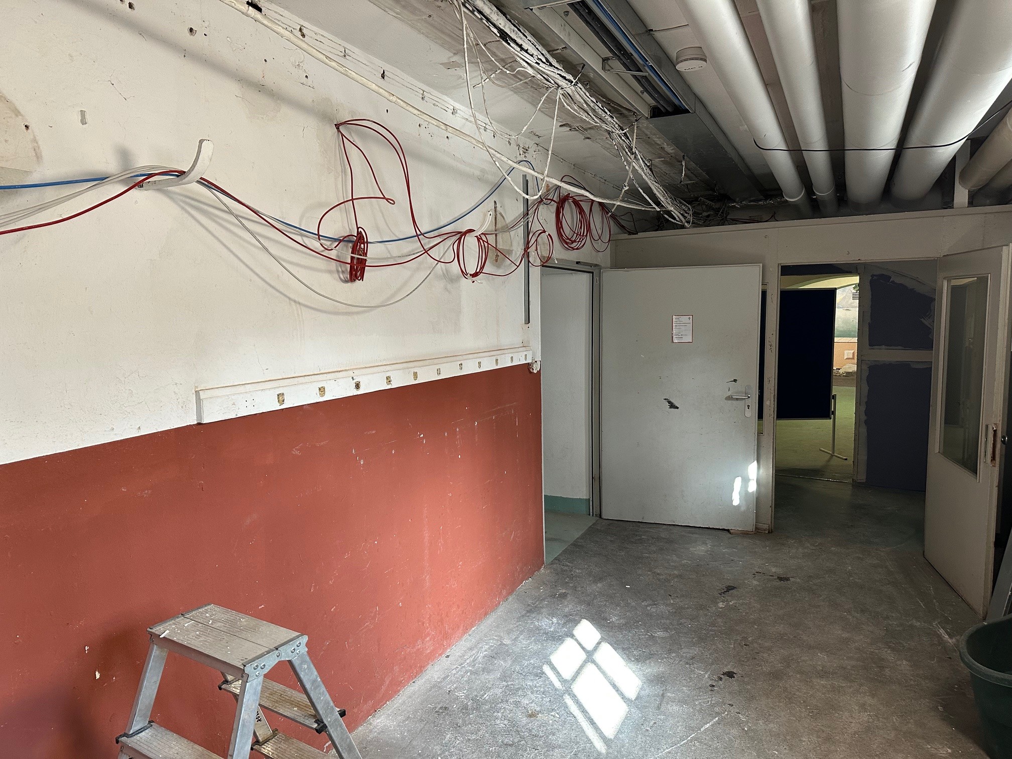 Im Aulatrakt wurden die gesamte Elektrik und die Heizungen zurückgebaut. Es gibt nur noch provisorisch Licht und Strom. Die Heizkörper lagern alle im Werkraum 1 und werden gereinigt und wieder eingebaut, wenn der Rest fertig ist. Das Strom- und Datennetz werden genauso wie eine Belüftungsanlage komplett neu eingebaut. Zum Aulafoyer — wo bislang der Abstellraum hinter der Studio-Bühne war — werden ein Treppenhaus und ein Fahrstuhl eingebaut.